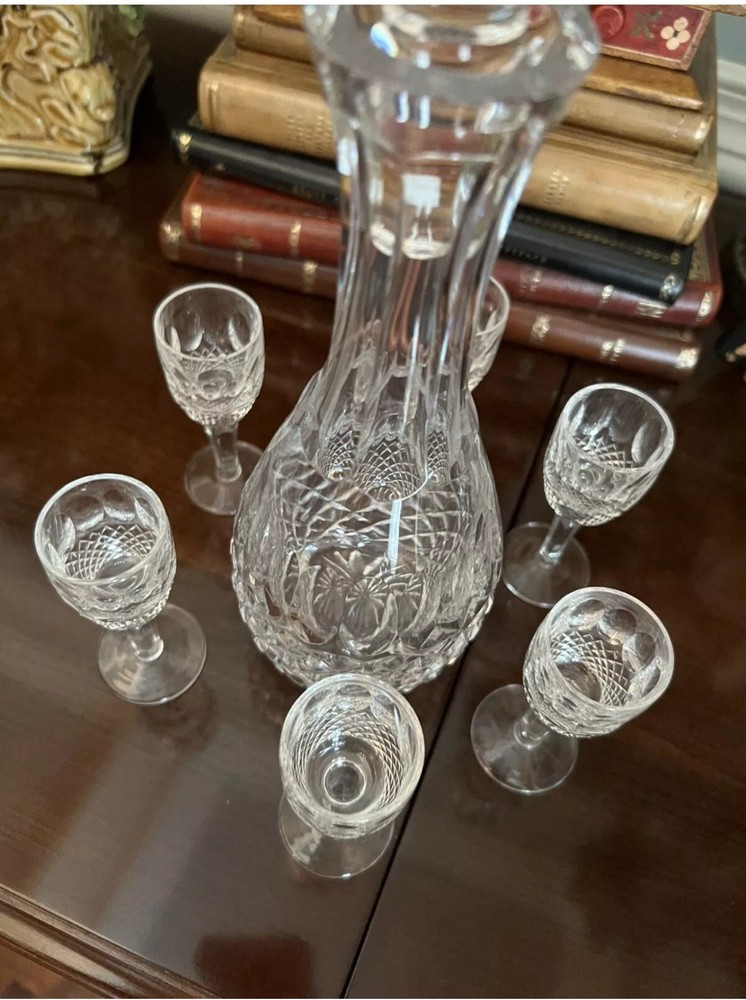 Elevate your barware collection with this exquisite Waterford crystal decanter, accompanied by six tall stem cordial glasses. Each piece showcases the timeless elegance and superior craftsmanship associated with the Waterford brand, crafted in Ireland from the finest crystal. The set’s vintage charm is undeniable, making it a sophisticated addition to any gathering or display.