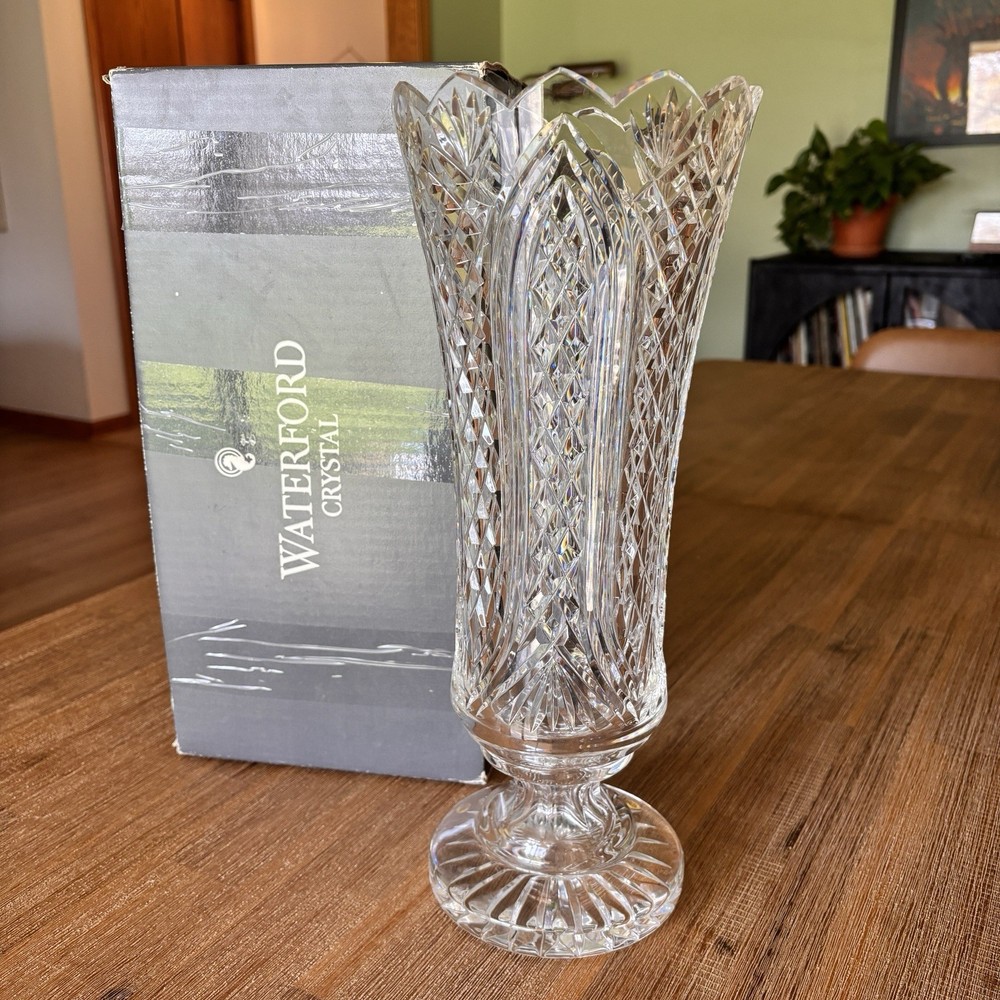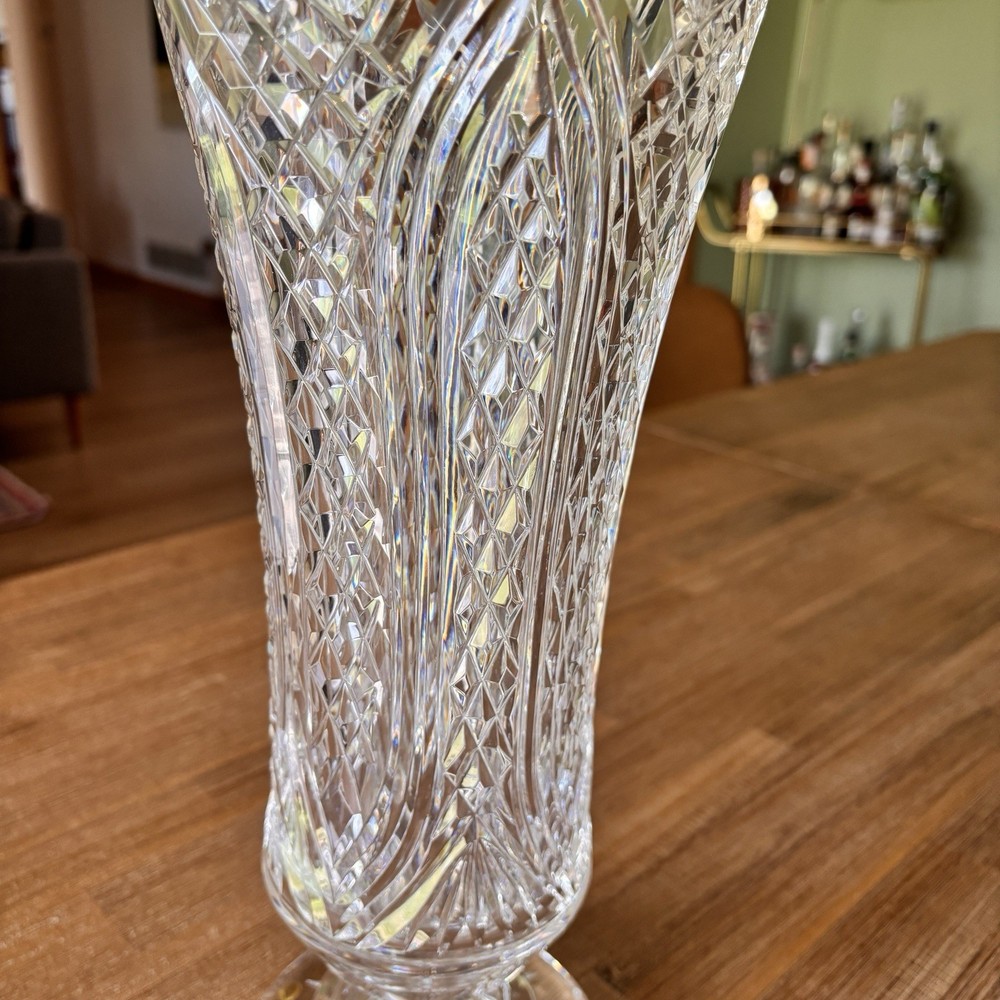 This Waterford Crystal Cutters Special 14" Rare Vase is a stunning piece of art made in Ireland. The vase features a diamond pattern, has the Waterford stamp on the base of the vase, as well as an engraved Waterford signature. Vase base has some very minor wear consistent with use. See photos and please reach out with any questions. Vase comes in original box. Box has tape on it and a picture of the vase taped to it as well. Box has wear.