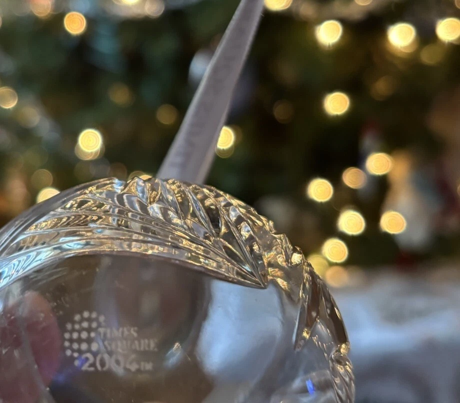 Waterford Crystal 2004 Times Square ornament. The clear glass ornament measures approximately 3” in diameter. It has the Waterford sticker, the Waterford mark on the glass, as well as the Times Square 2004 mark. The white ribbon hanger reads “Waterford Times Square” in silver color lettering. Preowned. Like new condition.