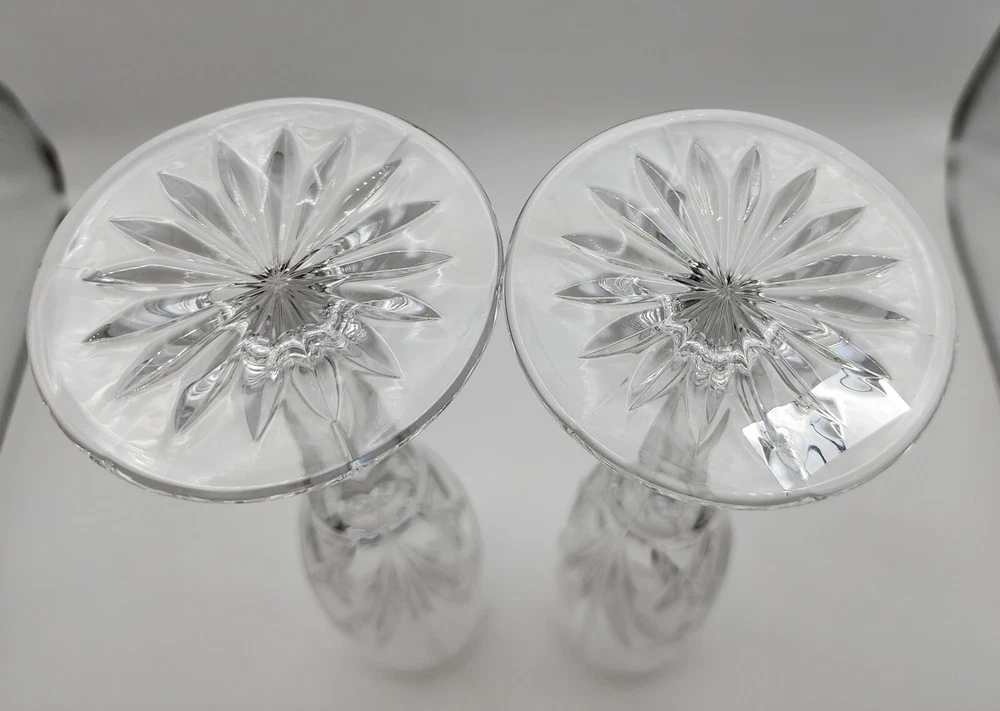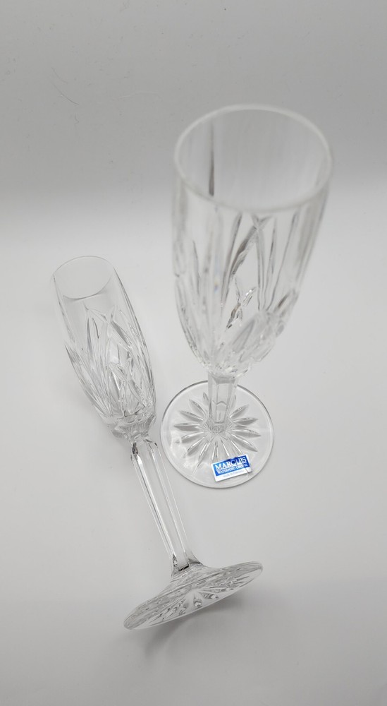 2 Marquis By Waterford Crystal Brookside pattern 9" champagne flutes, in excellent condition. One has original sticker. The odd thing about these two is that there appears not to be a Waterford mark anywhere. I got them in a lot with other Brookside pieces (see my other listings!) But these 2 are the only ones I've seen without any marks that I can find. They show little to no signs of use, no chips or cracks. As always, don't hesitate to message me with questions.