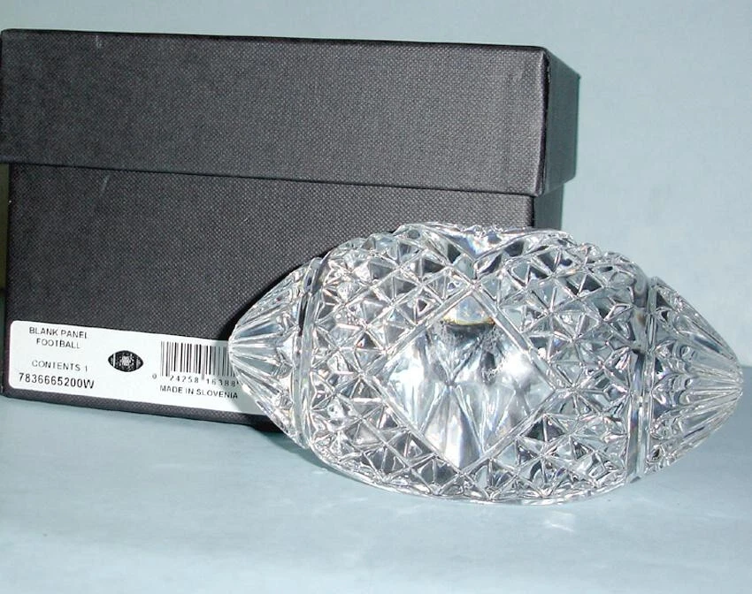 Waterford Crystal Football Paperweight With Blank Panel-for Engraving Weighty, solid clear lead crystal football meticulously sculpted and exquisitely handcrafted. Richly decorated with deep, textured crystal cuts for added brilliance and amazing sparkle. • Brand new, first quality in original Waterford gift box • Measures approx. 4.5" long x 2.5" high x 2.5" wide • The diamond-shaped blank panel is suitable for personal engraving, and so is the oval shaped flat bottom. • Find a local engraver and have it personalized for a gift, award or trophy. Note! we do not engrave! • High quality with elegant design and a flat bottom to ensure a stable display on practically any level surface • Looks great as a paperweight or decorative accent in an office or home • Item# 7836665200 • Etched with the Waterford hallmark • Made in Slovenia • The perfect gift for your favorite football fan, player, coach, sports enthusiast or fine crystal collector. --------------- Please closely examine the listing and submit any questions prior to purchase. Pictures may not reflect true colors due to various lighting conditions. Ships from a smoke-free, pet-free environment