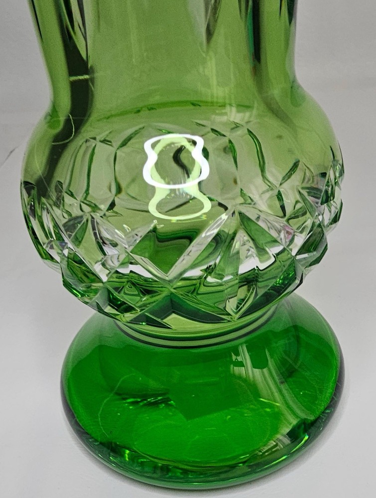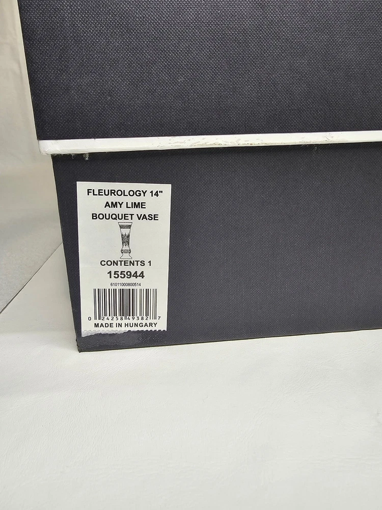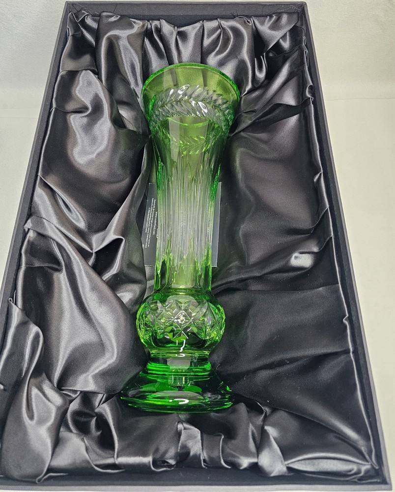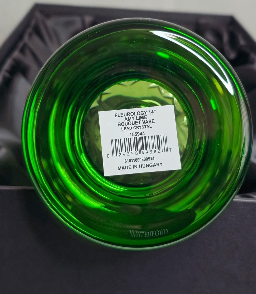 The Waterford Crystal Fleurology Lime Vase is a stunning piece made of 24% lead crystal, weighing 2240 grams and measuring 14 inches tall. This modern and art glass vase features a beautiful lime green color with intricate flower details, making it a perfect decorative piece for any space. Handmade in Hungary, this Waterford vase is signed by the brand and marked with an incised backstamp, adding to its authenticity and charm. Ideal for displaying flowers or as a statement piece in a room, this vase is a luxurious and elegant addition to any home.