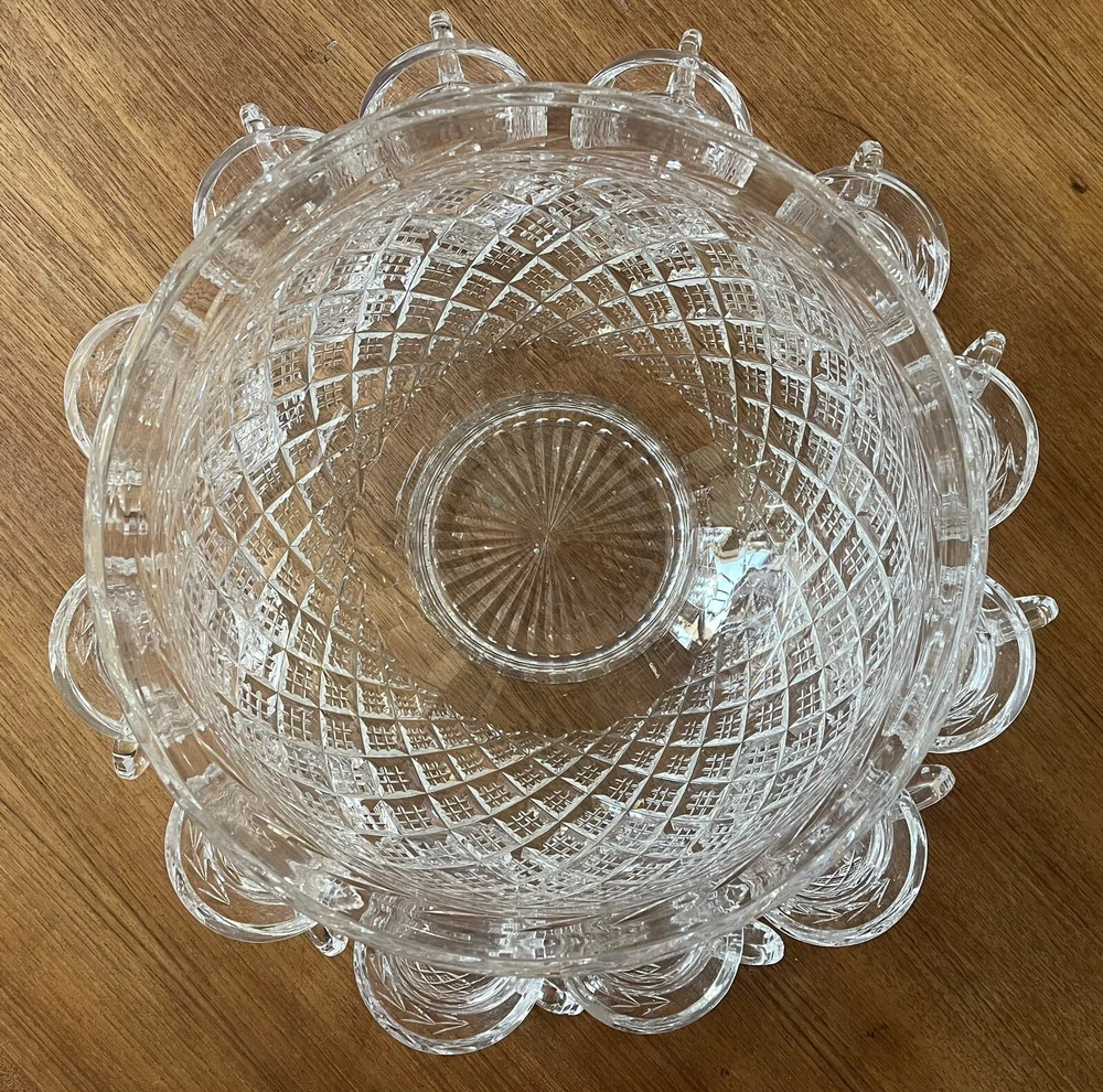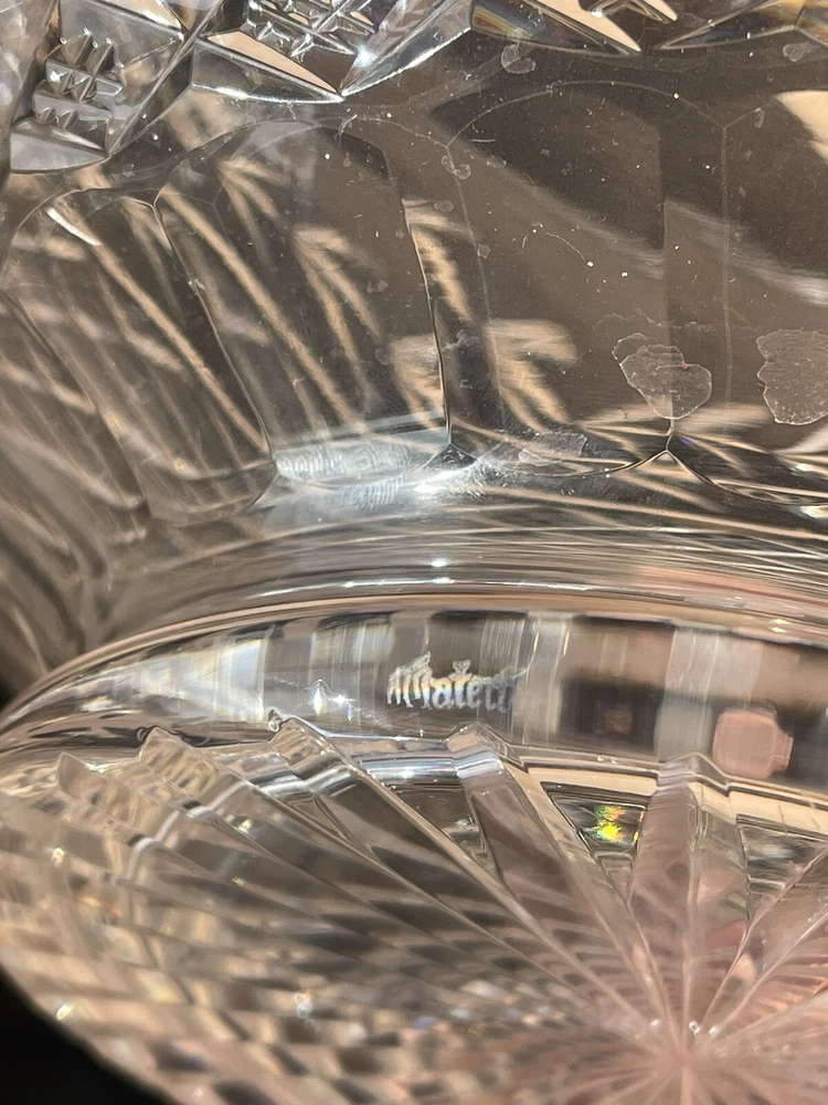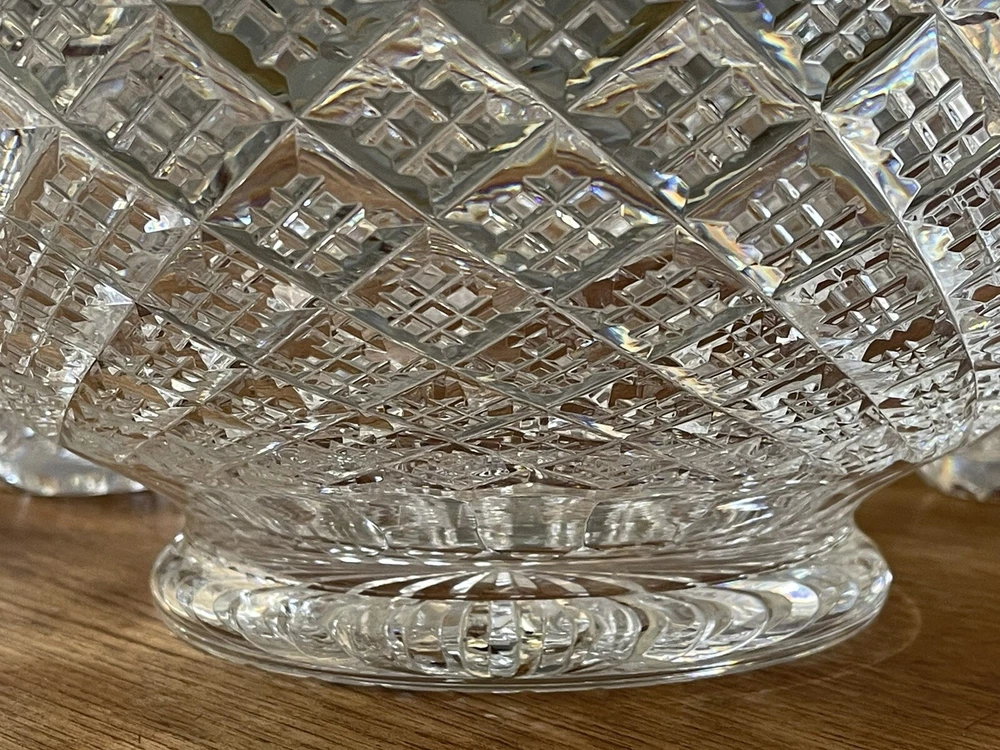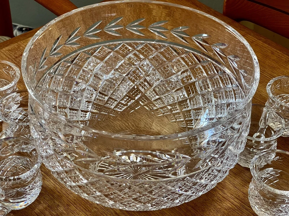 Waterford crystal Glandore punch bowl set is a stunning addition to any glassware collection. The set includes a 12-inch footed punch bowl and 12 cups, all featuring the intricate Glandore pattern. The clear crystal material and round shape make this set a perfect choice for any occasion. The set is an original Waterford product, handmade in Ireland, and features a printed backstamp. The set is perfect for serving punch and other beverages, and is sure to impress your guests. No chips, cracks or repairs