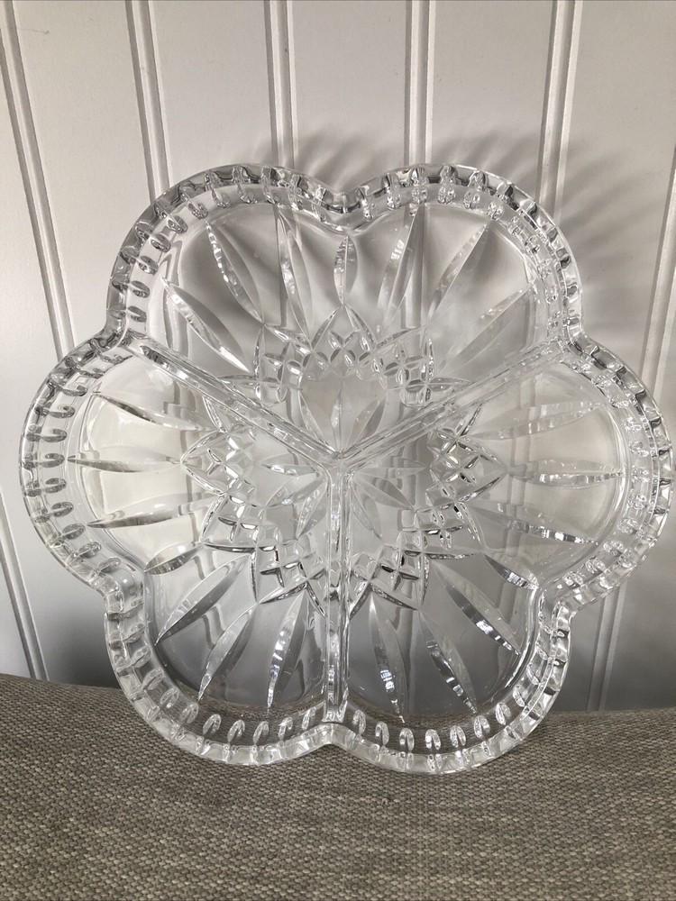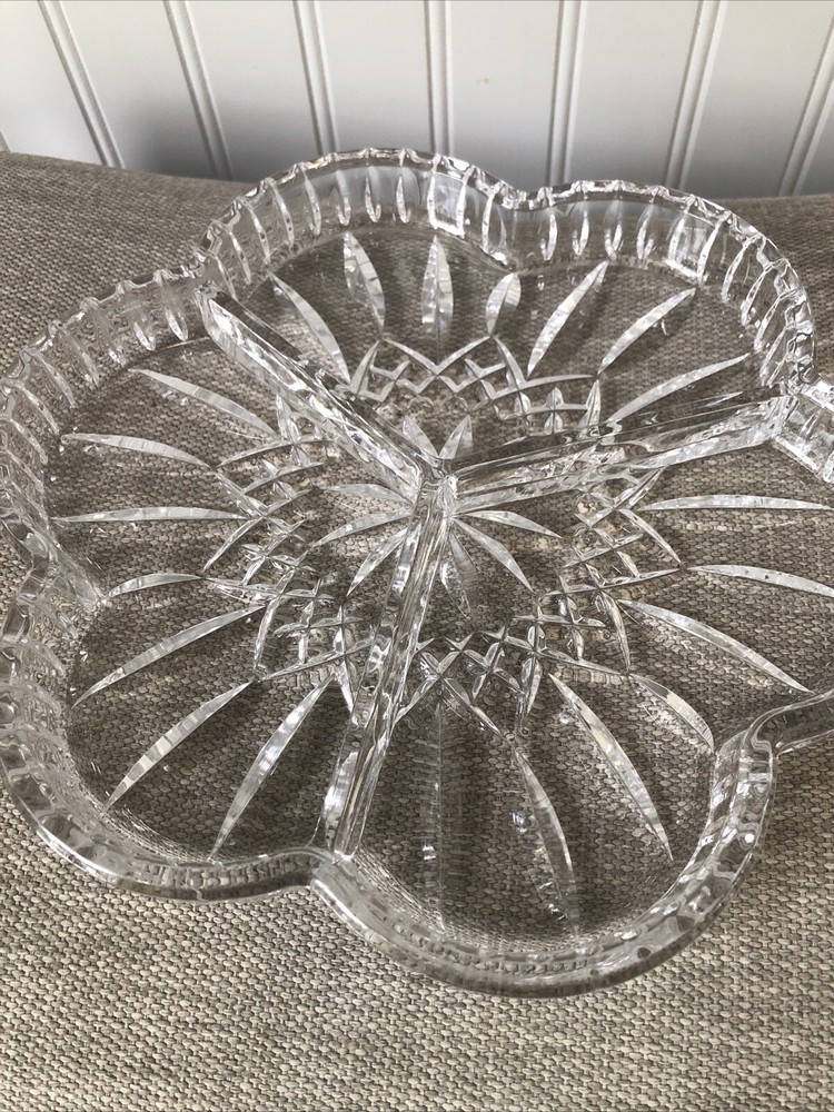 This exquisite Waterford crystal dish is a true vintage gem. With its intricate Lismore pattern and three compartments, it's perfect for serving a variety of snacks and desserts. The dish is made in Ireland and features an abstract clover shape, measuring 9 1/4 inches in diameter. The dish is an original Waterford product, with an etched backstamp verifying its authenticity. It's made of elegant glass and is in excellent condition, ready to add a touch of sophistication to any occasion. Whether you're a collector or just looking for a unique and stylish serving piece, this Waterford crystal Lismore dish is sure to impress. Great condition - no issues to report Please see all photos as they are part of the description +++++++++++++++++++++++++ I respectfully ask for payment within 3 days of auction close/end. The items will be carefully packed and shipped within 3 business days of confirmed payment. PLEASE NOTE: IF THE CALCULATED SHIPPING SEEMS HIGH, PLEASE MESSAGE ME WITH YOUR ZIP CODE AND I CAN PROVIDE AN EXACT QUOTE -- I AM LOCATED IN NEW ENGLAND SO BUYERS FROM HIGHER ZIP CODES MAY SEE VERY HIGH SHIPPING RATES VIA THE CALCULATOR. I AM MORE THAN HAPPY TO DOUBLE CHECK SHIPPING RATE, SO DO NOT HESITATE TO ASK. I will refund postage if paid is more than .50 over actual I strive to inspect, describe, and photograph my items carefully and accurately. However, I am not an expert or collector. If you need more information, please ask I am more than happy to help.. International buyers: I do not accept international returns under any circumstances. If you are unhappy with an item, please contact me so we can work something out, other than a return. Thanks for your understanding Shipping charges keep increasing and while I am happy to provide free expert packing labor and materials, I can't help with the cost of shipping. Also, International buyers, please be aware that you may have to pay import tax or customs fees upon delivery. We do not misrepresent the purchase price of items on packing slips. Buyer/winning bidder is responsible for actual shipping We pack with extreme care, but If the item arrives damaged in transit, please take a photo of the item AND the packaging and send it to us immediately. This is necessary for us to complete the paperwork for you in order to issue a full refund