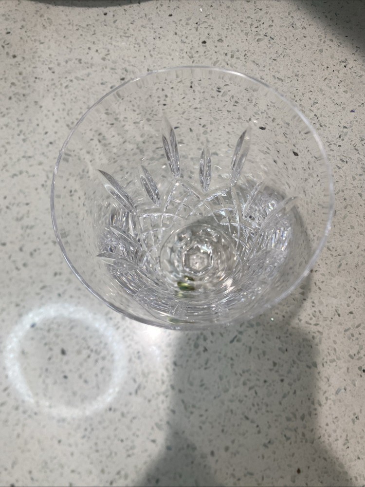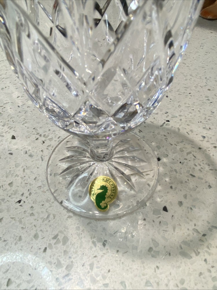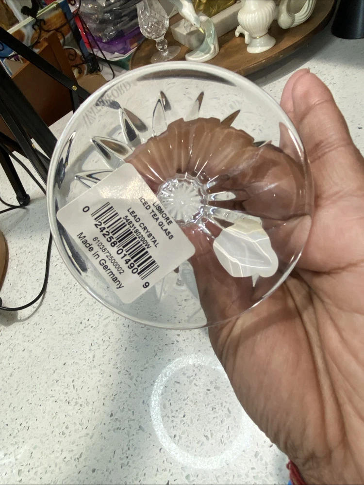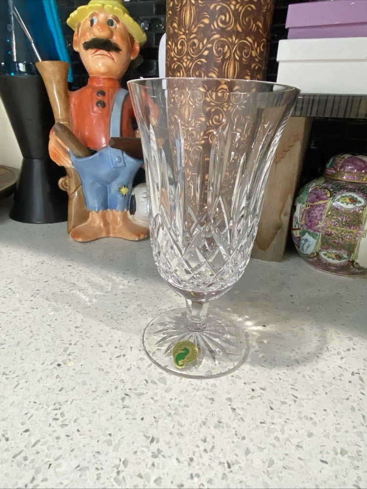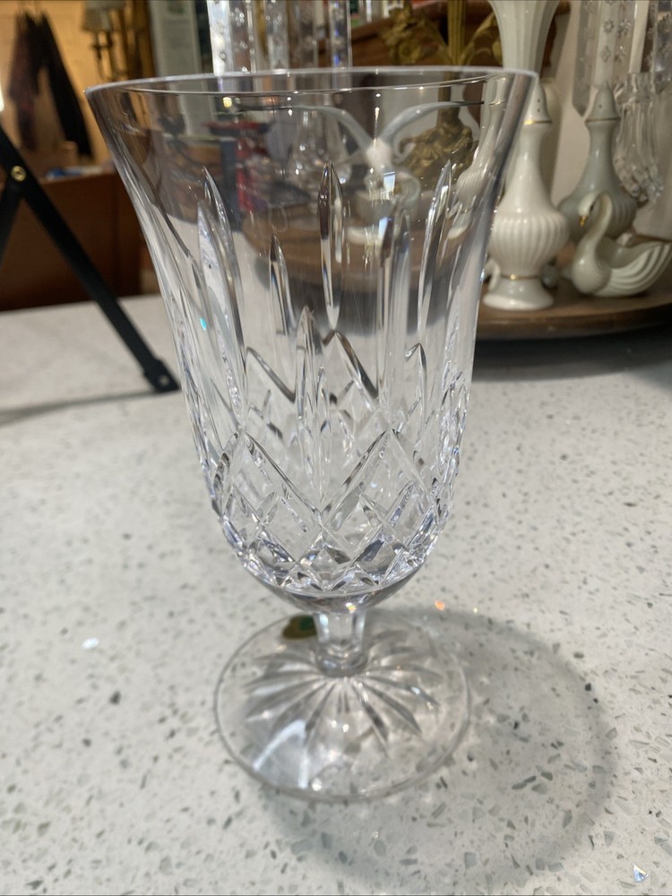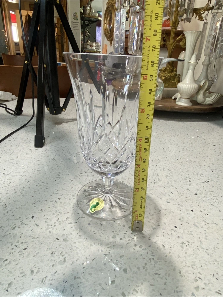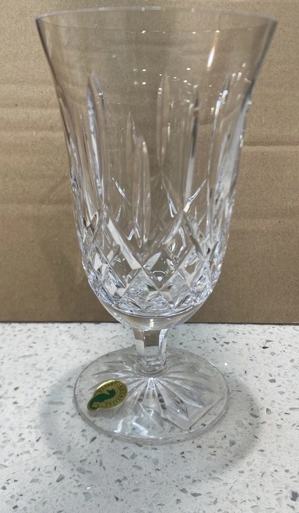 The Waterford Crystal Lismore Stemmed Iced Tea Glass stands at 6 1/2" tall with stickers, showcasing its elegant design and classic theme. Made in Germany in 1990, this vintage piece is crafted from high-quality crystal using hand-blown production techniques. Signed by the renowned brand Waterford, this original piece is perfect for all occasions and is a timeless addition to any drinkware collection. With its clear color and exquisite Lismore pattern, this iced tea glass is sure to impress both teens and adults alike.