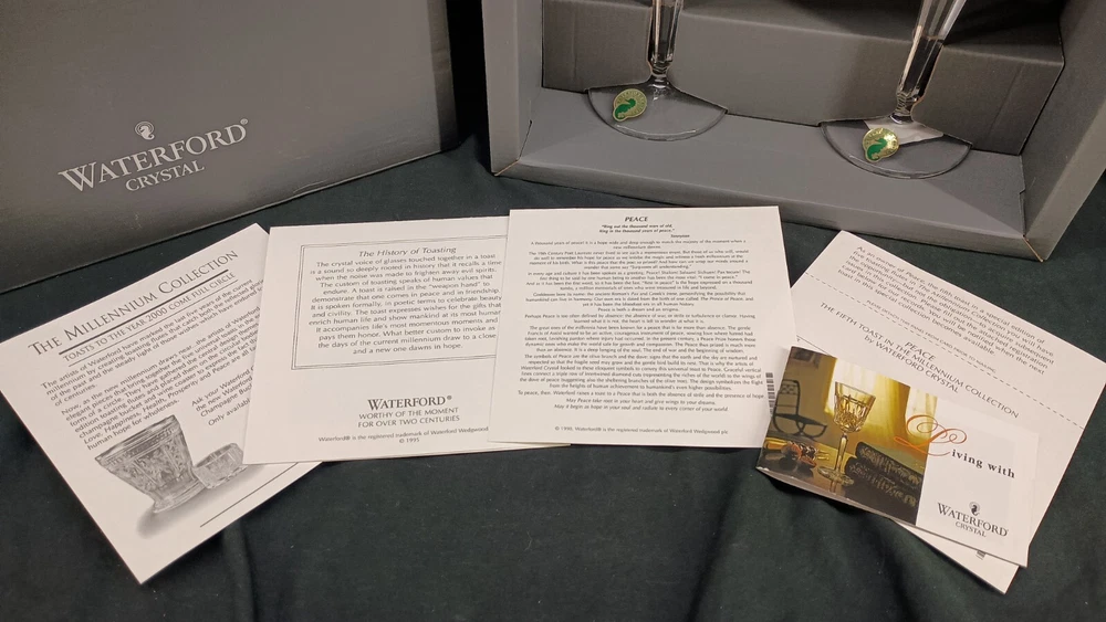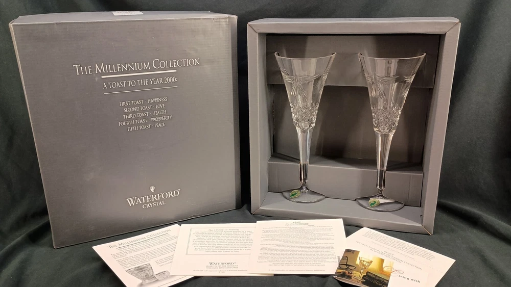 This Waterford Crystal Millennium 2000 Toasting Flutes pair is a part of "The Millennium Collection" and features the "PEACE" design. Made in Germany in the year 2000, these champagne glasses stand at 9 1/4 inches tall and are crafted from clear crystal. Each flute is signed by Waterford, ensuring authenticity and originality in production. These elegant and unique flutes are perfect for toasting and celebrating special occasions, adding a touch of luxury to any gathering. Thank you for visiting my listing today and thank you for your interest in this item! My goal is to have a pleasant transaction resulting in a satisfied customer. I hope any transaction between us leaves you with a feeling of confidence knowing you can trust me and the items I offer here. *Most if not all my listings are set to accept offers. Feel free to send an offer and I will be happy to consider it!! *Please contact me with any questions or concerns and I will be happy to help. *Always examine the photos carefully, and if in doubt, email me with any questions you may have. *Please note that condition statements are offered as a guide only. They will always be somewhat subjective and reflect our opinion, which may not necessarily agree with someone else's opinion. PLEASE READ: I aim to please and I want my buyers to have a positive transaction with me. If you have questions, concerns, or special requests related to any of my items I hope you will contact me so we can work them out to your satisfaction. I sell my items to give you a great item at a decent price while making a little profit at the same time. If you feel the item you are interested in is too pricey do not hesitate to send me a fair offer and I will consider it. My goal is to satisfy your needs and mine so both parties can benefit. SHIPPING: If you prefer a different shipping method or company please contact me and I will do all I can to make that happen. If you have concerns or requests about the packaging of your item contact me and I will do all I can to accommodate them. Shipping costs are based on location in each state or country, the costs always differ. After I have received your payment I will ship your item out within 3 business days or less excluding weekends and holidays. BEFORE PURCHASING & BIDDING: **Please see all the pictures. I do not have great photography skills but I try to get the most accurate photos I can. If you are unsure about something you see in a photo contact me so I can do what I am able to answer your concern about the item. **I cannot stress enough that if you have any questions or concerns please contact me before purchasing and bidding. Communication can solve so much. **As a customer myself, I understand the meaning of customer satisfaction and my goal is to have nothing but satisfied customers. If you are not unsatisfied with your purchase I ask that you please contact me so I can take care of your issue. My goal is for you to be 100% satisfied. INTERNATIONAL BUYERS WELCOMED - PLEASE NOTE: I welcome International buyers! Please be aware that any custom/duties/taxes that the parcel might incur once it is out of the USA are the responsibility of the buyer. Please check with your country's customs office to determine what these additional costs will be prior to bidding or buying. Please refer to the eBay Site Map for more information if needed.