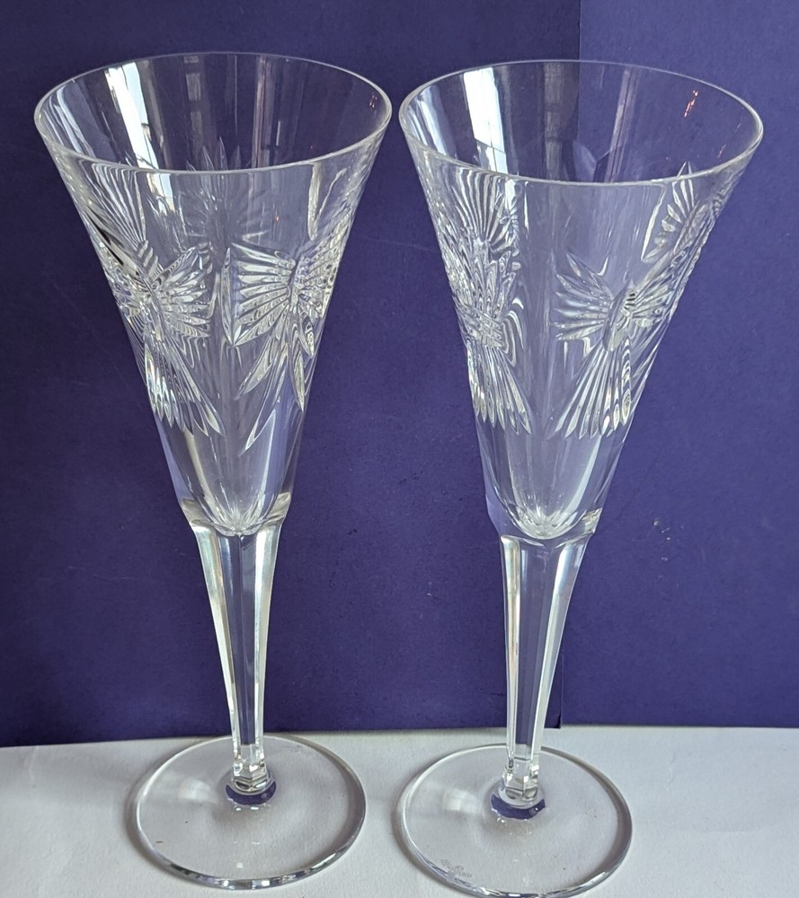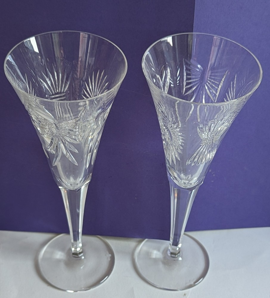 The bowl of the goblet is cut with the 5 patterns of the Millennium series which include: Health, Happiness, Love, Prosperity and Peace. Waterford Crystal Champagne Flutes 5 Toasts Millennium Series Toasting Glasses 2 No chips cracks or other damage noted.