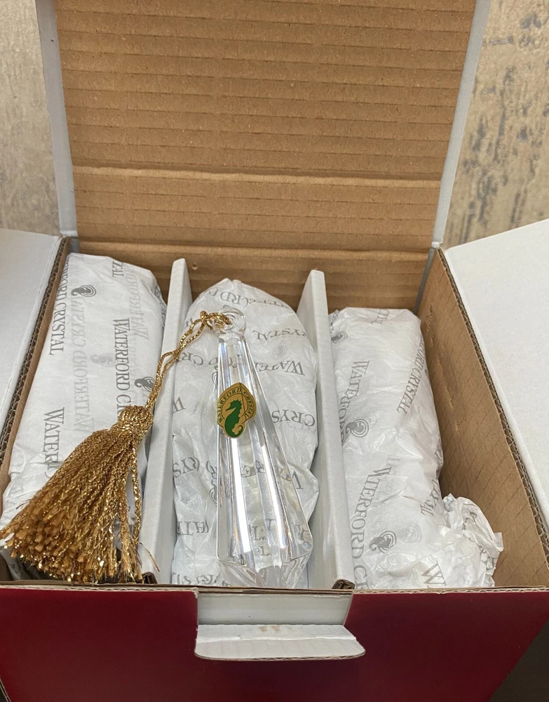 Waterford Crystal Prism Drop Ornaments Set of 3 Unique Ornaments NIB Each ornament is different - it is not a matching set Tasseled hangers are a beautiful bright gold Approx. 4" -4.25"
