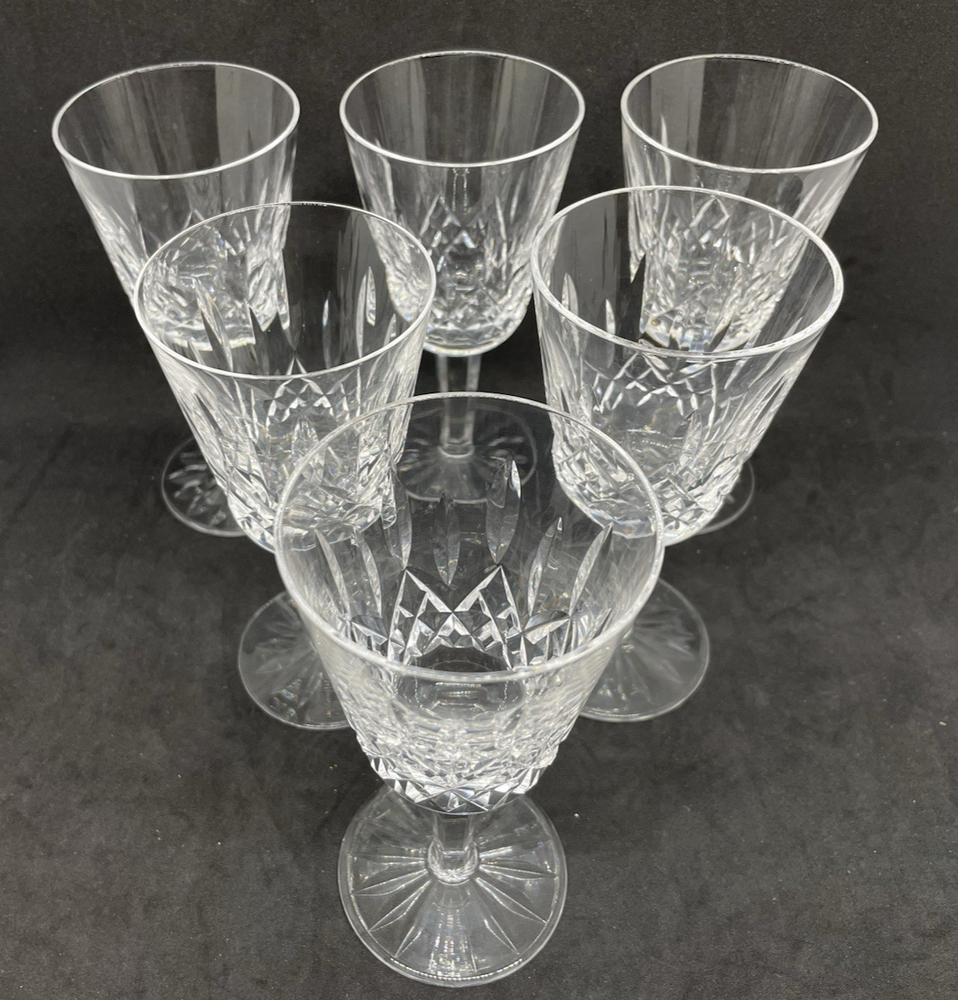 Set of 6 Waterford Lismore White Wine Glasses, in very good condition. Glasses are 5 1/2" tall, 2 5/8" wide, no chips, cracks or repairs.