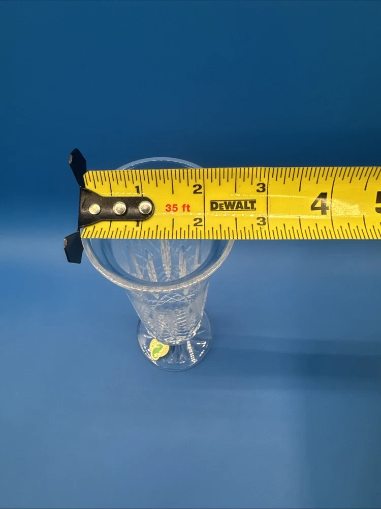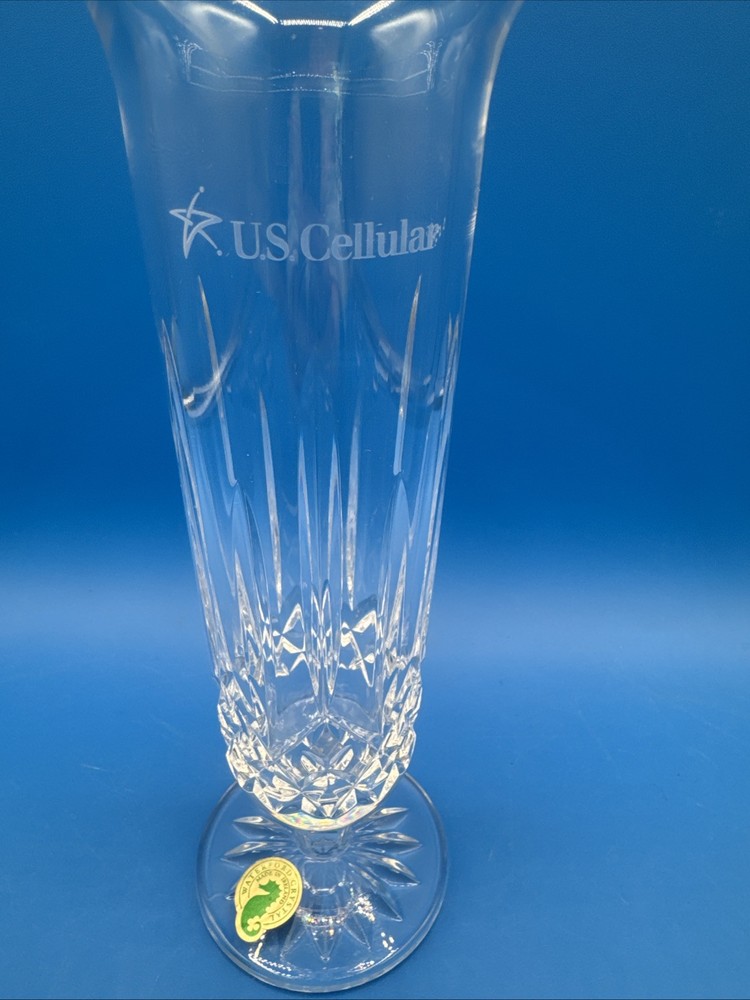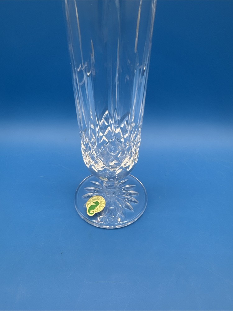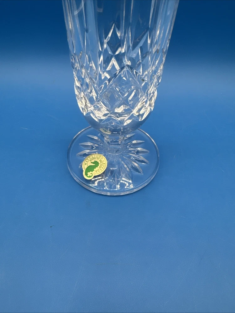 This is a Waterford Crystal Lismore vase with a footed stem, marked with the Waterford logo and measuring 8 inches in length. It comes with its original label intact. The vase features intricate crystal designs, making it a collectible decorative piece. Pre-owned excellent condition. No cracks or damages. No original box. Has engraving. Please check the pictures carefully as part of the description. Feel free to ask questions if you need more information before you buy it. Thank you for your interest C-11