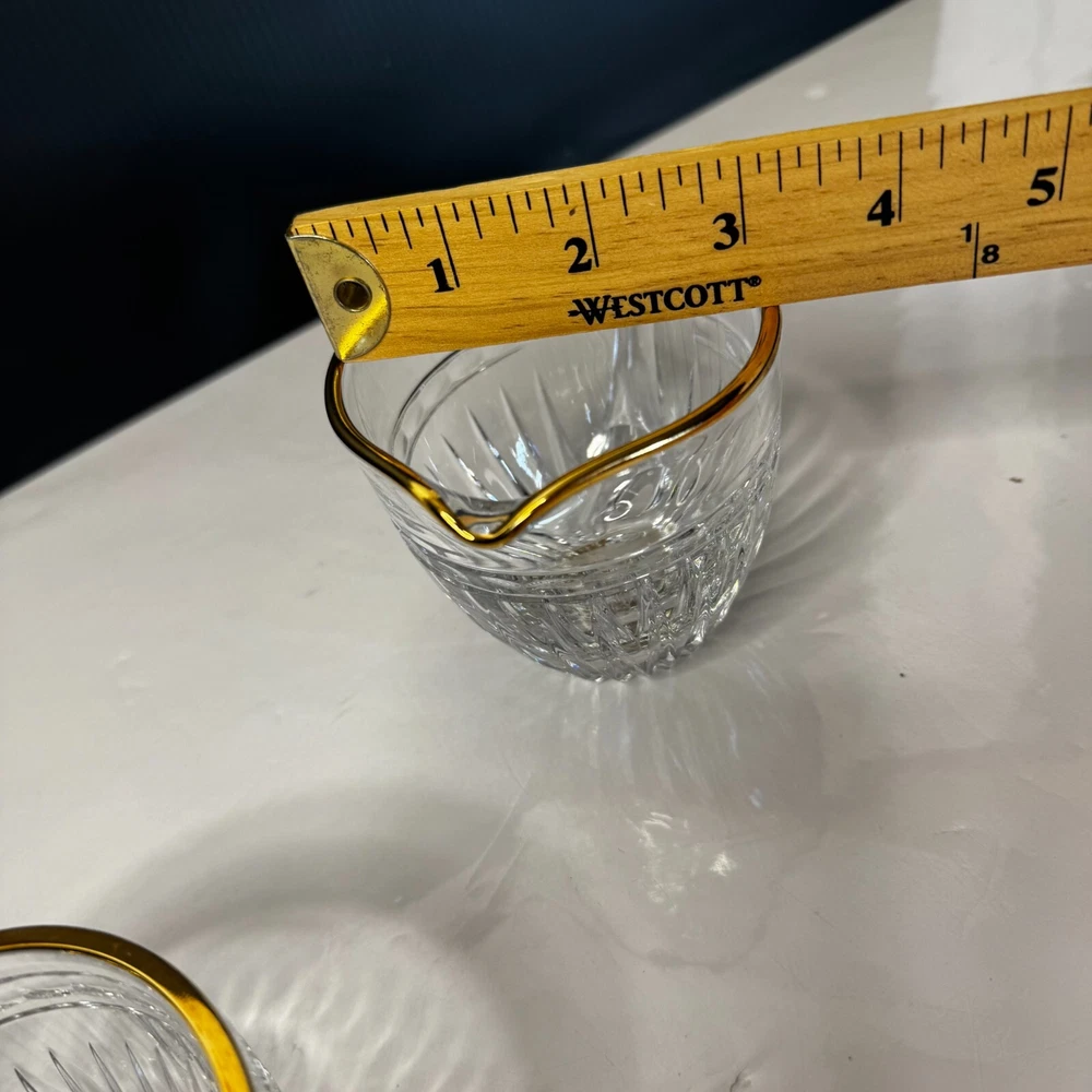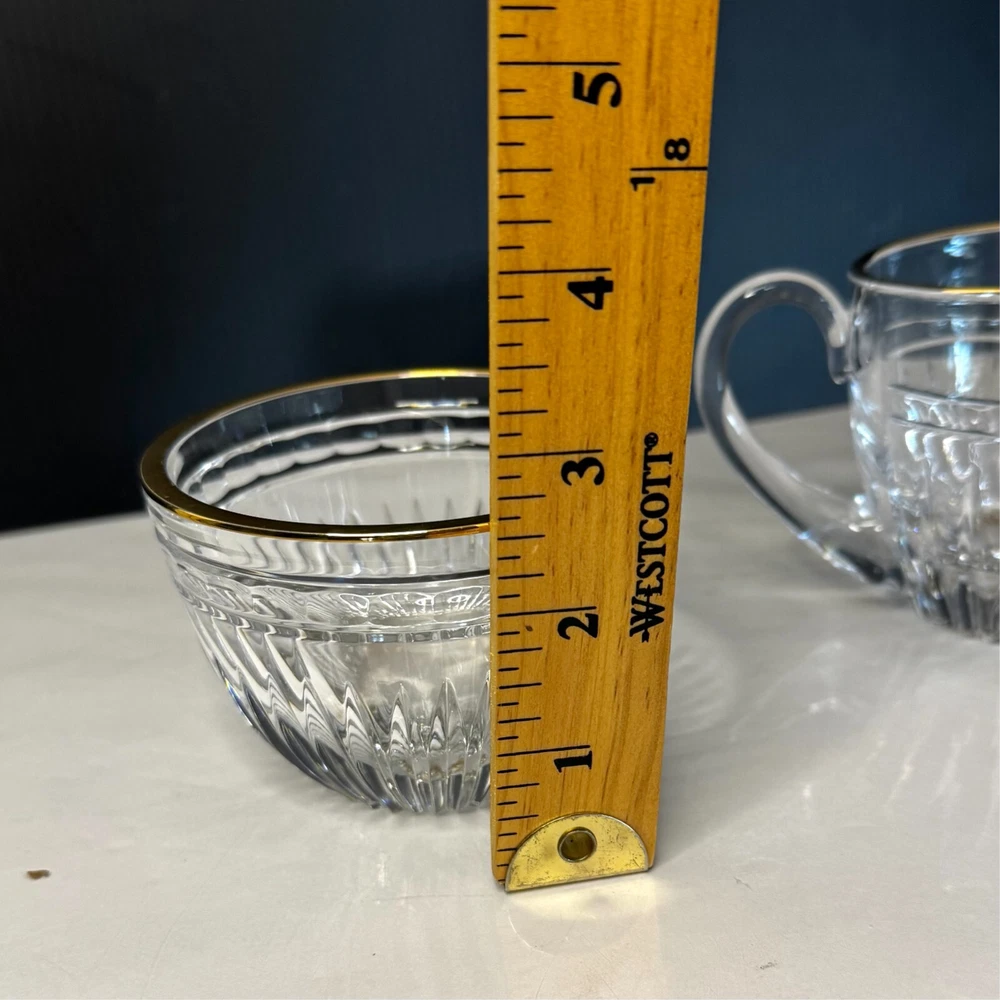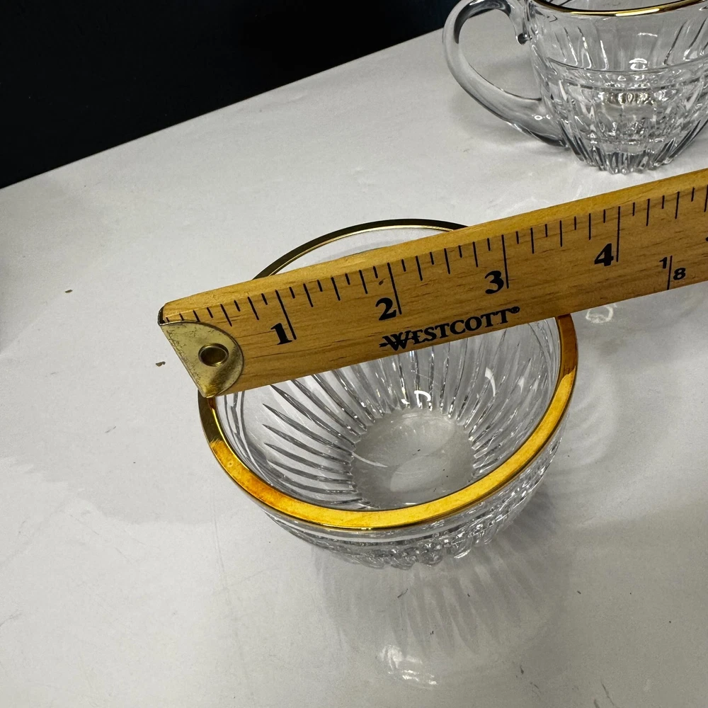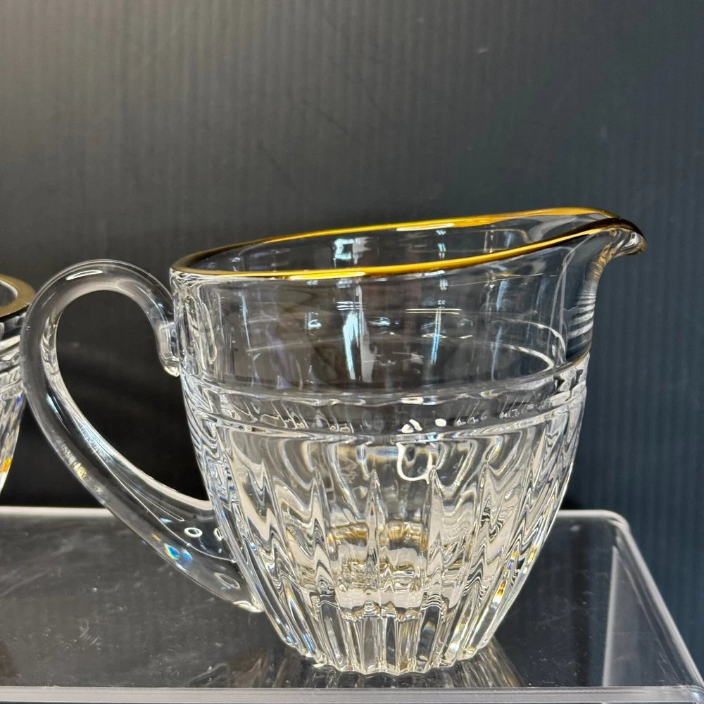 Waterford Marquis Clear Glass Gold Trim Creamer and Open Sugar Bowl Set Signed. Pre-owned item in great condition, has some wear as you'd expect from a used item. No cracks or chips noted. Elegant table presentation.Please use the zoom feature to determine shape and condition, check all pictures and measurements carefully for detailed viewing as they are part of the description and help you with your purchase. I invite you to always check my new listings, buy with confidence. Smoke free home. Thank you, have a wonderful day!! W - 82