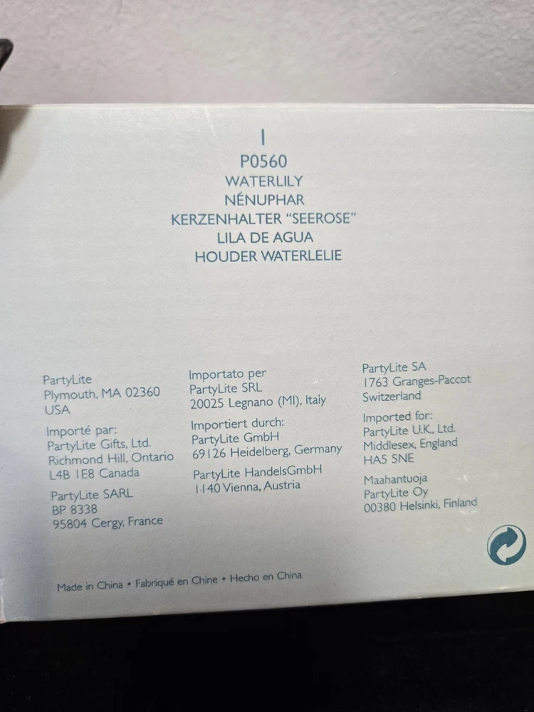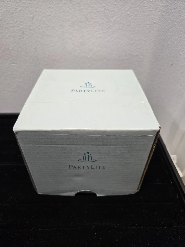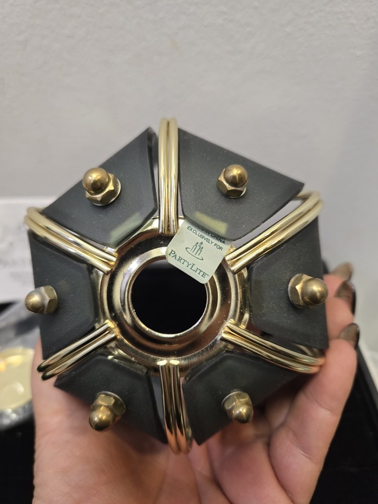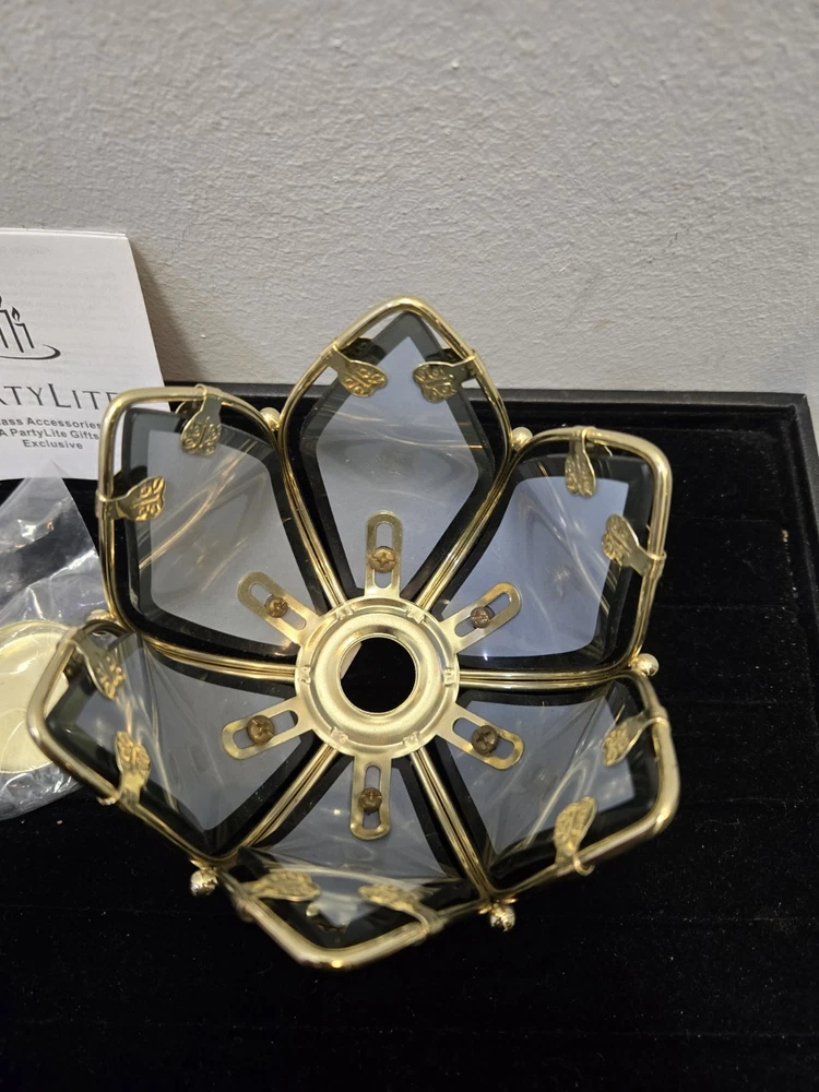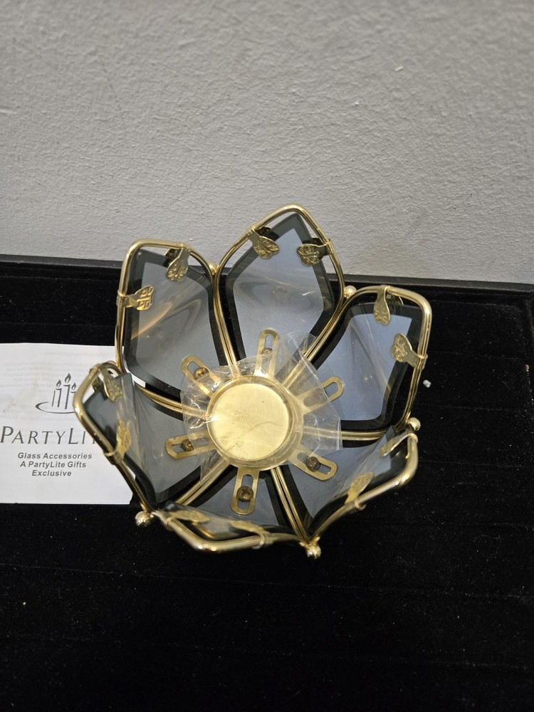 vintage retired Party lite Waterlily tealight votive candel holder approx 5in diameter box 6x5x5 smoke colored frosted glass petals set in brass has original box and paper inside box has small brass cup inside pre-owned not sure if it was ever used it didn't look like it was but dont quote me on that I purchased at a estate sale