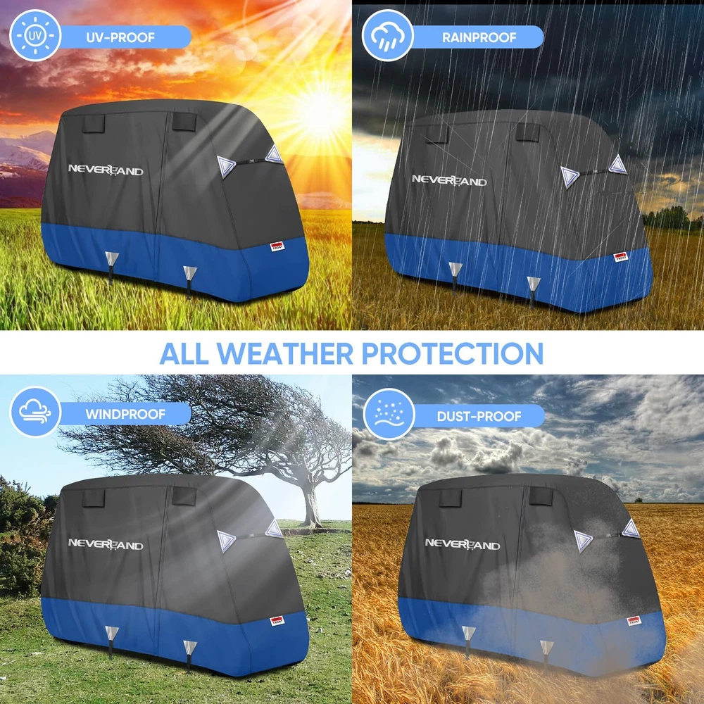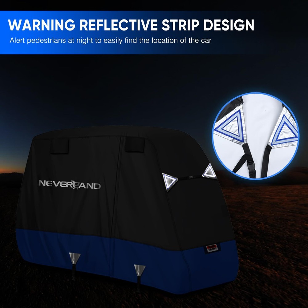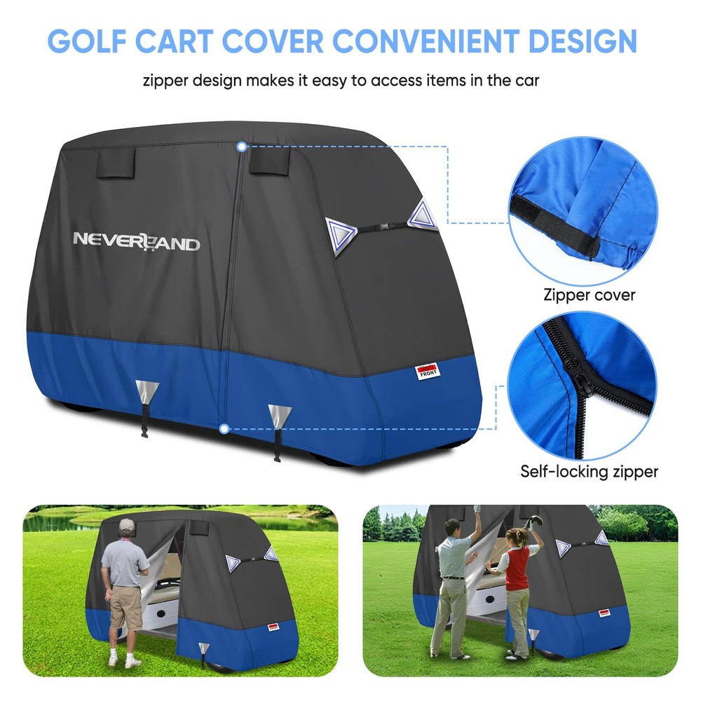 Golf Cart Cover - Waterproof, Sunproof & Windproof - Fits Yamaha, EZ GO & Club Car - Black+Blue, 2 Passenger GOLF COVER SIZE - 95" L *48" W *66" H, designed to fit most 4-passenger golf carts with extended roofs up to 80". Accommodates 2 rear seats, armrests, and footrests, compatible with brands like Yamaha, Club Car, and EZGO. (Tip: Please check the size and model before purchasing.) UNIQUE EXTERIOR DESIGN - ① Stylish color combinations make your golf cart cover stand out. ② Adjustable windproof buckles, a hem cord, and added horizontal straps at the front and rear ensure a snug fit and 360° wind protection. ③ Reflective strips on both the front, rear, and sides enhance visibility and safety during nighttime use ERGONOMIC DESIGN - ① The golf cart cover zipper on the sides facilitate taking the items out of golf cart without even removing the golf cart cover. ② There are vents on both sides to allow for air circulation, which prevents the inner side from being stuffy, and ensures dryness in the golf cart PREMIUM MATERIAL - Made from 600D Oxford fabric, this golf cart cover provides strong, long-lasting protection. It effectively shields your golf cart's finish from rain, heat, sun, snow, and scratches, ensuring durability and reliable performance 600D WATERPROOF - ① The golf cart cover features a special coating with a water pressure resistance of 3000PA. ② The waterproof zipper is equipped with a protective cover and secured with a velcro strap at the bottom for added protection, ensuring complete waterproof performance Golf Cart Cover - Waterproof Golf Cart Covers - Fits for Yamaha Golf Carts EZ GO Club Car - Outdoor Windproof Sunproof (Black+Blue, Fit for 2 Passenger Cart) Shipping We offer FREE shipping on all orders! We ship within Three business days of payment, usually sooner. We use a selection of shipping services such as UPS, FedEx, USPS etc. We only ship to the lower 48 states, no APO/FPO addresses or PO Boxes allowed. Local pickups and combined shipping options are not provided at this time. Return You can return a product for up to 30 days from the date you purchased it. Any product you return must be in the same condition you received it and in the original packaging. Please keep the receipt. Payment We accept payment by any of the following methods: PayPal Please pay as soon as possible after winning an auction, as that will allow us to post your item to you sooner! Feedback Customer satisfaction is very important to us. If you have any problem with your order, please contact us and we will do our best to make you satisfied. Contact Us If you have any queries, please contact us via ebay. We usually respond within 24 hours on weekdays. Please visit our eBay store to check out other items for sale! Thank you for shopping at our store.