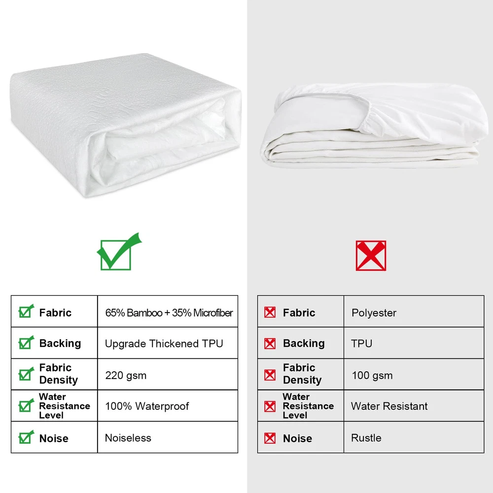 This mattress protector is a game-changer! The bamboo fabric feels incredibly soft and breathable, perfect for sensitive skin—no irritation, just comfort. The waterproof TPU backing works flawlessly, keeping spills and accidents out without that annoying crinkly sound. It stays cool all night, and the fit is snug without shifting. Great for families, especially with kids or elderly loved ones. Washes well and holds up over time. Definitely worth it for healthier, worry-free sleep!