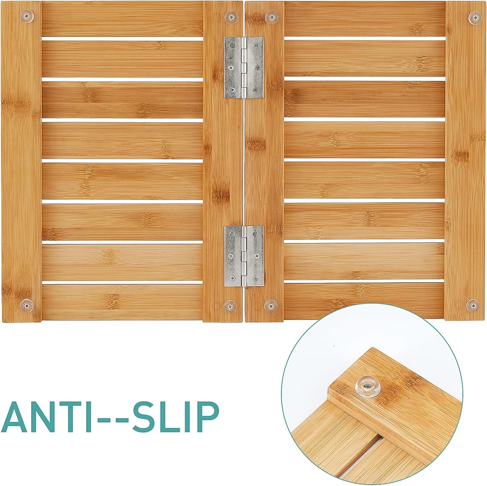 【Fodable】Folded: 15.7" x 11.7", Full: 23.5" x 15.7". It's fully assembled when you get it. 【Safety for Family】Anti-slip gaskets: 8 Pcs, Max load: 200 lbs. 100% durable Moso bamboo. 【Perfect for Indoor & Outdoor】 Great for bathroom, poolside, backyard, doormat, admirable gift to your lover. 【Waterproof & Stain Resistant】3 coats for extra water resistance. Its height off the ground will also allow water to more easily evaporate. 【No Washing & Durable】Forget the terrible smell of wet towels! You can keep it long life with no difficulty and just needs to be erected after showering. Product Description The floor mat is a perfect addition to your bathroom, bathtub, sauna, or spa area and entryway, even outdoors, such as backyard, pool. STURDY 100% MOSO BAMBOO The bath mat is made of MOSO bamboo, more sturdy and durable than wood and oak. GOOD QUALITY MATERIAL: Bamboo has the characteristics of renewability and shorter growing duration which are accordant, but as sturdy as that synthetic material. EXCELLENT SLIP RESISTANCE Soft non-slip rubber feet under the bamboo shower mat will not only ensure your safety but also protect your floor away from scratches. PERFECT SIZE The full size is 23.5''x 15.7'', with slotted panels which allows it to dry faster. FOLDS for EASY STORAGE This bamboo shower mat is assembled when you receive it. The folded size is 11.7"x 11.57",which is very convenient to carry when you go to the beach.