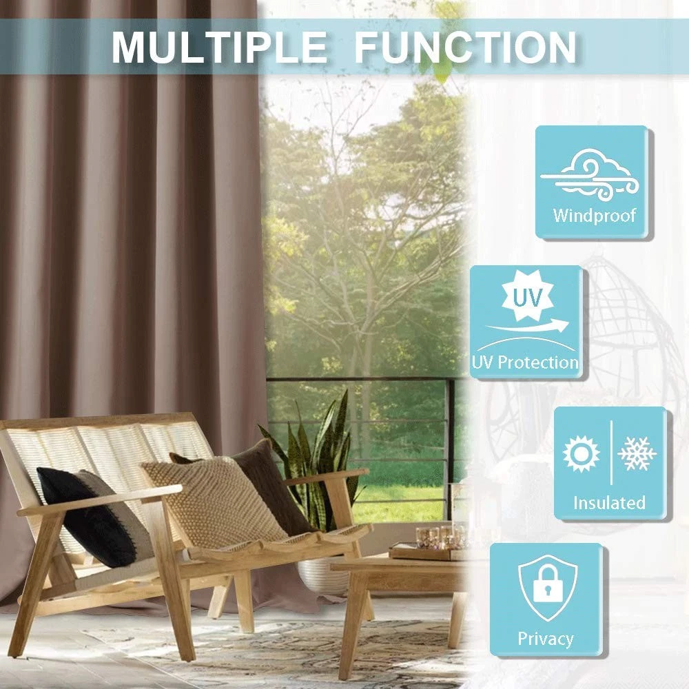 OUTDOOR BLACKOUT CURTAINS - Gift it to your friends or loved ones as a present that’ll stay by their side throughout the seasons. Give your living space a clean & fresh look. OUTDOOR CURTAIN is an ideal way to beat the winter cold and summer heat. Widely match your indoor and outdoor area like patio, pergolas, open Doorways, porch, garage, outdoor shower, bay window ... DETACHABLE TAB TOP Sliding tab top with self-sticky design can easily hanging & unsling curtains without taking down the rod. WIDELY USED These waterproof outdoor patio curtains can block heat& harsh sunlight which make it perfect privacy protection for both indoor/outdoor use whether on the living room, kitchen or porch, gazebo. outdoor curtains are available in various colors and multiple sizes. WEAR RESISTANT AND EASY CARE Curtains are made by triple wave technology, which makes it possible to block 85-95% harsh light and repel the summer hot and winter chill. Also, our outdoor curtain adopts waterproof fabric on both sides and will hold up even in the rain & snow. Machine washable or dry clean. Mild detergent no bleaching. Low-temperature ironing. READY MADE - Package incluedes 2 panels. Each panel measures 52 inch width and the total width is 104 inch. Each panel has 7 Sticky Tabs and suit the most of standard within 1.9 inch diameter. DETACHABLE TAB TOP - Sliding tab top with self-sticky design can easily hanging & unsling curtains without taking down the rod. LIGHT BLOCK - Curtains are made of triple weave fabric and add water resistant process, which makes the outdoor curtains thicker and more weatherproof than other curtains. Curtains can block 80-90% sunlight and keep furniture from sunlight exposure while provide 100% privacy. WIDELY APPLICABLE - This curtains handy to versatile use in the outdoors indoors conditions. Perfect match for outdoor patio, front porch, garden, gazebo, pavilion or indoor dining, living room, shower... EASY CARE - Machine washable with water temperature below 86F. Mild detergent no bleaching. Low-temperature ironing. If you have any quality problems, please contact us first and we will be responsible for it.