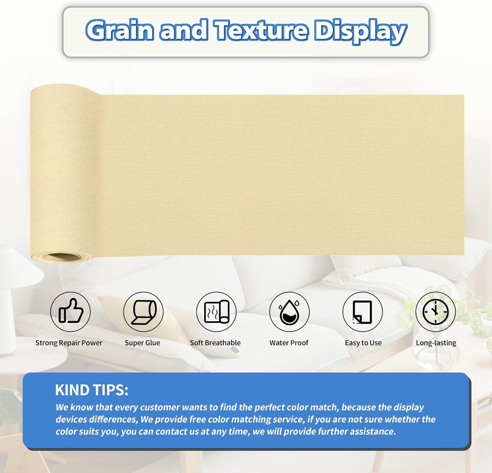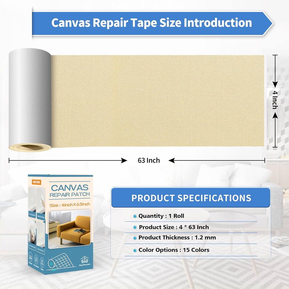 Waterproof Cotton Canvas: The self-adhesive canvas outdoor repair tape is made of high-density canvas material that is wear-resistant and scratch-resistant. The fabric surface is coated with a waterproof layer, providing excellent resistance to water penetration, making it suitable for outdoor use. The patch has a thickness of 1.2mm, which is moderate and flexible, allowing it to blend well with outdoor equipment such as umbrellas and tents, and can last for an long period. Professional Repair Adhesive: The backing adhesive is made of fabric-specific adhesive, which is 20% more adhesive than other transparent repair tapes, ensuring stronger adhesion and reducing the chances of detachment. The smooth repair process and longer lifespan of the canvas patch allow for easy repair of damaged outdoor gear by simply peeling and sticking, providing a fast and efficient solution. Wide Applications: The canvas repair patch is suitable for repairing various outdoor gear, such as tents, sunshades, awnings, sails, sofas, and more. It can easily refurbish and repair scratches, holes, cracks, and other damages, eliminating the need to purchase new furniture or outdoor gear. The lightweight packaging allows for easy carrying and storage. Instructions for Use: Ensure cleanliness and dryness of the damaged area, then cut the patch to the appropriate size. Peel off the backing paper and apply the patch to the area that needs repair, completing the process. This quick and convenient method saves a significant amount of repair time and helps you solve your problems effortlessly. Better Customer Service: For every set of canvas repair kits sold, we offer full exchange or refund if you are unsatisfied with our products for any reason. Due to slight color variations caused by different screens and photo shooting, you may choose the wrong color. We display our full range of color options on the detailed information page to assist you in making a better choice. If you're still unsure, please don't hesitate to contact us for assistance. Product Description KING MOUNTAIN CANVAS REPAIR PATCH Best Solution for Canvas Repair KING MOUNTAIN Canvas Repair Patch Product Introduction Canvas Repair Patch, specially made for canvas material items damage, tear, holes, burns, fading, peeling, pet scratches and other damage repair, easy to operate, so that your canvas items look new, can be used on sofas, recliners, outdoor supplies, tents, sunshade and other canvas products, no additional use of glue, simple operation, easy to use, rapid repair, is the best choice for your canvas repair needs. Product Features Pure Cotton Canvas The canvas is made of pure cotton, wear-resisting, soft, breathable, no peculiar smell, the surface of the canvas is coated with a water proof layer, which can achieve waterproof result. Strong Glue The glue is the most important part, So we choose good self-adhesive, 20 percent more than the conventional product glue content.And which has stronger repair power. Rich Colors In order to meet more color needs, we provide a variety of color options. Designed to Repair Textile Fabrics Canvas Repair Patch can be a good repair for such as cotton, linen, flannel and other material, adhesive stability,suitable for uneven or curved surface,long-term use, do not fall off, no warped edge. Simple and Fast Repairing Power Customer Genuine Feedback Wide Applications What to do when I can't decide on the best color for me? We offer a free color matching service. Just take a picture of the sofa you need to repair and send it to us. We will pick and recommend the best color for you. Is this flexible enough to stick over curved surface? Yes. It will work well on uneven surface as well, like the top of our chair is curved and it works fine, and it also covers the arm of the chair with no problems at all. Please enjoy. Thanks again. Does the glue fall off easily? Our glue is a special glue for Canvas repair, it is very strong after application, please feel free to enjoy it. Is the Canvas surface waterproof, sweat resistant, breathable,easy to clean? It is wear-resistant, waterproof, breathable,you only need to wipe the surface gently with a wet cloth. It is very easy to clean, and there will be no color loss or fading. What is thickness of the sheet? This product is ultra-thin, with thickness of 0.6 mm only.