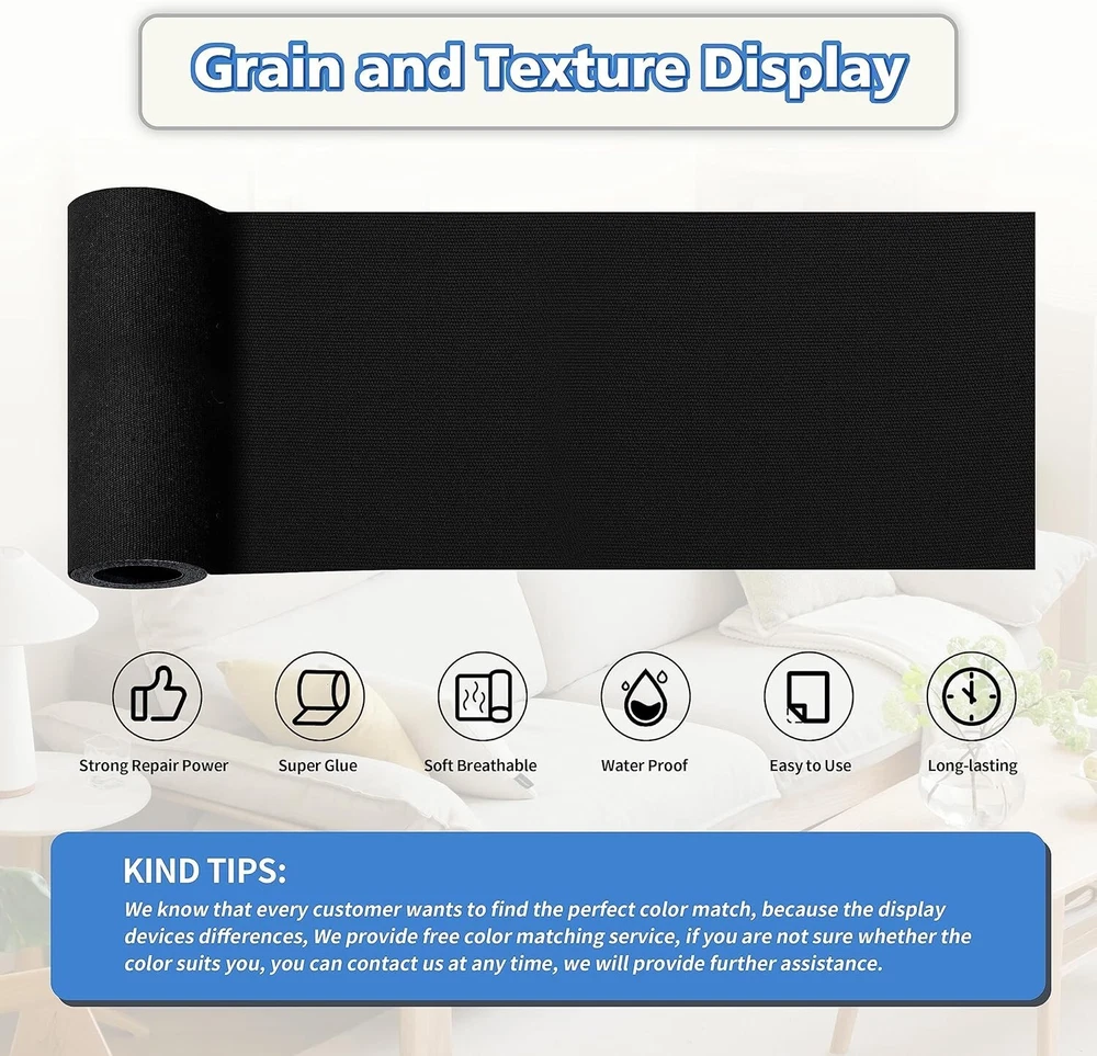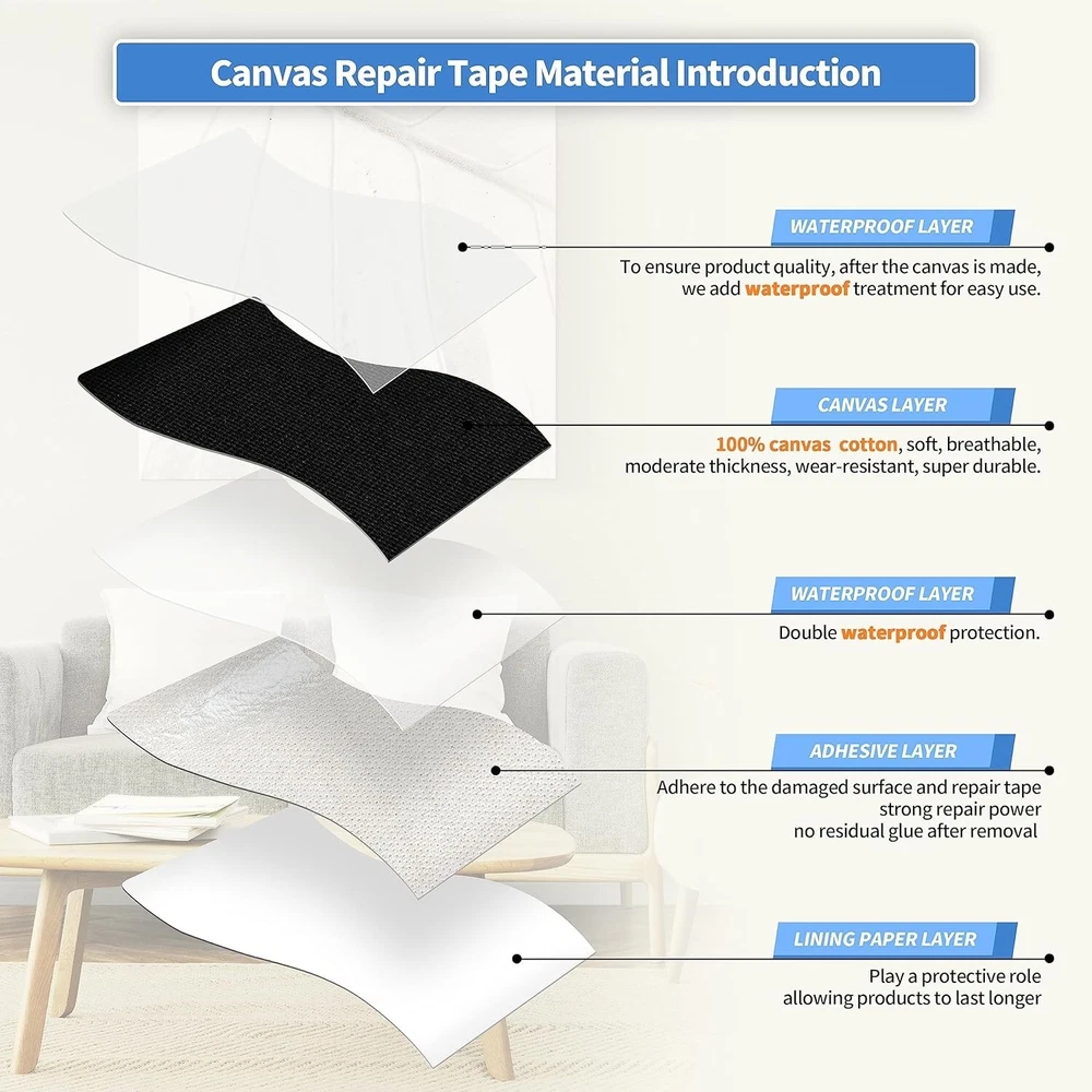 Canvas Repair Tape,Outdoor Gear Patch, 4×63 Inches,Waterproof,Self-Adhesive for Repairing Boat Covers,Sun Shades,Sofas,Tents,Lounge Chairs,Awnings (Black) Waterproof Cotton Canvas: The self-adhesive canvas outdoor repair tape is made of high-density canvas material that is wear-resistant and scratch-resistant. The fabric surface is coated with a waterproof layer, providing excellent resistance to water penetration, making it suitable for outdoor use. The patch has a thickness of 1.2mm, which is moderate and flexible, allowing it to blend well with outdoor equipment such as umbrellas and tents, and can last for an long period. Professional Repair Adhesive: The backing adhesive is made of fabric-specific adhesive, which is 20% more adhesive than other transparent repair tapes, ensuring stronger adhesion and reducing the chances of detachment. The smooth repair process and longer lifespan of the canvas patch allow for easy repair of damaged outdoor gear by simply peeling and sticking, providing a fast and efficient solution. Wide Applications: The canvas repair patch is suitable for repairing various outdoor gear, such as tents, sunshades, awnings, sails, sofas, and more. It can easily refurbish and repair scratches, holes, cracks, and other damages, eliminating the need to purchase new furniture or outdoor gear. The lightweight packaging allows for easy carrying and storage. Instructions for Use: Ensure cleanliness and dryness of the damaged area, then cut the patch to the appropriate size. Peel off the backing paper and apply the patch to the area that needs repair, completing the process. This quick and convenient method saves a significant amount of repair time and helps you solve your problems effortlessly. Better Customer Service: For every set of canvas repair kits sold, we offer full exchange or refund if you are unsatisfied with our products for any reason. Due to slight color variations caused by different screens and photo shooting, you may choose the wrong color. We display our full range of color options on the detailed information page to assist you in making a better choice. If you're still unsure, please don't hesitate to contact us for assistance.