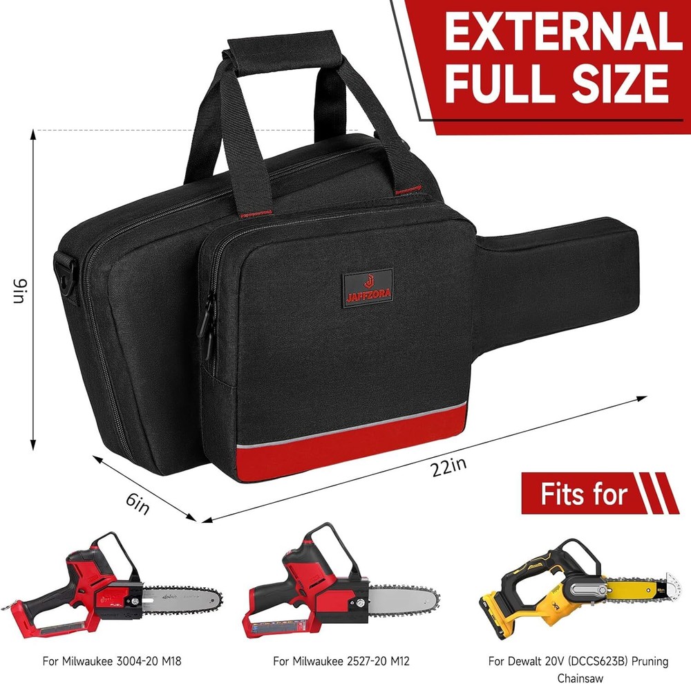 Mini Chainsaw Case Compatible with Milwaukee Electric Tool M18/ M12/CRDLSS 12V Fuel Hatchet 6In 8In Pruning, Waterproof Chainsaw Storage Bag Fits for RYOBI & Chrome (3004-20) & Accessories (Bag Only) Compatible Models: The mini chainsaw bag is compatible with Milwaukee Electric Tool M18 (3004-20) / M12 (2527-20)/ CRDLSS 12V Fuel Hatchet 6 & 8 Inch Pruning Saw, batteries and charger. And fit for Dewalt & RYOBI ONE+ HP Brushless mini chainsaw. Utility Chainsaw Case: The main compartment is enough to hold 6in or 8in chainsaw and battery. The front pocket can hold M18 lithium-Ion batteries and charger, and back pocket for storing tongs, wrenches, screwdrivers, etc. Well Protection: The mini chainsaw bag is made of waterproof fabric with soft lining, sturdy and scratch-resistant; The 8-inch chainsaw case is equipped with reflective tape and smooth double zippers, which is easy to find and use. Easy to carry: The chainsaw storage bag has a sturdy padded handle and detachable shoulder strap for convenient portability. Perfect choice for carpenters and woodsmen.