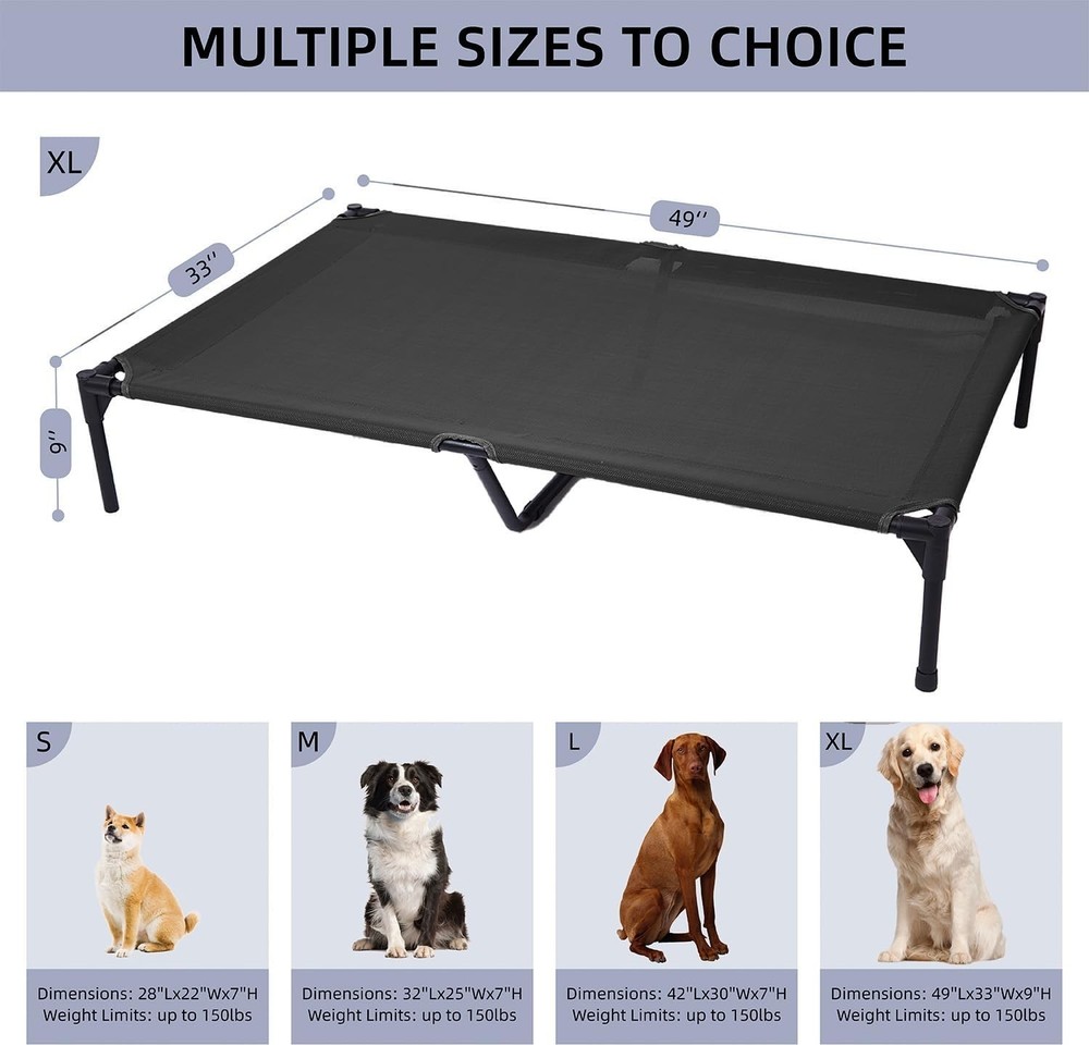 Elevated Outdoor Dog Bed Large Waterproof Cooling Raised Cot with Washable Mesh ‹ › ‹ › ‹ › ‹ › ‹ › ‹ › ‹ › ‹ › ‹ › Elevated Outdoor Dog Bed - Large Waterproof Cooling Raised Cot with Washable Mesh Product Specifications: Dimensions: 49" x 33" x 9" (125 x 83 x 22.5 cm) Weight Capacity: Supports pets up to 150 pounds (68 kg) Features: Cooling Design: 7" off-the-ground construction promotes airflow on all sides, helping to keep your pet cool on warm or rainy days. High-Quality Materials: Constructed with durable, heat-resistant Teslin (recyclable) mesh; breathable and anti-scratch for maximum comfort. Sturdy Stability: Lightweight yet robust metal frame, tested for strength; non-skid rubber feet ensure it stays in place while your dog hops on and off. No Screws & Quick Assembly: Hassle-free setup with plug-in design eliminates the need for screws and wrenches; assembly video available for your convenience. Easy to Clean: Washable pet bed with removable cover; simply hose it off or wipe down with a damp towel. Perfect for indoor and outdoor use. Benefits: Provides a cool, supportive sleeping area that alleviates pressure on joints. Durable construction ensures long-lasting use and withstands daily wear and tear. Portable design allows for easy travel; perfect for camping, picnics, and trips to the park. Keep your furry friend comfortable and happy with this elevated, hassle-free dog bed. Why choose our Elevated Outdoor Dog Bed? Give your beloved pet the gift of comfort and support with our Elevated Outdoor Dog Bed. Designed to promote airflow and reduce pressure on joints, this bed is the ultimate in both functionality and elegance. Crafted from high-quality, durable materials, it is built to withstand the elements while providing a cozy retreat for dogs of all sizes. Whether at home or on the go, our effortlessly cleanable and easy-to-assemble bed ensures your pet can enjoy restful days and nights. Elevate your dog’s comfort—order your Elevated Outdoor Dog Bed today! Shipping Free & Fast Shipping - We offer free shipping to most of the USA with a normal delivery time of 3-7 days. However, due to the current situation, additional delivery time (up to 3 weeks) may be required for some items. Alternative Carriers - We may use alternative carriers (e.g. USPS, FedEx, UPS, etc.) to ensure your package arrives safely and on time. Due to the use of multiple carriers, we are unable to provide a tracking number automatically. Handling Time - Orders are processed and shipped within 1-2 business days of receiving cleared payment. Shipping Restrictions - Shipping to Alaska, Hawaii, Puerto Rico, Guam, and other US territories may incur shipping charges or delivery restrictions. Please contact us before ordering, or your order can be refunded/cancelled. State Restrictions - There may be restrictions based on your state of purchase. For example, certain items may not be shipped to California due to state regulations. Contact for Tracking Updates - If you require tracking updates or have any concerns about the delivery of your order, please feel free to contact us, and we will be happy to assist you. Return 30-Day Hassle-Free Returns - We want you to be completely satisfied with your purchase. If you are not, you can return the item within 30 days of receiving it for a full refund or exchange. Easy Return Process - To start a return, simply contact us and we will provide you with a prepaid return shipping label and detailed instructions. Restocking Fee - There are no restocking fees for returns. However, the buyer is responsible for return shipping costs if the return is not due to a seller's error. Refund Processing Time - Refunds will be processed within 5 business days of receiving the returned item in its condition. Payment We accept all major credit cards, PayPal, and Apple Pay for your convenience. Your payment information is secure and encrypted to ensure a safe and seamless transaction. Please complete your payment within 3 days of purchase to avoid any delays in shipping. Feedback Your feedback is extremely important to us. We strive to provide the best products and customer service possible. If you are satisfied with your purchase, please take a moment to leave us a positive review. If you have any concerns or issues with your order, please contact us before leaving negative feedback. We are committed to resolving any problems and ensuring your satisfaction. Contact Us If you have any questions or concerns, please feel free to out to our customer support team. You can contact us through the eBay messaging system. We are available Monday to Friday, 9:00 am to 5:00 pm EST, and we will do our best to respond to your inquiry within 24 hours. Buy it now and enjoy a pleasant shopping experience! Unit Quantity: 1.00 count Features: Cooling,Machine Washable,Outdoor,Portable,Waterproof Dog Size: XL Dog Breed: All breed sizes Type: Raised Bed Material: Teslin Mesh