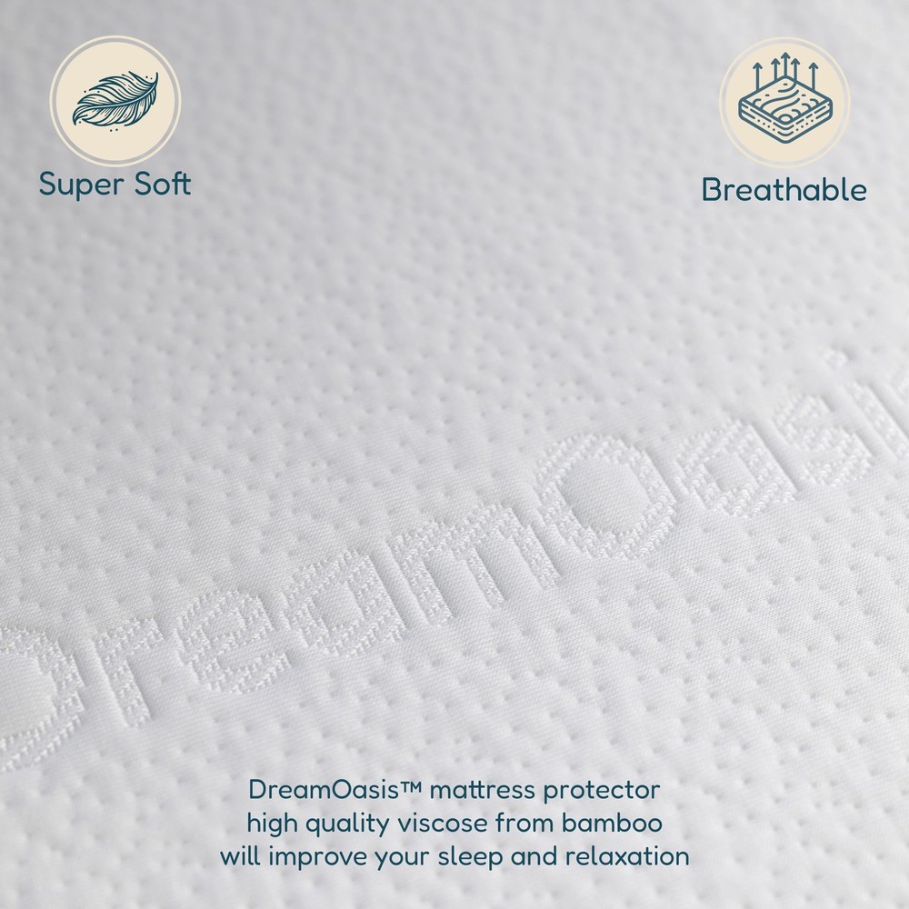 Experience the ultimate comfort and protection with our Full bamboo viscose mattress protector. Made from super soft bamboo viscose, it provides a luxurious feel while being waterproof to guard against spills, stains and allergens. The noiseless design ensures a quiet, restful sleep, while the breathable fabric keeps you cool by promoting air circulation. Easy to maintain, this protector is machine washable, making it simple to keep your bed fresh and clean. Certified to OEKO-TEX Standard 100, it guarantees safety from harmful substances. Upgrade your bedding with our bamboo viscose mattress protector for a perfect blend of comfort, protection, and peace of mind. ULTRA SOFT COMFORT: Enjoy the luxurious softness of bamboo viscose, providing a gentle and comfortable sleep surface for a restful night's sleep. 100% WATERPROOF PROTECTION: Protect your mattress with completely WATERPROOF Full MATTRESS PROTECTOR, designed to guard against spills, sweat, and accidents, keeping your mattress dry and stain-free. BREATHABLE AND COOLING: Stay cool and comfortable all night with our Full breathable mattress cover, which helps regulate temperature and promotes air circulation. ANTI-PILLING MATERIAL: Our Full bamboo viscose mattress pad ensures long-lasting durability and maintains a smooth, pill-free surface wash after wash. MACHINE WASHABLE CONVENIENCE: Our mattress topper is designed for hassle-free cleaning; simply machine wash and tumble dry to keep it fresh and hygienic, ensuring a clean sleep surface effortlessly. NOISELESS SLEEP EXPERIENCE: Sleep soundly without the disruption of crinkling noises, thanks to our noiseless mattress protector that maintains a quiet and peaceful sleep environment. FITTED SHEET STYLE: Deep-pocket design accommodates mattresses up to 18 inches deep, ensuring a snug and secure fit for your mattress.