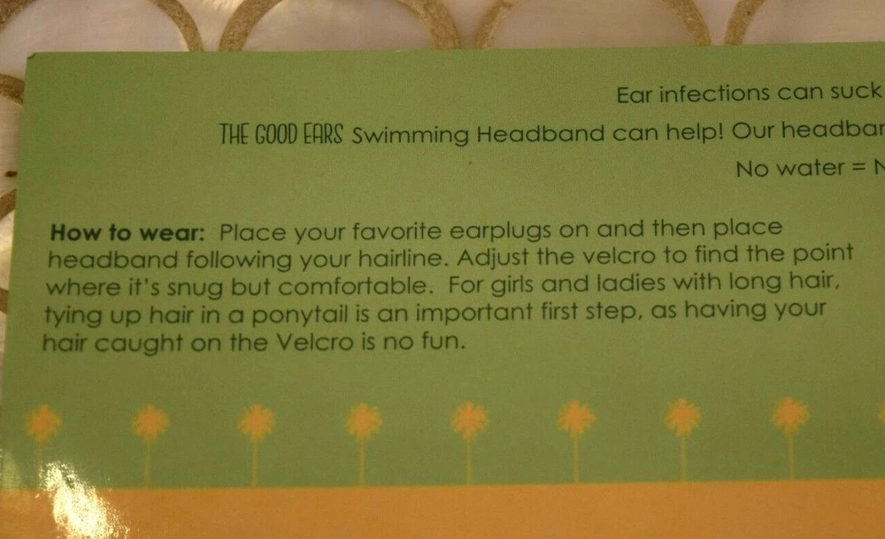 Brand New in Package - The Good Ears Swimming Headband Size Medium for Ages 1- 6 Years 22 1/2" across 3 1/2" long strips of Velcro sewn in for easy adjusting Color: Green ANOTHER LAYER OF PROTECTION: Ear infections can suck the joy out of epic swim days. The Good Ears Swimming Headband can help! Our headband is designed to work with earplugs to block water from the ear. No water = No Swimmer’s Ear. Genius! GOT EAR TUBES? Your ENT doctor might recommend keeping water out of the ears after having ear tubes placed. THE GOOD EARS Swimming Headband adds an extra layer of protection when swimming and helps keep earplugs in place. It can be used for showering and bathing as well. MADE OF NEOPRENE, BUILT TO LAST AND DESIGNED TO IMPRESS: Neoprene is commonly used in fly fishing waders and wet suits; it is a durable, low-maintenance material and provides some insulation against cold. And let’s be honest, our Paisley bandanna look blows all other swimming headbands out of the water! Please feel free to contact me with any questions! Returns on unused items cheerfully accepted. Smoke-free, pet-free home. Thanks! -Sonia