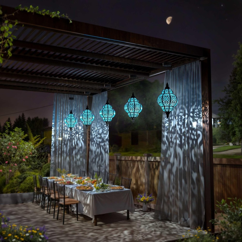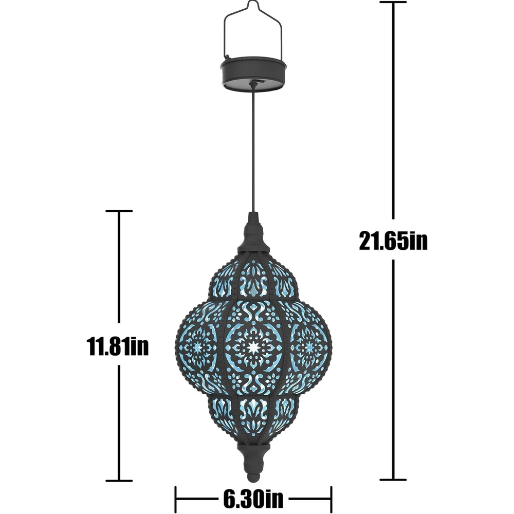 Hanging Solar Lights Outdoor Garden Decor Solar Lantern Waterproof Plastic Moroccan Outdoor Decorations for Patio Pathway Yard Backyard Garden Decorative (2, Black) Product Details Number of Items: 2 Style: black Brand: Hapjoy MPN: ZB-520 UPC: Does not apply EAN: Does not apply Light Source Type: Light Emitting Diode (LED) Brand: Hapjoy Color: Black Power Source: Solar Powered Material: Plastic Product Dimensions : 6.3 x 6.3 x 21.65 inches; 1.5 Pounds Item model number : ZB-520 Date First Available : May 19, 2023 Manufacturer : Hapjoy Country of Origin : Switzerland Customer Reviews: 4.3 4.3 out of 5 stars 723 ratings Product Dimensions: 6.3"L x 6.3"W x 21.65"H Battery Description: Nickel-Metal Hydride Mounting Type: Tabletop Mount Water Resistance Level: Waterproof Manufacturer: Hapjoy Part Number: ZB123 Item Weight: 1.5 pounds Country of Origin: Switzerland Item model number: ZB-520 Item Package Quantity: 2 Style: black Included Components: Batteries included Batteries Included?: No Batteries Required?: No Date First Available: May 19, 2023 Good Decoration10 lumens. These garden solar lights are only used as beautiful decorations and may not illuminate the entire road. The projection of these solar outdoor lights is amazing, the pattern is unique and copyrighted. These yard art decorations with warm light can decorate your gorgeous life with a more romantic atmosphere. This garden lights solar powered waterproof are mainly used for decoration. Energy SavingThis outdoor solar lights are powered by solar energy and do not need wires and other power supply equipment. The solar garden lights outdoor decorative have a built-in light sensor, which is automatically charged in the sun, and it will automatically light up at night after turning on the switch. The solar lights outdoor waterproof can illuminate for 6-8 hours after a full charge under normal conditions. Multi-scene UseThe solar garden light can be hung anywhere you want. This outdoor solar lanterns will be an attractive decoration for patio, porch, garden, yard, lawn, walkway and pathway. You can charge the outdoor solar lights decorative then use it indoor if you want. All-Weather DurableThe garden decor for outside is made of Plastic material, and the whole body is hollowed out and carved, whether it is rainy or snowy, it can be waterproof. Suitable for long-term use outdoors. After-sales servicewe provide 180 days warranty and friendly customer service. Purchase with worry free!