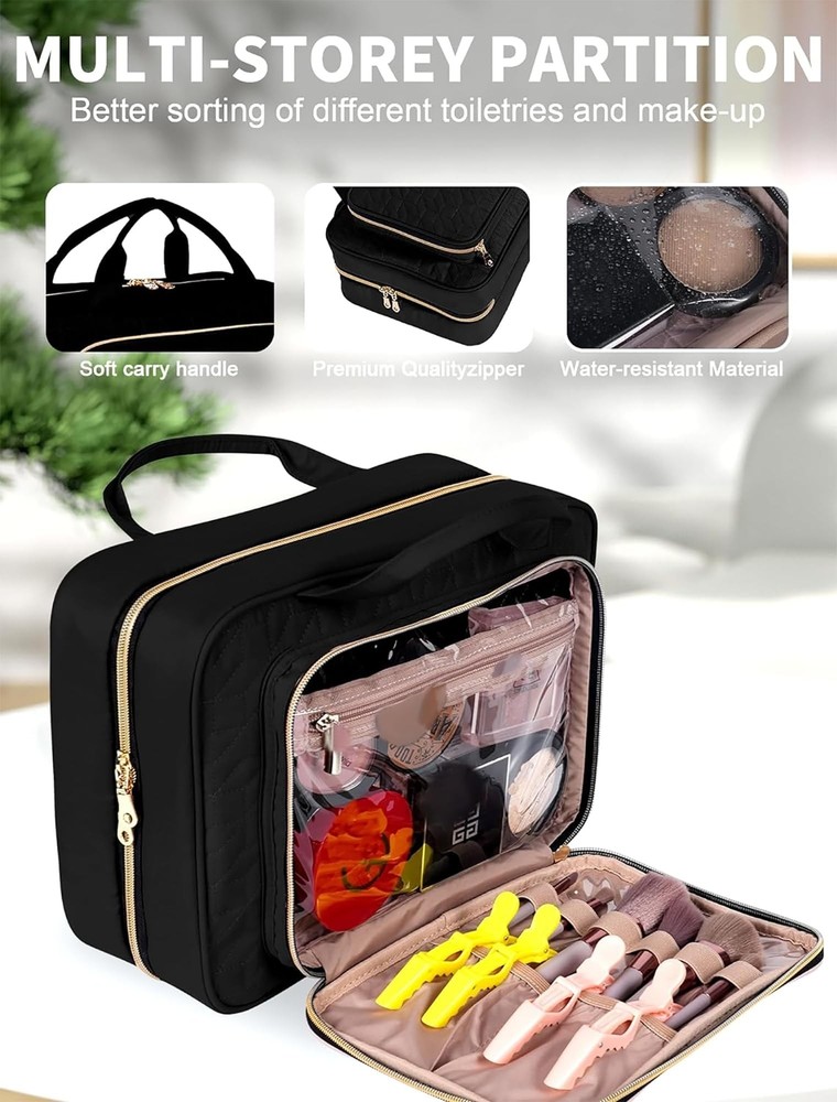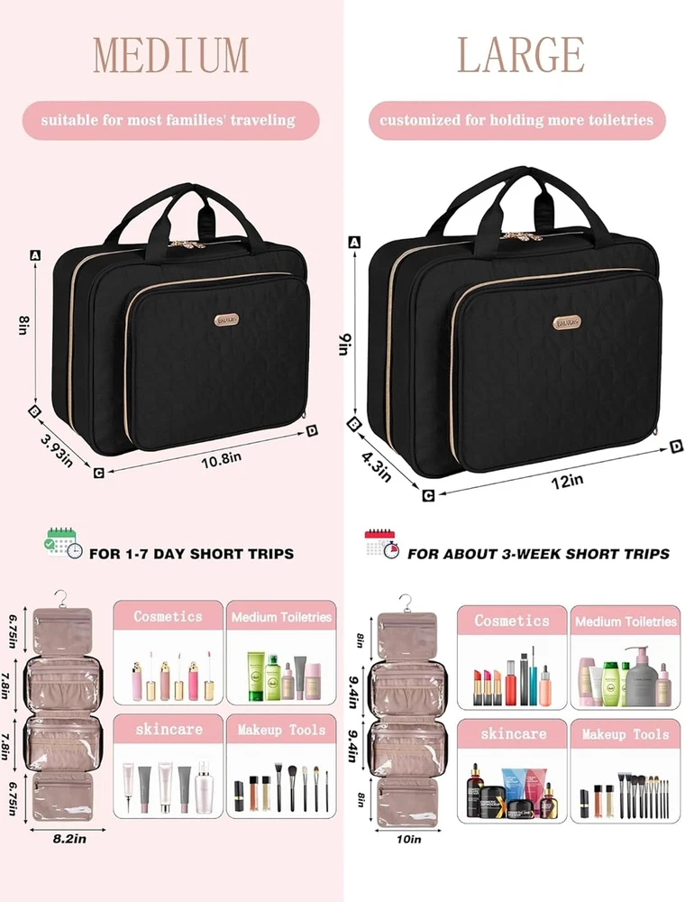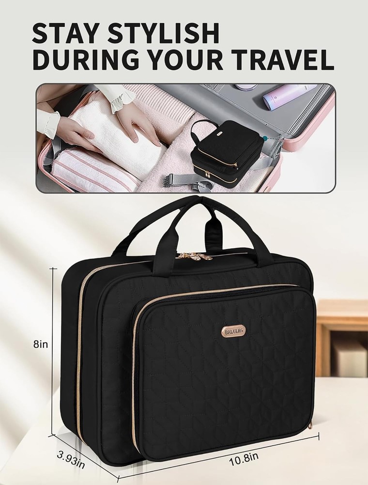 Black Toiletry Bag Travel with Hanging Hook, Water-resistant Cosmetic Makeup Bag Organizer for Shampoo, Full Sized Container, Toiletries Product Details Color: Black Size: Large Brand: BALULHG MPN: 002-L-Black UPC: Does not apply EAN: Does not apply Product Dimensions: 12 x 4.32 x 9 inches Item Weight: 1.14 pounds Department: Womens Manufacturer: BALULHG Country of Origin: China Item model number: 002-L-Black Super Capacity : The Toiletry Bag Travel Organizer, It features 4 separate compartments designed to meet all your travel needs. Hanging Hook : 360-degree swivel non-slip metal hook for versatile hanging options. Special Design : The main pocket inside has elastic bands or mesh, preventing different sized bottles from colliding with each other. High grade material : Made from soft and lightweight materials, the toiletry bag is comfortable to touch and easy to carry, making it ideal for travel. Toiletry Bag : This toiletry bag is perfect for business trips, travel, gym, camping, and home use. Size 12 x 4.3 x 9 inches(rolled)8 x 38.8 inches(open).