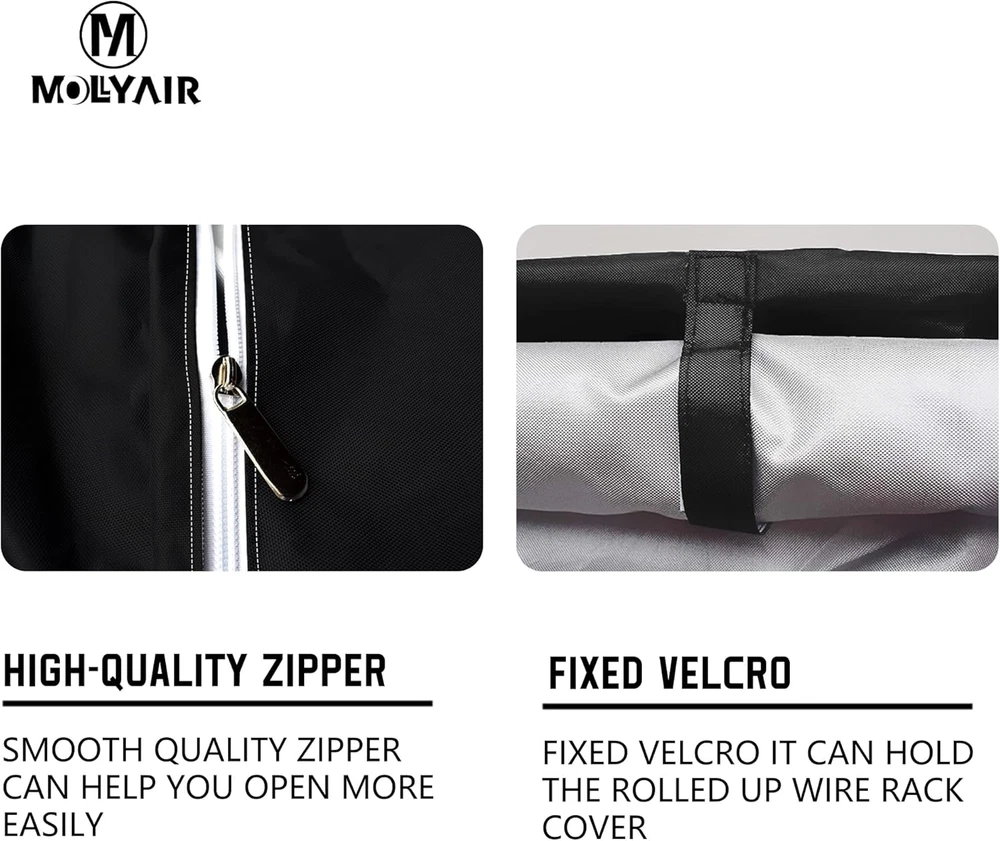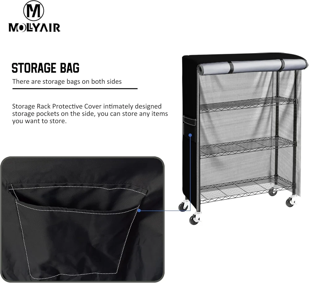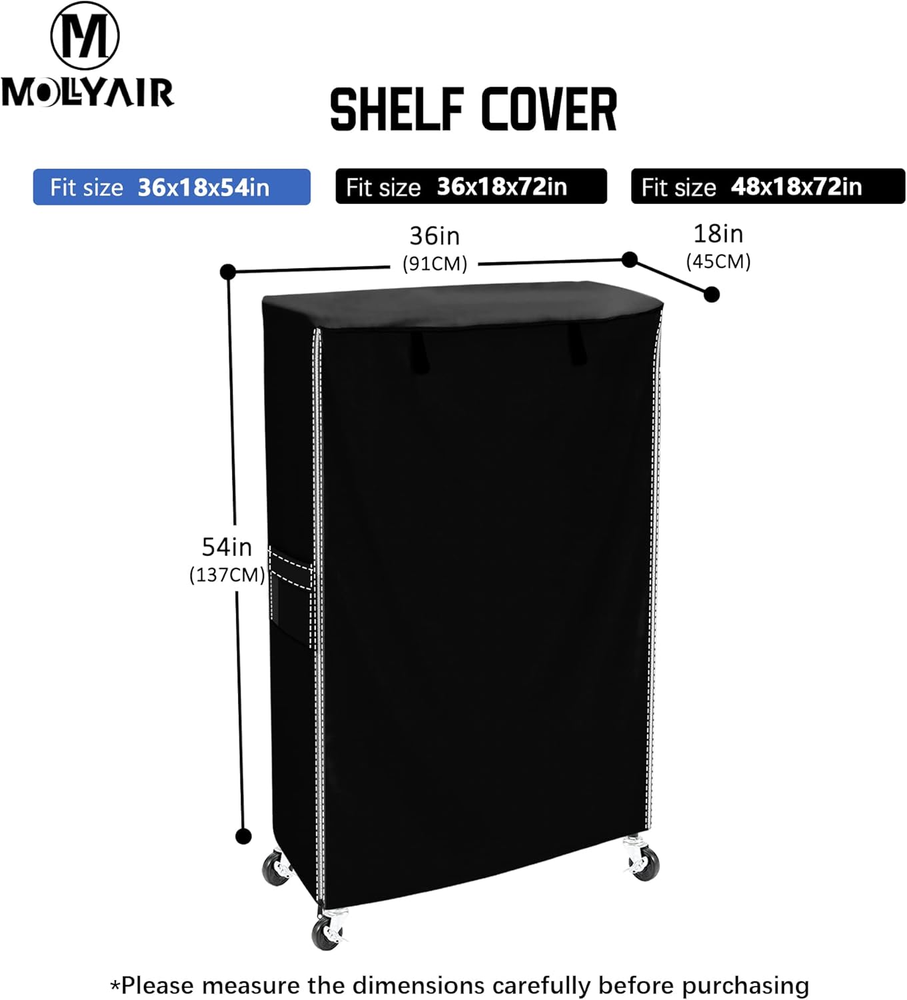 [Custom-Fit Protection for Wire Shelving Units] MOLLYAIR wire shelf cover (36" W x 18" D x 54" H) is tailored to fit most wire racks. Available in multiple sizes and colors to match your pantry, garage, or kitchen shelving. Pro tip: Measure your shelf before purchase – the cover is slightly oversized for effortless installation and removal. Blocks dust, moisture, and UV rays while keeping items easily accessible [Heavy-Duty Waterproof Defense for Wire Racks] Made with 600D Oxford fabric – thicker than standard covers – our wire rack cover resists spills, humidity, and scratches. Ideal for pantry shelving where hygiene is key. Reinforced seams prevent wear, while the waterproof layer stops moisture buildup. Safeguard tools, documents, and kitchen supplies from damage [Smart Zipper + Pocket Design for Clutter-Free Storage] Dual heavy-duty zippers provide full access to your wire shelving without removing the cover. Added side pockets store small essentials like gloves or labels – perfect for busy workshops or basements. Ditch bulky tarps and enjoy organized protection [Secure Fit with Adjustable Hook-and-Loop Straps] Inner and top adjustable straps ensure a snug fit, even in drafty garages or high-use kitchens. Unlike loose elastic bands, our no-slip design eliminates gaps where debris or pests could enter. Roll up the front panel? The top strap keeps it neatly secured [All-Weather Protection for Indoor/Outdoor Shelving] UV-resistant fabric prevents fading and rust on metal or wooden shelves. Use in damp basements, sunny patios, or cluttered workshops – MOLLYAIR’s cover adapts anywhere Product Description Waterproof Fabric The waterproof coating applied on the surface creates a barrier that repels water. Smooth Zipper A reliable zipper closure system ensures smooth and easy operation even in frequent use. Black Pocket Side black pockets can hold small items to increase your storage space. Top Velcro The top two velcro secure the front cover to meet retrieval needs and are easy to bond. Internal Velcro Internal Velcro makes the cover more snug to your wire shelf. 1 Waterproof Fabric 2 Smooth Zipper 3 Black Pocket 4 Top Velcro 5 Internal Velcro