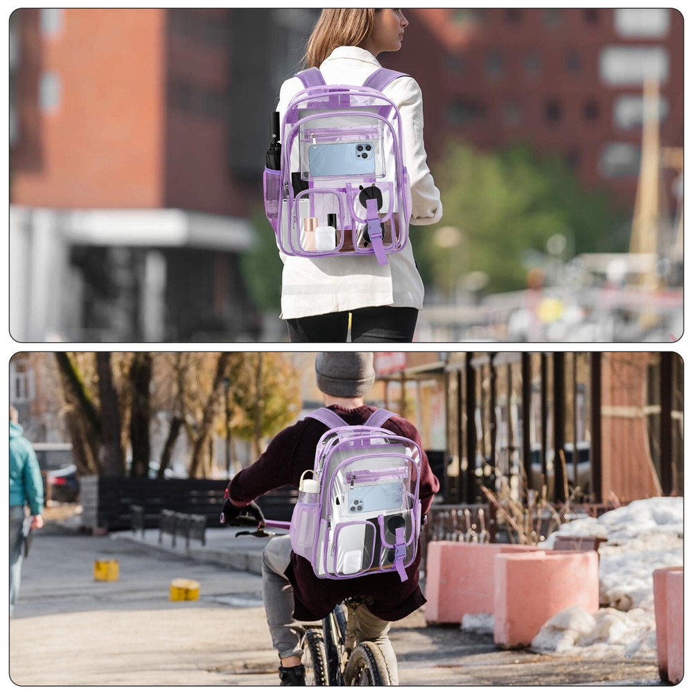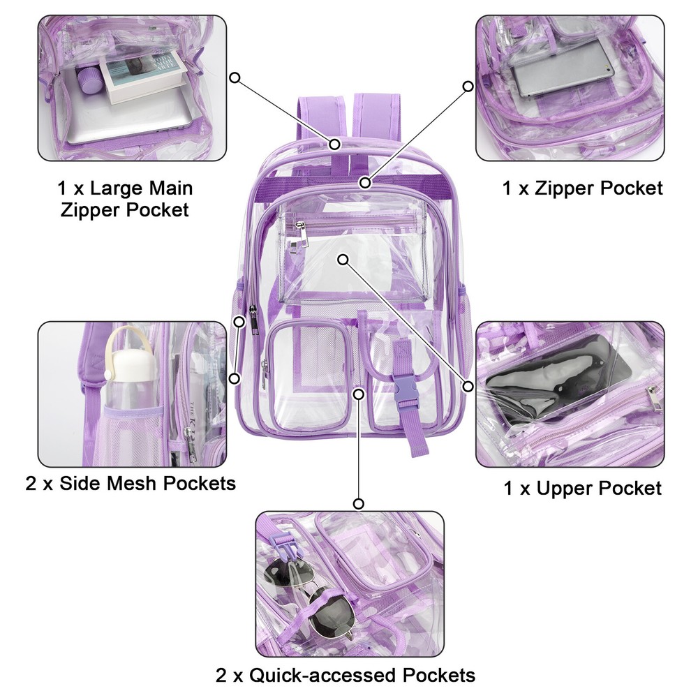 Product Description This waterproof clear backpack is crafted from heavy-duty materials, offering durability and security. Perfect for school, work, or events, it features a see-through design and spacious compartments for men and women. Product Feature π Clear PVC Material: thicker and smell-less, durable and sturdy. π Wide Shoulder Strap: can release the stress from heavy stuff. π Waterproof Fabric: protect inside items dry from rainy and snowy day. π Stadium Approved: suitable for sport event, traveling, concert, college, work. π 1 Large Main Double Zipper Pocket: for binders, laptops, books. π 1 Front Zipper Pocket: for book, phone, extra items. π 2 Small Front Zipper Pockets: for earphone, charger, pen, easy access. π 2 Side Mesh Pouches: for water bottles or folding umbrellas. Product Specification Type Clear Backpack Color Purple Bag Size 16.1 x 12.5 x 5.1" Strap Size can be adjusted from 16" to 30" Material PVC Package Included π1 x Waterproof Clear Backpack Location Descriptions To improve your buying experience and ensure fast delivery, Your order will be shipped from the warehouse located in either new jersey or california that is closest to your address. If you have any questions, Please contact us. Thank you for your support !