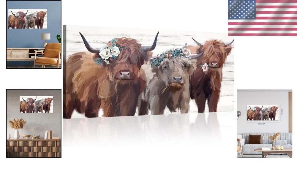 Mounting Type: Wall Mount Pattern: Floral Package Type: Ffp Material: Canvas, Wood Item Shape: Rectangular Subject: Cow Color Family: Brown Indoor Outdoor Usage: Indoor Seasons: Winter, Summer, Fall, All Seasons, Spring UPC: Does not apply Artist: Unknown Theme: Art Size: Large Special Features: Waterproof Customized: No Department: Adults Frame Material: Wood gtin13: Does not apply Frame Type: Wrapped Canvas Paint Type: Acrylic Item Width: 40 in Wall Art Form: Painting Item Height: 40 in Cover Material: Canvas Recommended Uses For Product: Wall Hanging, Home Style: Rustic Paper Finish: Watercolor Room: Any Room, Bathroom, Kitchen, Living Room, Bedroom, Dining Room Era: 21st Century (2000-Now) Number Of Items: 1 Orientation: Horizontal Brand: Unbranded Personalize: No Color: Brown Signed: No Features: Ready To Hang, Framed, Waterproof, Easy to Hang Additional Parts Required: No Finish Type: Matte Item Length: 20 in Type: Painting Age Range Description: Adult Care Instructions: Easy Care Item Weight: 1 lb Animal Theme: Cow