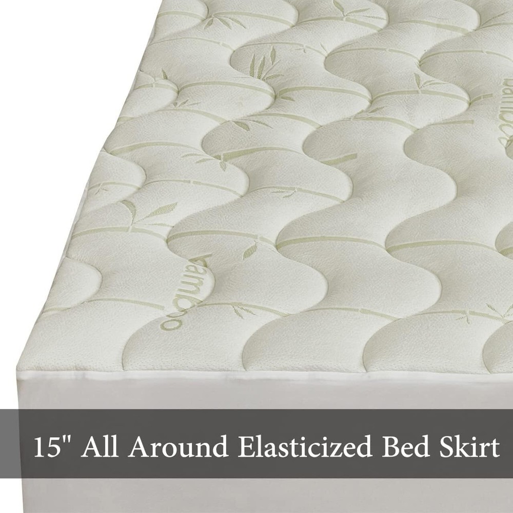 40% Rayon derived from Bamboo, 60% Poly Jacquard Fitted Mattress Pad, filled with 100% Polyester Hypoallergenic Clusters Waterproof Breathable soft fabric, cools down your body temperature then provides you with a luxurious feel Features a stitched Wavy Shape Design to keep filling in place. Fitted Sheet Style Mattress Pad with elastic all the way around, fit up to 15 Inch deep. Split top King Size Mattress Pad 78 x 80 Inches, 32 Inches Head Split. Machine wash in cold water