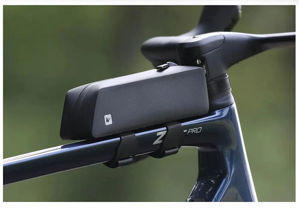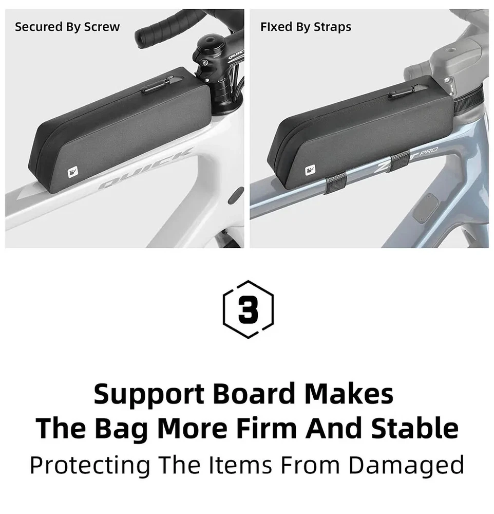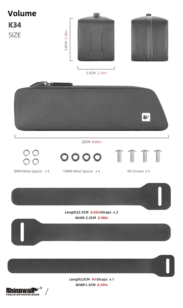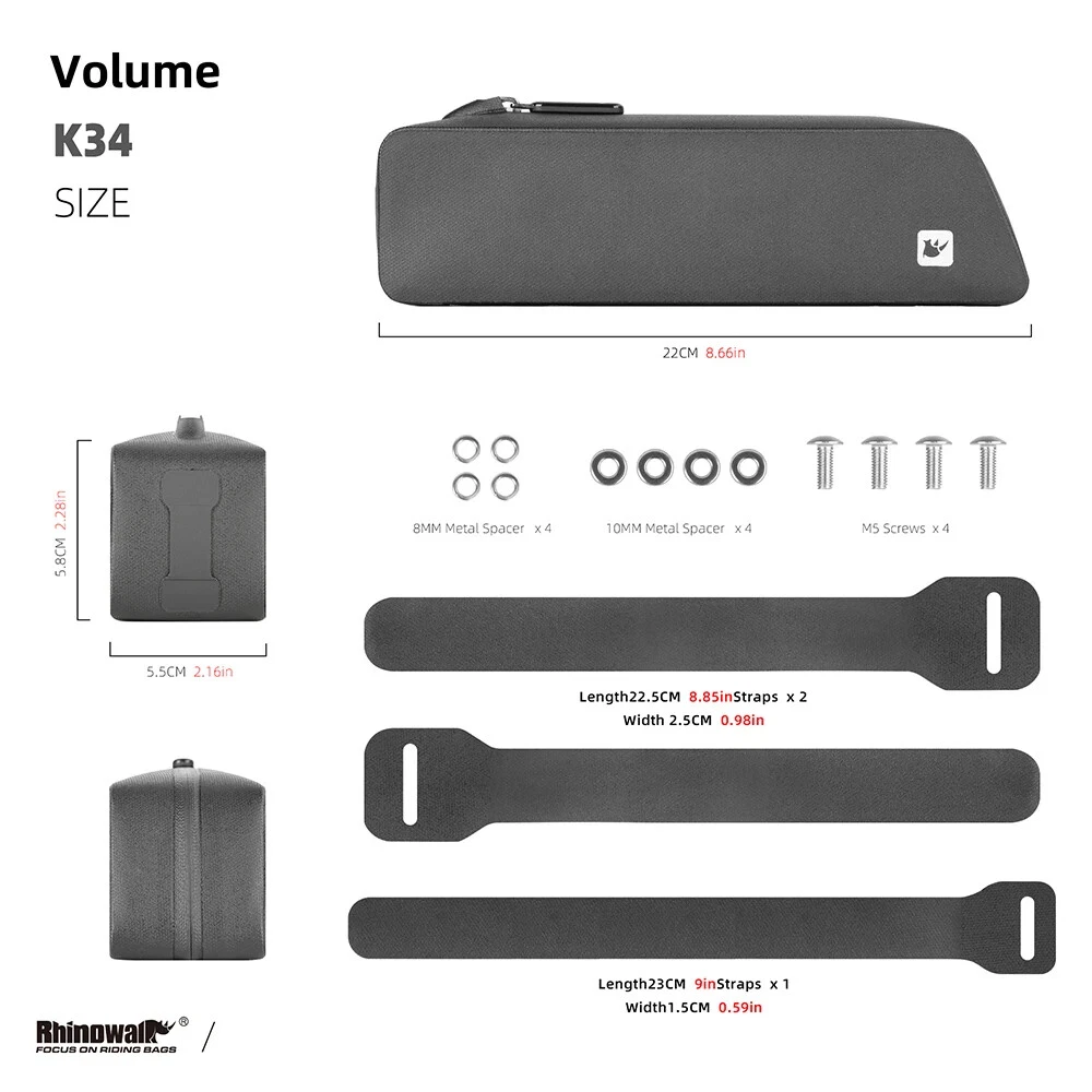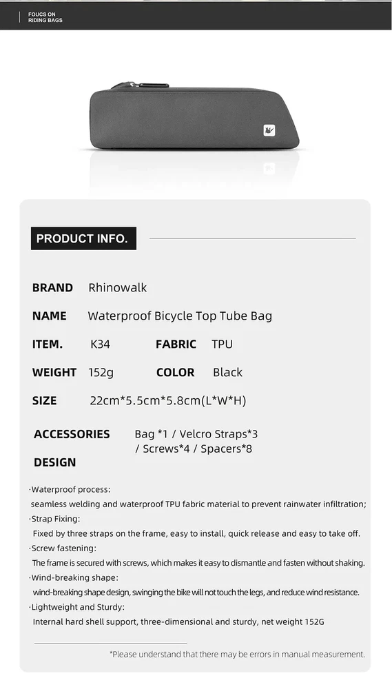 NAME:Waterproof Bicycle Top Tube Bag ITEM:K34 FABRIC:TPU WEIGHT:152g COLOR:Black SIZE:22cm*5.5cm*5.8cm(L*W*H) ACCESSORIES:Bag*1/ Velcro Straps*3/ Screws*4/ Spacers*8 Waterproof Process: Utilizes seamless welding and waterproof TPU fabric material to prevent rainwater infiltration effectively. Strap Fixing: Installed securely with three straps on the frame for easy installation, quick release, and effortless removal. Screw Fastening: The frame is firmly secured with screws, ensuring easy dismantling and fastening without any shaking. Wind-breaking Shape: Designed with a wind-breaking shape to prevent interference with the rider's legs and reduce wind resistance. Lightweight and Sturdy: Features internal hard shell support for a three-dimensional and sturdy structure, with a net weight of about 152g.