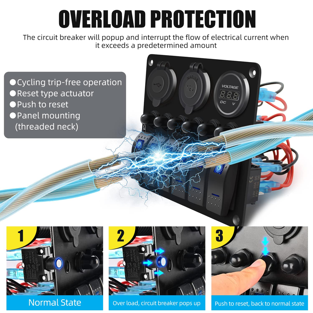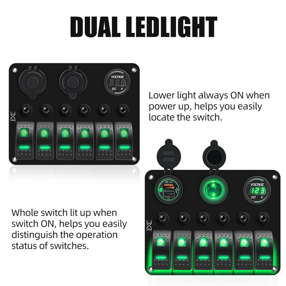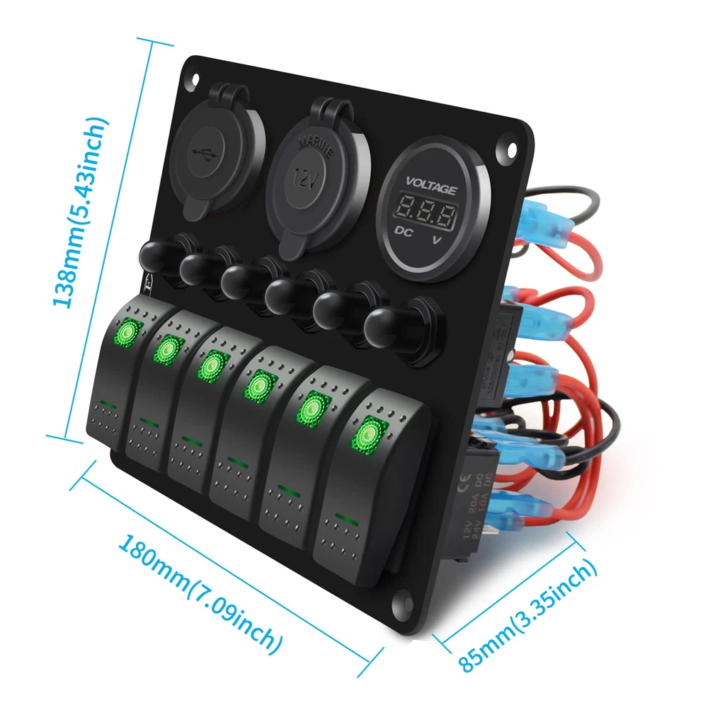 Store New Arrivals Add to Favorite View Feedback Contact Waterproof Marine Boat Rocker Switch Panel 6 Gang with QC3.0 USB & Type-C Slot Socket + Cigarette Lighter +LED Voltmeter with Overload Protection for Car Rv Vehicles Truck (6 Gang Green LED) Description Item dimensions L x W x H 7.1 x 3.4 x 5.4 inches Current Rating 15 Amps Operating Voltage 24 Volts Mounting Type Panel Mount Color Green Product Dimensions 7.1 x 3.4 x 5.4 inches; 1.23 Pounds Connector Type Usb Terminal Marine Operation Mode Off Actuator Type Rocker Contact Type Normally Open Switch Type Rocker Material Abs,Aluminum,Rubber 【6 Gang Green LED Lights Switch】 Rocker Switch + Rubber cover for USB port and cigarette slot, premium aluminum panel make it stronger. 【Votage meter & Dual USB Ports】 Working Voltage DC12V/24V, Output: DC 5V QC3.0 USB & Type-C 【Multi-Protection, More Secure】 Circuit breakers for each switch seperately for short circuit protection, overload protection, reverse polarity protection, and multiple protection, more secure to use, very convenience for driving. 【Applicable Widely】Designed for controlling all car devices for on / off, fits for all 12/24V Vehicles Boats Yacht Cruises Speedboat Cockpit Bus Rvs Jeep SUV Lorry Truck. 【Top service】With our strict quality control system, we test each item and 100% ensure in good condition before we ship. Enjoy 1 year quality warranty under regular use. Offering customer technical service, feel free for any questions about products technology, installation and use. Product Description FXC 6 Gang Rocker Switch Panel with Overload Protection FXC Multi-Functional Waterproof 6 Gang Switch Panel LED Backlit: Blue/Red/Green Material: Aluminum Plate; Switch: ABS + PC Voltmeter Display range: DC 6V- 30V PD Type C and USB Socket Output:5V DC; 3.1A Cigarette Lighter: DC 12V Reset Circuit Breakers: Each 15A Switch Type: SPST: ON-OFF Installation: Pre-wired Over Load Protection There are 6PCS 15A circuit breaker on the panel. Working Principle: this switch can be reset after a disconnect over a period of time, then you can press the reset switch to use it again When load exceeds rated current, the switch reset button will automatically cut off the circuit, and thus play a role in protecting the line. Product details 3.0 USB ports + Type C ports Material: ABS plastic(flame resistant) Input voltage: 12-24V DC Output voltage: 5V DC Output current: 6.2A (3.1A + 3.1A) LED Voltmeter Material: ABS plastic(flame resistant) Working range:12-24V DC You can now monitor the battery voltage in real time. Cigarette lighter socket Material: ABS plastic(flame resistant) Input voltage: 12 - 24V DC Output voltage: 12V DC On/Off (SPST) rocker switch DC 12V 20A DC 24V 10A Material: ABS plastic(flame resistant) Mechanical Life: switch 50000 times Pre-wired This switch panel is pre-wired in series in all components. This make the wiring become easily. Easy to connect or disconnect Just plug for connection; Press the buckle and pull for disconnection. ABOUT US We offer the best prices around on high quality products. Our E-store includes media such as books, movies, music and games while offering electronics, toys, sporting apparel, clothing, tools, general home, garden items and more. SHIPPING We are always working hard to ensure your package arrives as soon as possible. Please understand that some factors like weather, high postal traffic, and the performance of shipping companies are outside of our control. We offer free shipping to the lower 48 states and ship within 2 business days of payment, usually sooner. We do not accept P.O. Boxes. Please provide a physical address. For shipping outside of the continental USA, we only use eBay's Global Shipping Program.The item is shipped to KY and then sent to the rest of the world. International customers are responsible for all duties and taxes. Continue to check out in order to calculate costs for shipping the item to your country. Messages regarding eBay's Global Shipping Program MUST be directed at eBay EXCLUSIVELY. RETURNS We offer a 30-Day Return Policy on items which you are not completely satisfied with. You have the option for a full-refund or an exchange of the item. No returns are available on items shipped outside of the USA. PAYMENT We accept PayPal. CONTACT US This page content is yet to come Please ad us to your favorite seller and visit again later Thank You CUSTOMER SATISFACTION We try our very best to make sure every customer is completely satisfied. If there's a problem, message us! We're happy to help. WE ACCEPT Copyright © 2021 AutoDS. | All Rights Reserved
