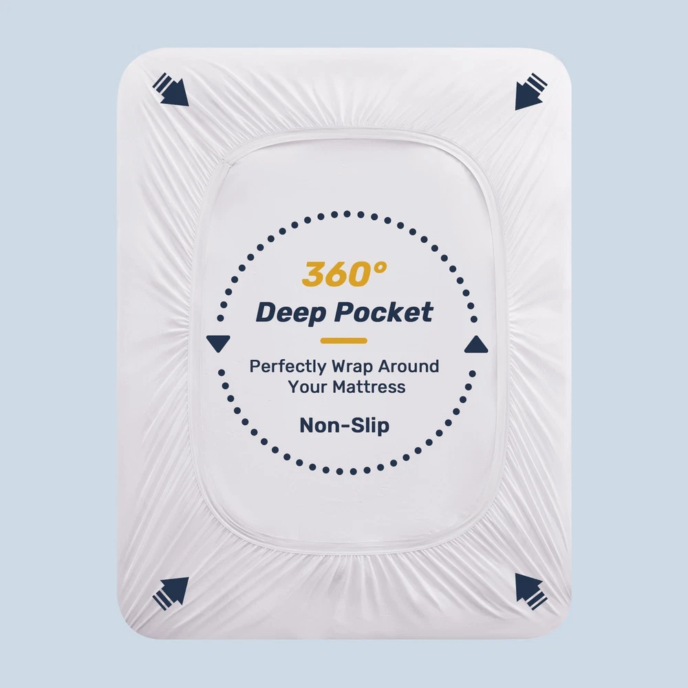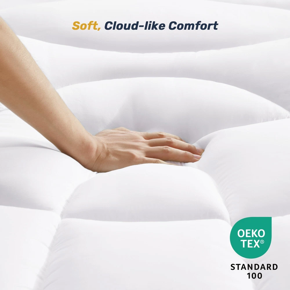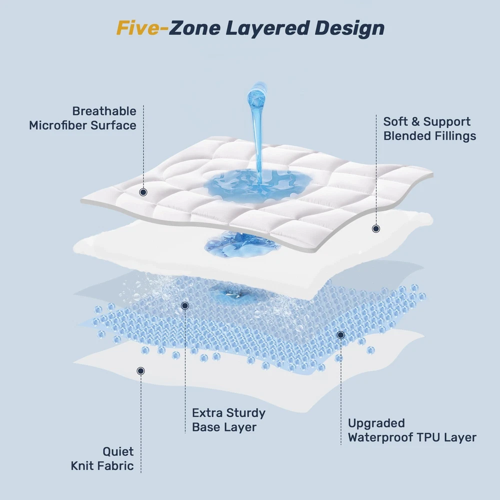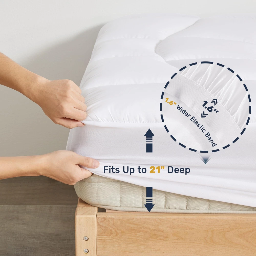 Ergonomic Comfort: Experience ultimate comfort with our ergonomically quilted queen mattress pad. Its specially designed-stitching contours your body, providing gentle support that soothes muscles and eases tension. Enjoy a relaxing sleep environment with our white queen mattress topper that helps reduce stress, waking you up refreshed and recharged every morning. Five-Layer Design: Our 5-layer waterproof mattress pad queen offers the perfect balance of comfort and durability. The breathable microfiber surface keeps you cool, while the soft, supportive Blended fillings provide plushness without sacrificing support. An extra sturdy base upgraded waterproof TPU layer, and quiet knit fabric ensure lasting protection and a peaceful night’s sleep. Quiet Waterproofing: Stay comfortable and protected with our waterproof mattress topper queen, designed for a peaceful and restful sleep. The advanced 100% waterproof layer keeps spills and stains at bay without the crinkling sounds of traditional waterproofing so you can enjoy a quiet, undisturbed night in soft, cozy comfort with our queen mattress protector waterproof. Perfect Fit: Our white mattress pad queen size offers a secure and convenient fit with its 360° full-wrap design and deep pockets that accommodate mattresses up to 8"-21" thick. The 1.6" high-elastic, extra-wide straps ensure a snug, slip-free fit, making installation a breeze. Our queen mattress cover is available in a complete range of sizes to perfectly complement any bed. Easy Care: Our queen size mattress protector is simple to care for—toss it in the washing machine on a gentle cycle with cold water. Tumble dry on low heat (below 105°F). Do not dry clean, iron, or use bleach. Since it's vacuum-packed, allow the queen size mattress toppers to air out for at least 12 hours to fluff up.
