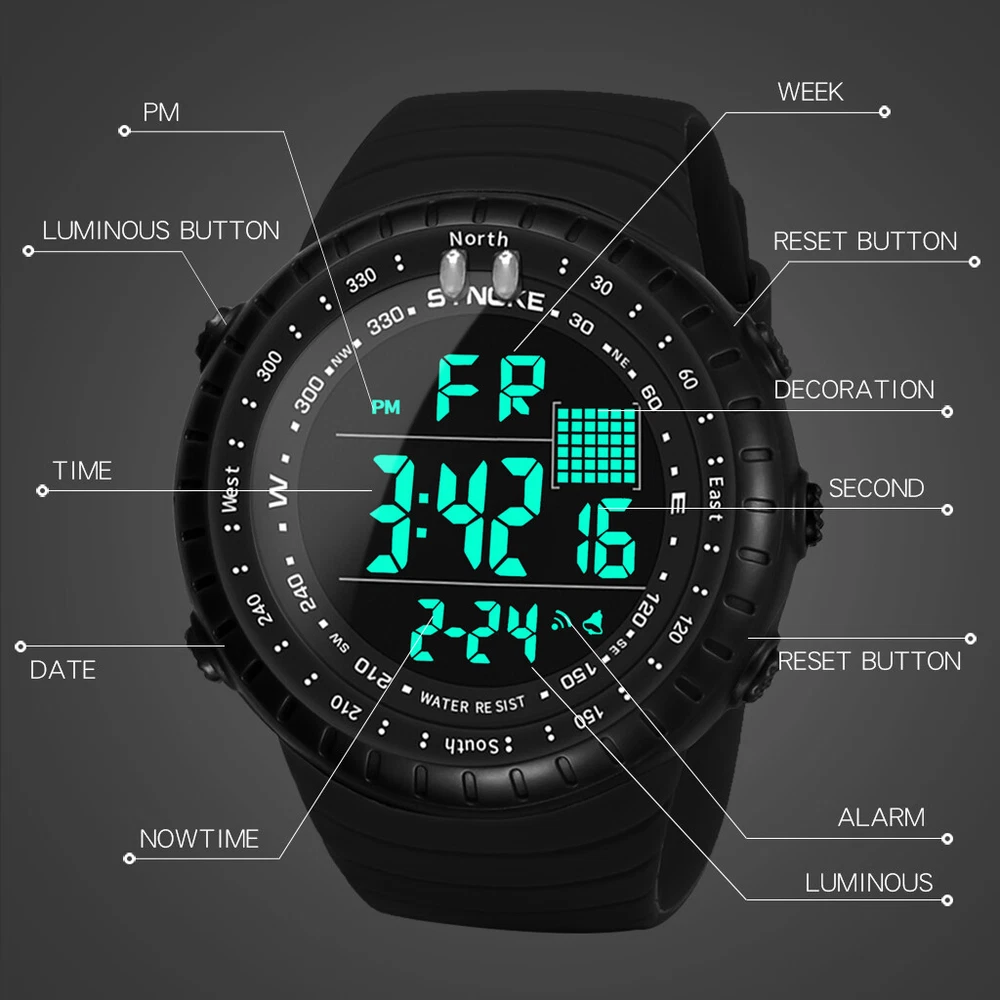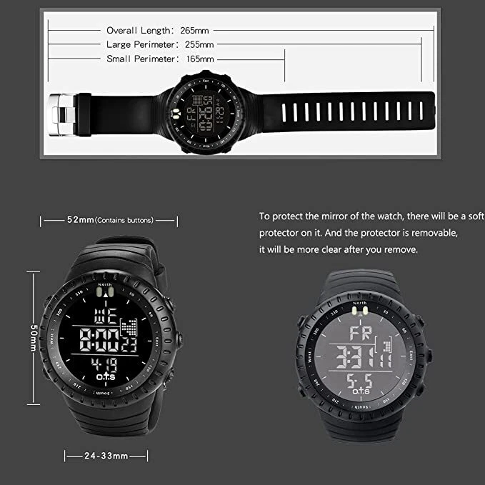 Product Fea tures: Digital Watch: Fashionable sporty dial design, military-style outlook. Large Dial and numbers with light, show time clear in the dark. Use import EL Lamp, Press "LIGHT" button to see the time clearly in the light, easy to read. Men's Sports Watch: Suitable for men, especially to those who like doing sports, ideal for running, swimming, hiking, fishing, and other outdoor and indoor sports. High-quality Watch: Senior rubber band, comfortable to wear. The dial window is made of acrylic mirror, high transparency, compressive, and abrasion. Waterproof Grade:164 Ft / 30 M water resist, Please DO NOT press any buttons underwater, and in case of damaging waterproofing, not suitable for long time underwater activities such as diving, please keep it away from steam and hot water. Multi-Functional: LED backlight, 1/100 second digital stopwatch, auto calendar, hourly alarm and alarm clock, shock resistant, 12/24 hour formats, Water-resistant. Best Gift: This watch blend goes with every occasion be it formal or casual. Wear this watch on the go, from leisure to indoor and outdoor activities or for daily use. It will be a good present to your father, husband, big boy, boyfriend and business partner. Package Included: 1*Men Wallet
