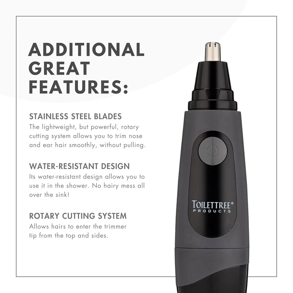 This high-end cordless battery-operated nose trimmer with bright LED light is made with a soft rubber grip finish; the light comes in handy when you need to get at those hard-to-reach and hard-to-see hairs. The lightweight, but powerful, rotary cutting system allows hairs to enter the trimmer tip from the top and also from the sides, which is very helpful for stray hairs not only in the nose but also on your eyebrows, beard, and ears Right out of the box, you will feel the difference, precision, and quality of this trimmer; it offers a smooth trim with its stainless steel high quality blades and gives you a perfect cut every time; no painful pulled hairs Our best water resistant design allows you to use this trimming tool in the shower and it makes clean-up afterwards quick and easy; it's the best trimming and cutting tool you'll ever experience from a men's clipper product This nose trimmer operates on 2 AA batteries (not included), which makes it an economically affordable way to take care of the daily trimming needs of your nose, brows, and ears