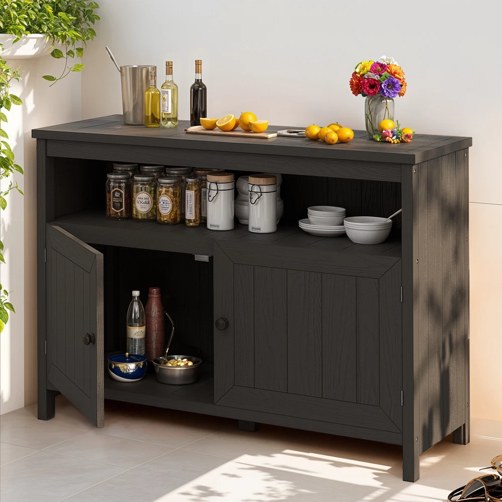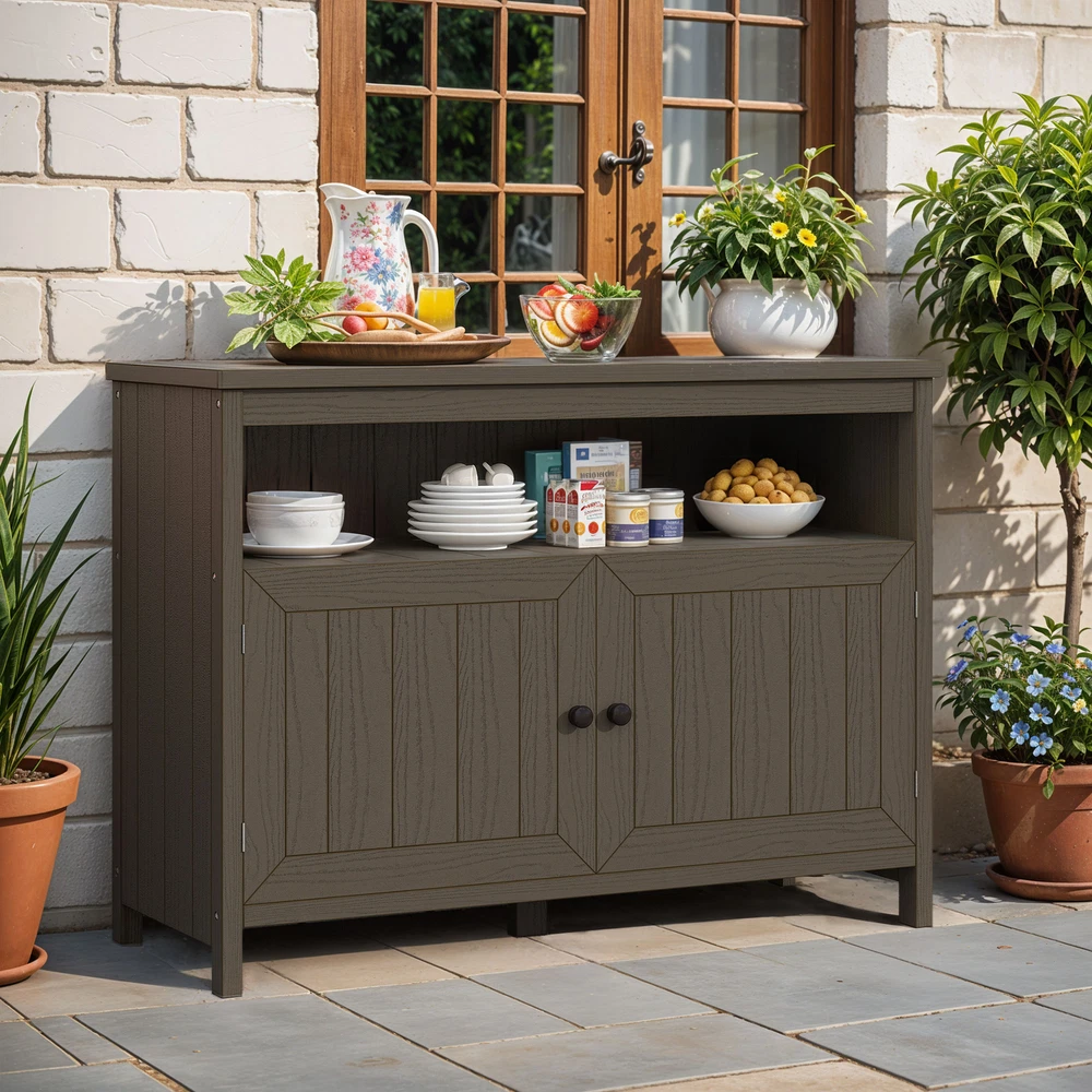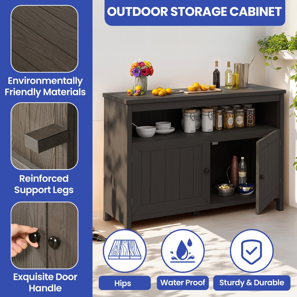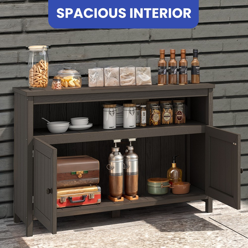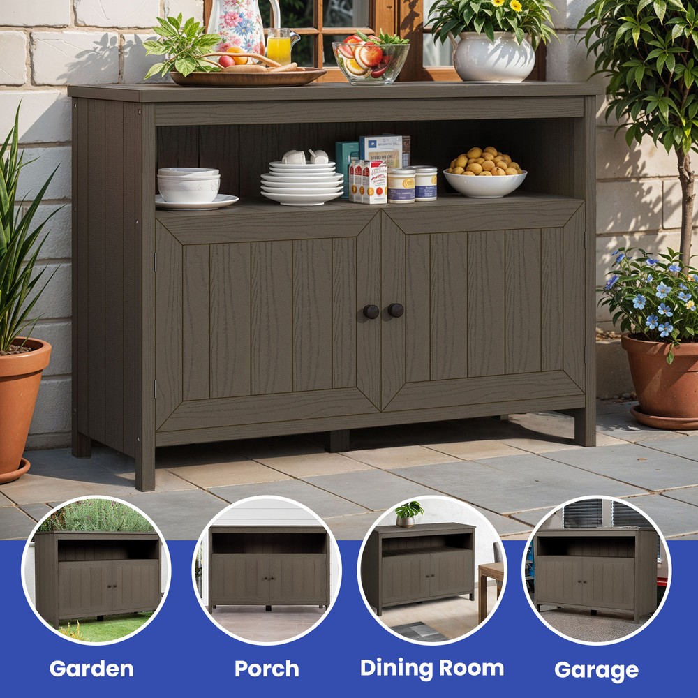 Storage Cabinet Table Wooden Sideboard Buffet Waterproof Patio Garden Garage Product Description NOTE: Professional Installation would be Highly Recommended. Description: 1. Color: Brown 2. Material: Wood, HIPS, Plastic 3. Hardware: 304 Stainless Steel Screw 4. Room Type: Outdoor, Patio, Porch, Dining Room 5. Special Design: Durable outdoor storage cabinet with weather-resistant HIPS plastic wood , ample storage space behind 2 doors , reinforced support legs for stability , versatile design as a console, TV stand, or storage unit , and quick, easy assembly with included hardware . Features: 1. Waterproof & Weather-Resistant – Built for Outdoor Use : Crafted from high-quality HIPS plastic wood , this outdoor storage cabinet is designed to withstand rain, sun, and changing weather conditions . The durable, waterproof material resists warping and rotting, ensuring long-lasting beauty and functionality for your patio, porch, or deck. 2. Spacious Storage – Organize with Ease : Featuring two large doors , this cabinet provides ample space to keep garden tools, BBQ accessories, pool supplies, or patio essentials neatly stored. Its sleek and practical design ensures everything stays protected and easily accessible while maintaining a clean and stylish outdoor space . 3. Versatile Multi-Purpose Design – More Than Just Storage : This outdoor cabinet is more than just a storage solution—it doubles as a console, TV stand, or functional utility cabinet . Its modern aesthetic and sturdy construction make it a seamless addition to any patio, porch, or even indoor space for multipurpose use. 4. Sturdy & Reinforced – Built for Stability : Engineered with reinforced support legs and premium 304 stainless steel screws , this cabinet offers enhanced durability and structural integrity . Whether storing heavy items or using it as a functional surface, it provides reliable support and long-term resilience . Dimensions: 1. Product Dimensions: 44.1" L x 16.5" W x 32.3" H 2. Item Weight: 65 lbs 3. Item Depth: 15.4" Package Included: 1. Garden Table 2. Instruction Manual Book Shipping 1. Normally the item will be dipatched within 1 business day if payment is cleared before 12pm PST. 2. Please verify the correct shipping address in your PayPal account before making the payment. We only dispatch the item to the address that is sent to us at the time of checkout. 3. We don't ship to Hawaii, Alaska, Puerto Rico, APO/FPO/PO Boxes. 4. We don't provide local pick-up service. 5. Normally we will use USPS, UPS, FedEx & LTL to dispatch items. Payment 1. We accept PayPal and credit card. 2. We will ship to the confirmed Paypal shipping address that is provided with the payment only. Return 1. 30 days Money Back Guarantee. 2. Please contact our customer service to receive a RMA form first if want to return the item. 3. All returned items MUST in new condition with the original package. Contact If has any problem, please contact us by sending an ebay message. Our customer service will resolve the problem as soon as possible. On Feb 19, 2025 at 02:13:20 PST, seller added the following information: