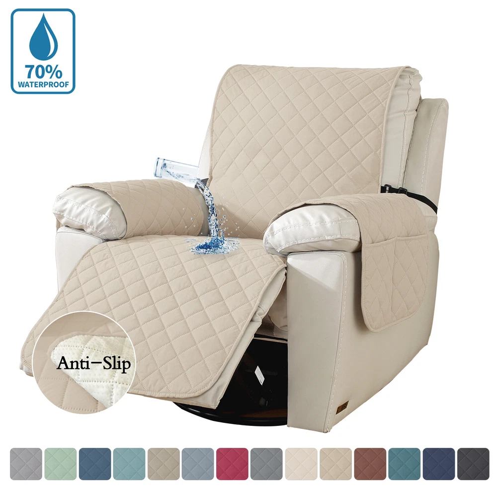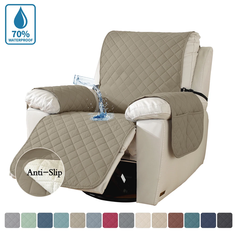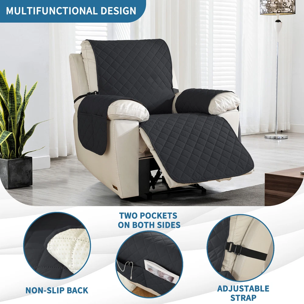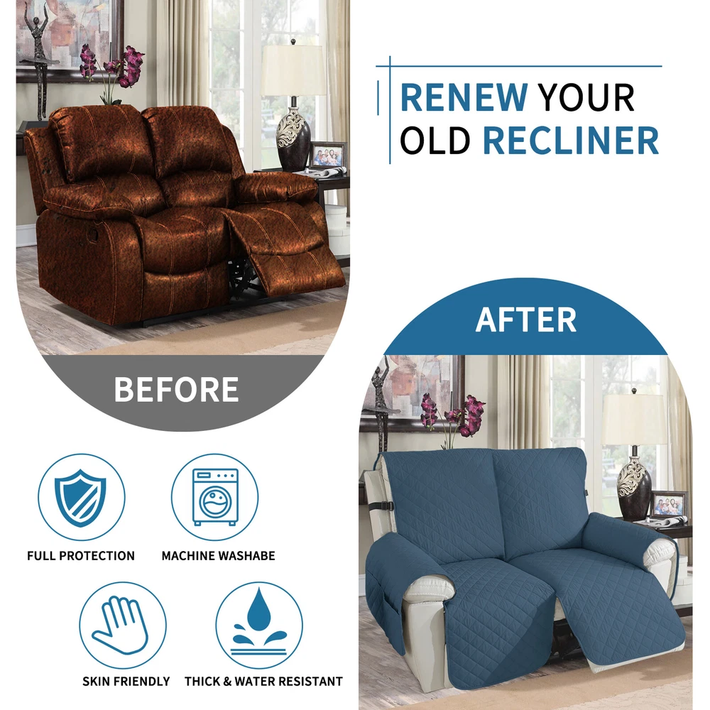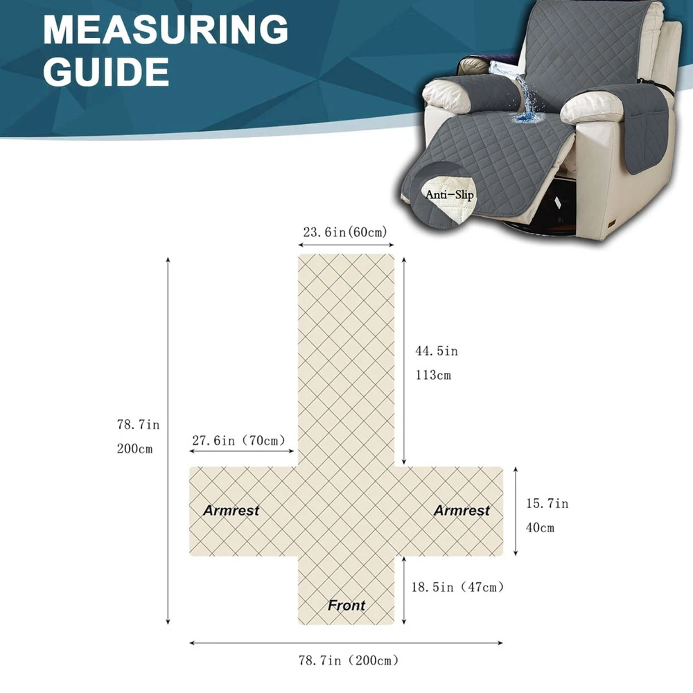 COMFORTABLE FABRIC: This recliner cover is made of high-quality fabric, which is comfortable and does not irritate the skin. This recliner cover fits recliner sofas with a recliner width of 23 inches, please measure your sofa before purchasing. Anti-slip design: There are anti-slip rubber particles on the back of the recliner cover, which increases friction and is not easy to fall off. And the recliner cover has an elastic straps, which can fix the recliner cover to the recliner nicely. The head and arm lengths of the recliner cover have also been extended. PROTECT YOUR RECLINER: This recliner cover is made of 100% waterproof fabric, perfect for protection from splashes, pet fur, normal wear and tear or any possible accident. It protects your recliner well and gives your old recliner a new look. EASY INSTALLATION: This recliner cover is easy to install and takes less time. Simply drape the recliner cover over the recliner, tie the elastic straps, and tuck any extra fabric into the gap. You can install it very well. EASY CARE: This recliner cover is directly machine washable and tumble dry. Please wash at around 30 degrees Celsius. Do not bleach. Do not iron.