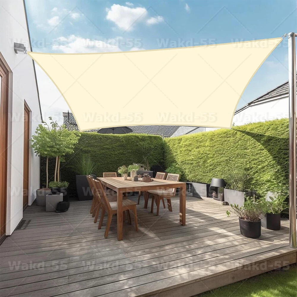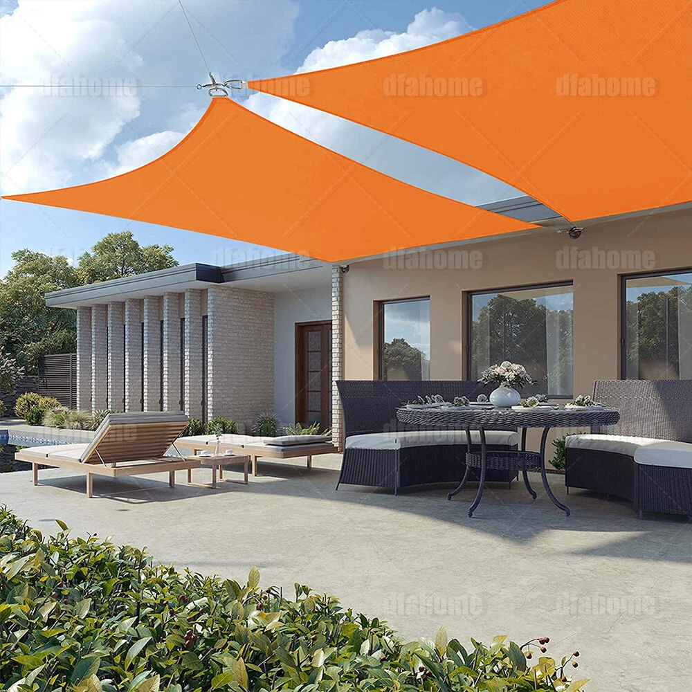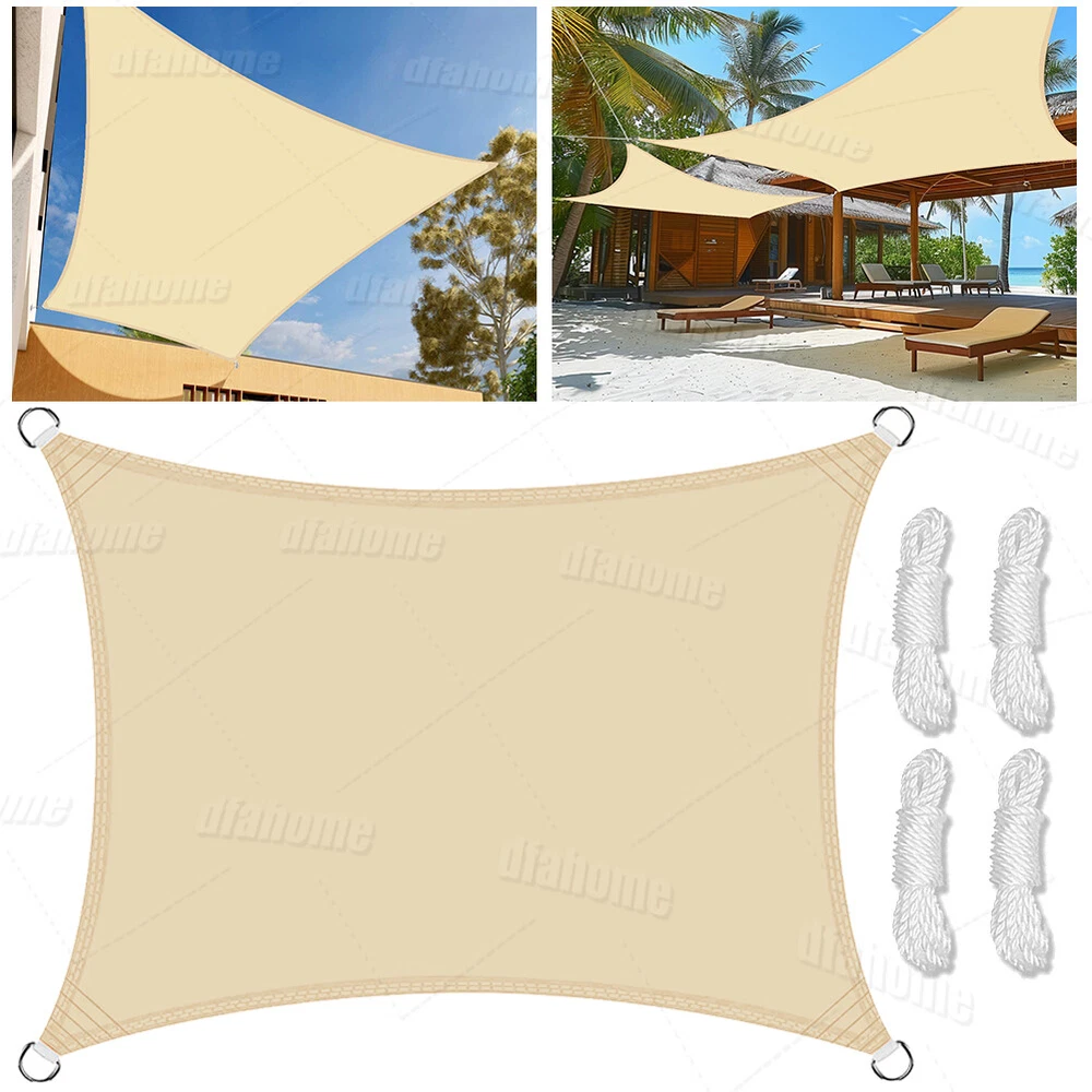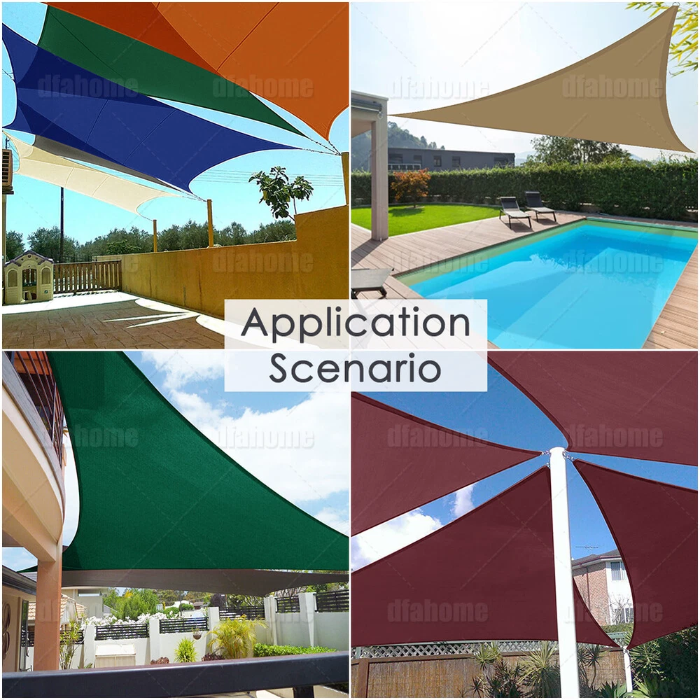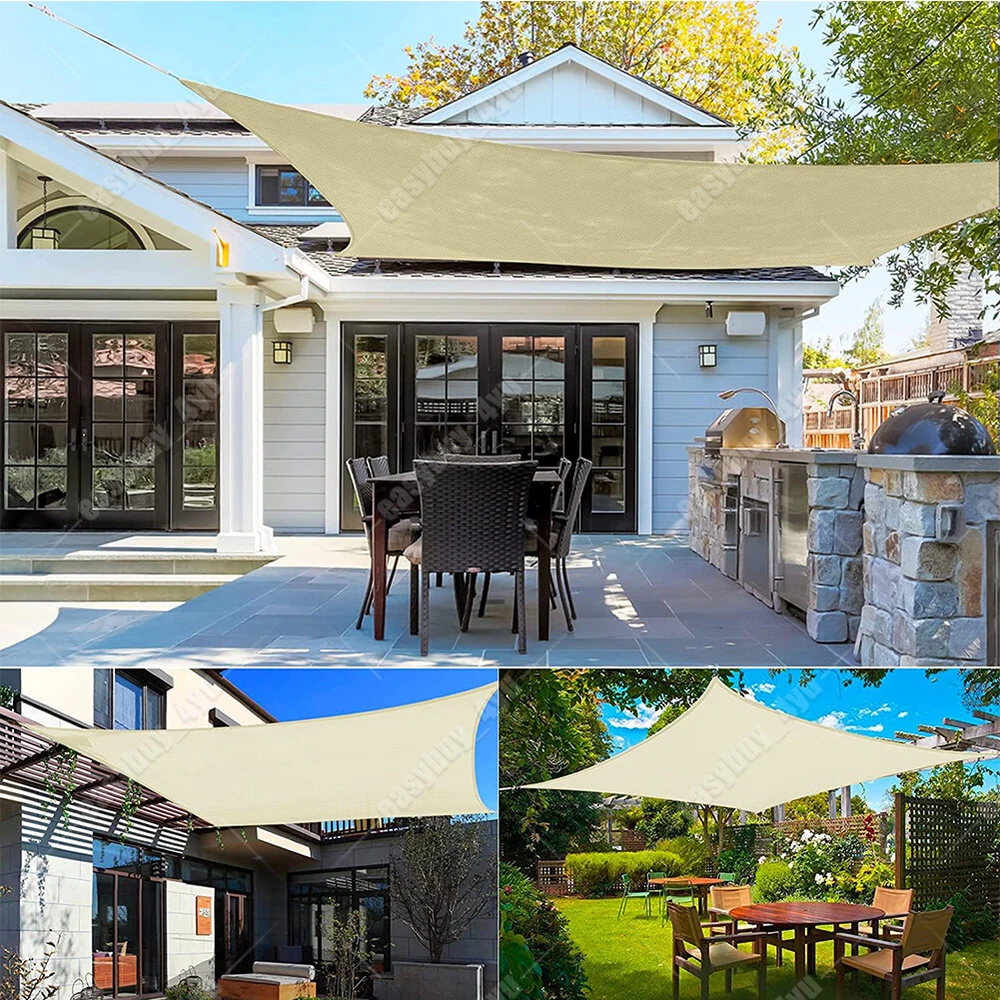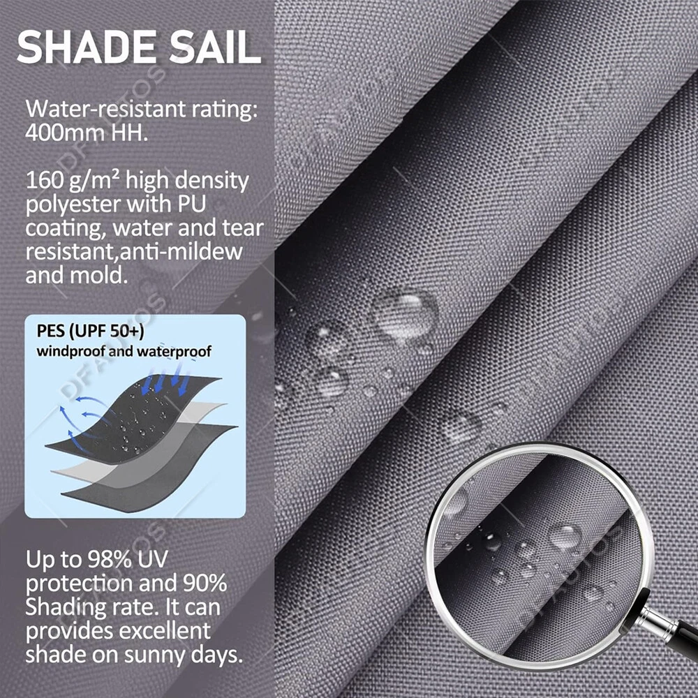 Descriptions: The Waterproof Sun Shade Sails Perfect for gardens, patios, swimming pools, BBQ areas and etc. Give you a cool and comfortable experience in the hot summer. It can also create a good mood for you in Rainy days. 【WATER RESISTANT】Sun shade sail is 300D high density polyester fabric with PU coating(160 g/m²), can withstand 2000MM water pressure. It's tear resistant, waterproof and weatherproof. But we don't suggest to use shade sail in heavy rain, continuous heavy rain may cause slight water seepage. 【MULTIFUNCTIONAL & DURABLE】Double stitched edges and reinforced corners, making both sides more robust. Our solar sail is suitable to be used in garden, backyard, patio, courtyard, carport, pergolas, swimming pool, balcony, terrace, camping trip, lawn or another outdoor area. Protecting your privacy safe. 【EASY TO INSTALL】Durable anti-rust D-ring is placed at the edge of the four corners, you can use ropes or fixing kits easily to fix it. We recommend that you adjust the angle of the garden shade sail to 20-40 degrees, it needs a certain angle to drain the rain to avoid damage the product due to excessive water. 【UV PROTECTION】Our outdoor awning can block 95% harmful UV. It can provides excellent shade on sunny days/rain days, give you a wonderful space to enjoy your time. 【PAKAGE CONTAIN】You will get Awning Canopy x1, Ropes x4/3 . Specification: Type: Waterproof shade sails Material: 300D Oxford cloth Material of D-Rings: Stainless Steel Color: Grey, Cream, Beige, Orange, Blue, Anthracite, Sand, Green, Terracotta Shape: Rectangle/Triangle/Square Ropes Length : 1.5m / 4.92 ft Features: Stainless Steel D Rings, Waterproof Waterproof Materials 160 gsm high density polyester with PU coating, water and tear resistant. The material is waterproof and can be protected from water even on rainy days. The material is more sturdy, thick fabric and braided rope, good windproof effect. High Quality Materials 95% UV protection Strong and high-quality materials, can be used in sunny and rainy days, not recommended for use in bad weather UV Protect This sun shade sail has a sunscreen coating that effectively prevents UV rays, blocks the sun, and prevents tanning.95% anti-UV effect, effectively blocking UV rays. Multiple Sizes in Varied Shapes: ## Triangle Sun Shade Sails Size ## 2 x 2 x 2M / 6.56 x 6.56 x 6.56 FT 3 x 3 x 3M / 9.84 x 9.84 x 9.84 FT 3.6 x 3.6 x 3.6M / 11.81 x 11.81 x 11.81 FT 5 x 5 x 5M / 16.40 x 16.40 x 16.40 FT ## Rectangle Sun Shade Sails Size ## 2 x 3 M / 6.56 x 9.84 FT 2 x 4 M / 6.56 x 13.12 FT 3 x 4 M / 9.84 x 13.12 FT 3 x 5 M / 9.84 x 16.40 FT 4 x 5 M / 13.12 x 16.40 FT 4 x 6 M / 13.12 x 19.68 FT ## Square Sun Shade Sails Size ## 2 x 2 M / 6.56 x 6.56 FT 3 x 3 M / 9.84 x 9.84 FT 3.6 x 3.6 M / 11.81 x 11.81 FT Package include 1x Waterproof shade sail with 3/4 Ropes The edge of the shade sail is curved, and the actual use area is about 10% less than the measured area. Please purchase with cautious,thank you. 【How-To Install a Shade Sail 】 The shade sail came with D ring & Wind ropes for you to be able to make the connections to the house/trees/other structure pretty easily. If you want to strengthen the fixing, you can buy a set of hardware from our store. How-Totighten the rope after installation/Buyer's Experience Sharing From the opposite corners, I assembled the proper length of wire rope with the thimble and clamp for the end, and attached to eye bolts in the trees with a turnbuckle to tighten the span. Once I had these four anchor points established and installed, the shade sail was in the proper position and I could tighten all four anchor points to get the desired tension.