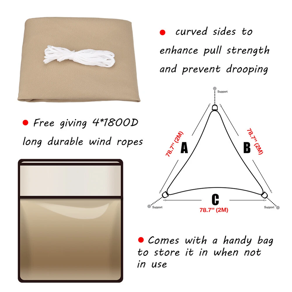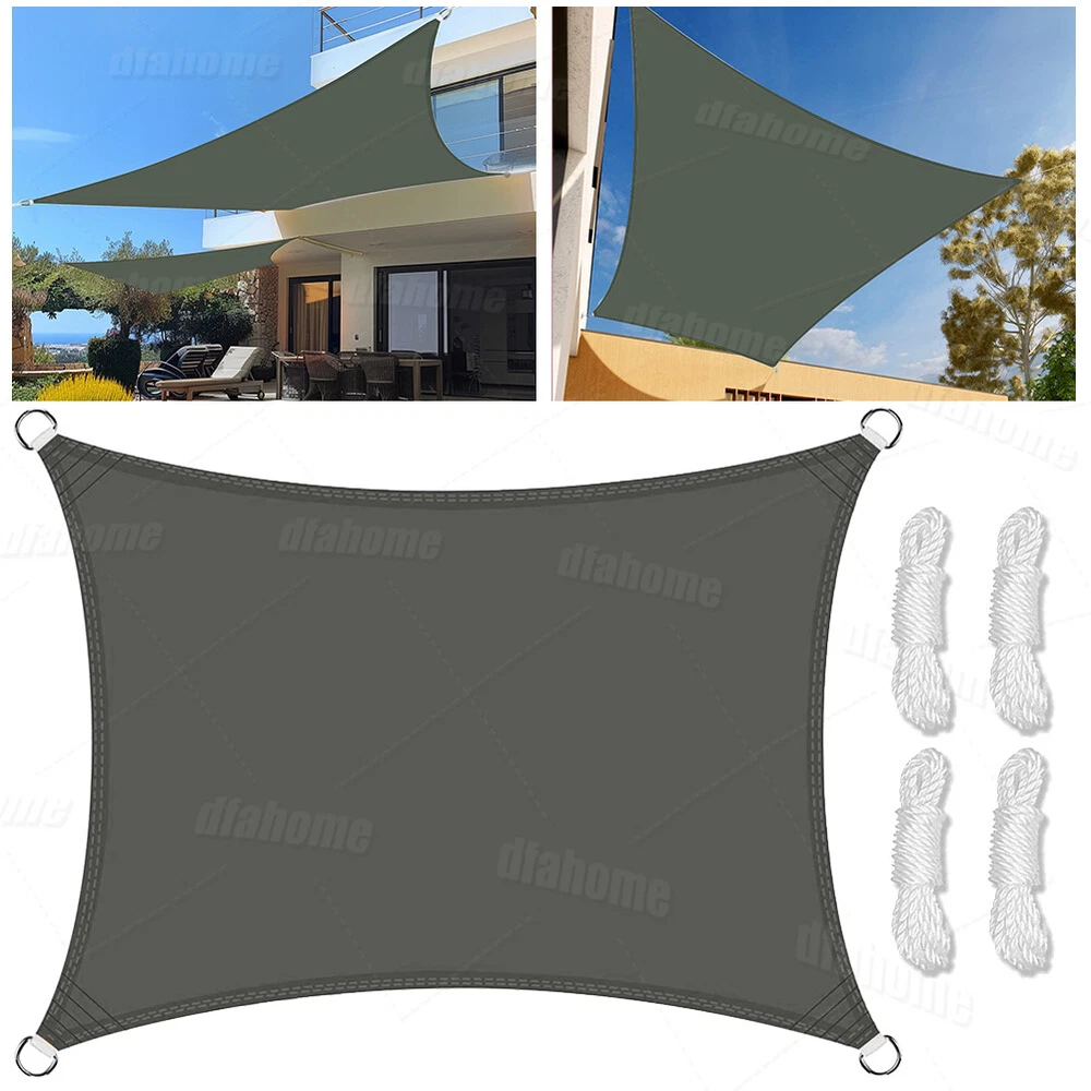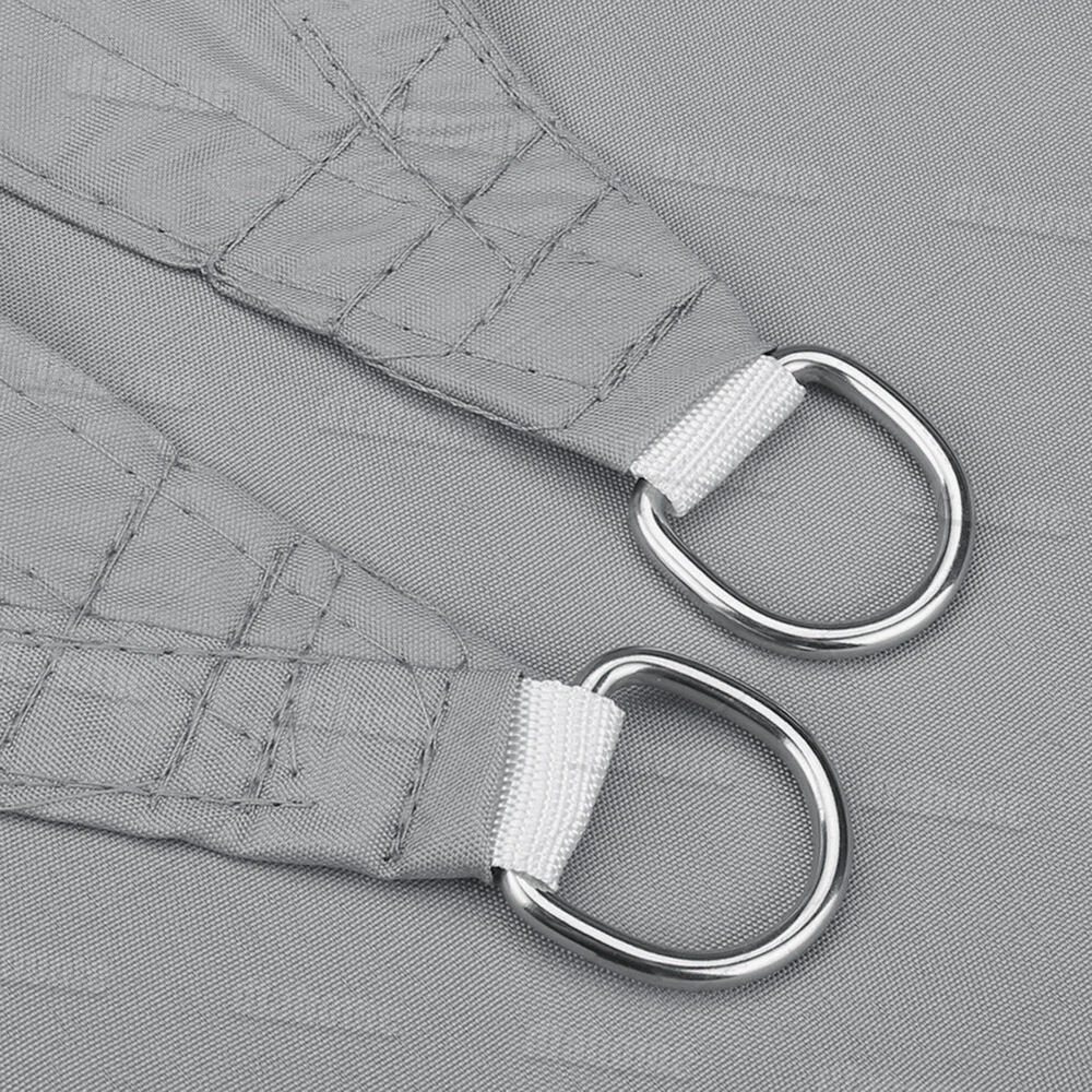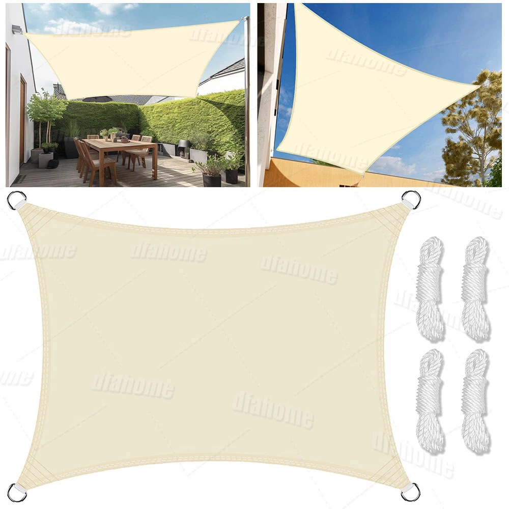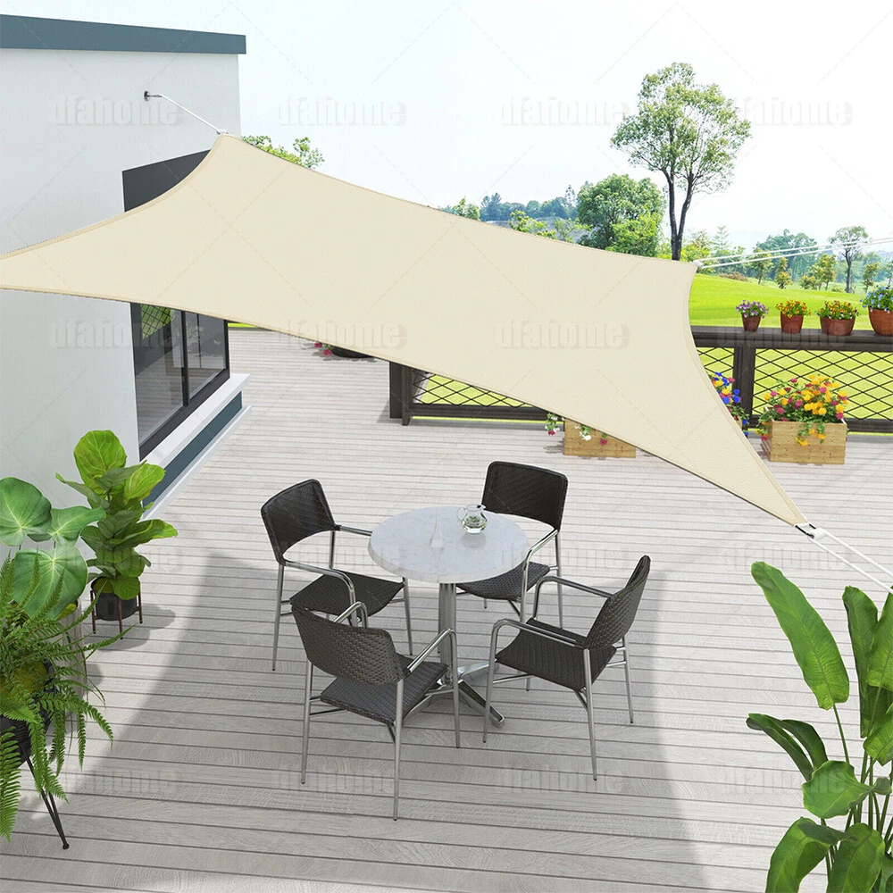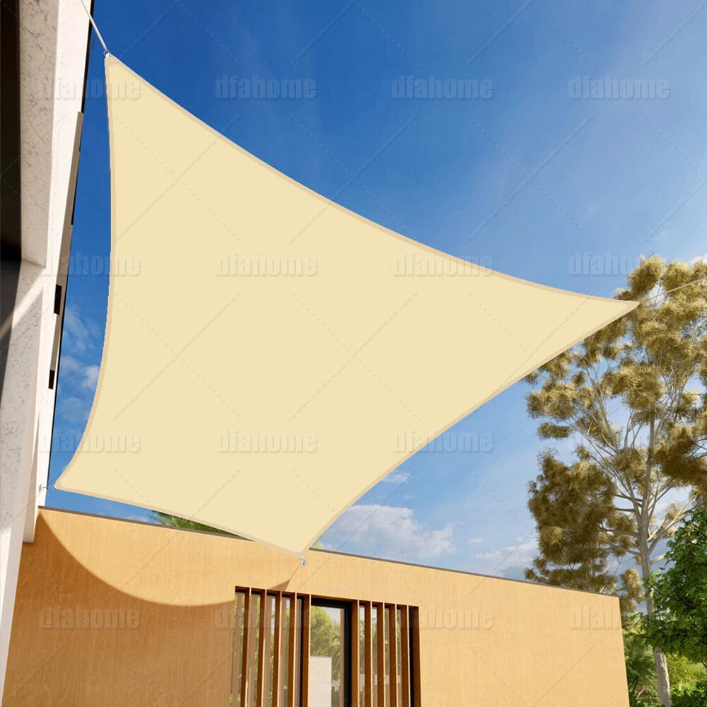 Descriptions: The Waterproof Sun Shade Sails Perfect for gardens, patios, swimming pools, BBQ areas and etc. Give you a cool and comfortable experience in the hot summer. It can also create a good mood for you in Rainy days. 【WATER RESISTANT】Sun shade sail is 300D high density polyester fabric with PU coating(160 g/m²), can withstand 2000MM water pressure. It's tear resistant, waterproof and weatherproof. But we don't suggest to use shade sail in heavy rain, continuous heavy rain may cause slight water seepage. 【MULTIFUNCTIONAL & DURABLE】Double stitched edges and reinforced corners, making both sides more robust. Our solar sail is suitable to be used in garden, backyard, patio, courtyard, carport, pergolas, swimming pool, balcony, terrace, camping trip, lawn or another outdoor area. Protecting your privacy safe. 【EASY TO INSTALL】Durable anti-rust D-ring is placed at the edge of the four corners, you can use ropes or fixing kits easily to fix it. We recommend that you adjust the angle of the garden shade sail to 20-40 degrees, it needs a certain angle to drain the rain to avoid damage the product due to excessive water. 【UV PROTECTION】Our outdoor awning can block 95% harmful UV. It can provides excellent shade on sunny days/rain days, give you a wonderful space to enjoy your time. 【PAKAGE CONTAIN】You will get Awning Canopy x1, Ropes x4/3 . Specification: Type: Waterproof shade sails Material: 300D Oxford cloth Material of D-Rings: Stainless Steel Color: Grey, Cream, Beige, Orange, Blue, Anthracite, Sand, Green, Terracotta Shape: Rectangle/Triangle/Square Ropes Length : 1.5m / 4.92 ft Features: Stainless Steel D Rings, Waterproof Waterproof Materials 160 gsm high density polyester with PU coating, water and tear resistant. The material is waterproof and can be protected from water even on rainy days. The material is more sturdy, thick fabric and braided rope, good windproof effect. High Quality Materials 95% UV protection Strong and high-quality materials, can be used in sunny and rainy days, not recommended for use in bad weather UV Protect This sun shade sail has a sunscreen coating that effectively prevents UV rays, blocks the sun, and prevents tanning.95% anti-UV effect, effectively blocking UV rays. Multiple Sizes in Varied Shapes: ## Triangle Sun Shade Sails Size ## 2 x 2 x 2M / 6.56 x 6.56 x 6.56 FT 3 x 3 x 3M / 9.84 x 9.84 x 9.84 FT 3.6 x 3.6 x 3.6M / 11.81 x 11.81 x 11.81 FT 5 x 5 x 5M / 16.40 x 16.40 x 16.40 FT ## Rectangle Sun Shade Sails Size ## 2 x 3 M / 6.56 x 9.84 FT 2 x 4 M / 6.56 x 13.12 FT 3 x 4 M / 9.84 x 13.12 FT 3 x 5 M / 9.84 x 16.40 FT 4 x 5 M / 13.12 x 16.40 FT 4 x 6 M / 13.12 x 19.68 FT ## Square Sun Shade Sails Size ## 2 x 2 M / 6.56 x 6.56 FT 3 x 3 M / 9.84 x 9.84 FT 3.6 x 3.6 M / 11.81 x 11.81 FT Package include 1x Waterproof shade sail with 3/4 Ropes The edge of the shade sail is curved, and the actual use area is about 10% less than the measured area. Please purchase with cautious,thank you. 【How-To Install a Shade Sail 】 The shade sail came with D ring & Wind ropes for you to be able to make the connections to the house/trees/other structure pretty easily. If you want to strengthen the fixing, you can buy a set of hardware from our store. How-Totighten the rope after installation/Buyer's Experience Sharing From the opposite corners, I assembled the proper length of wire rope with the thimble and clamp for the end, and attached to eye bolts in the trees with a turnbuckle to tighten the span. Once I had these four anchor points established and installed, the shade sail was in the proper position and I could tighten all four anchor points to get the desired tension.