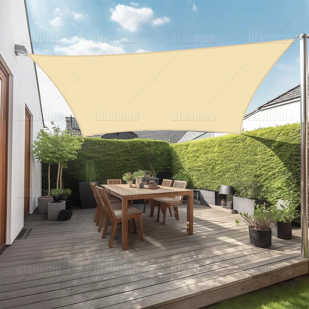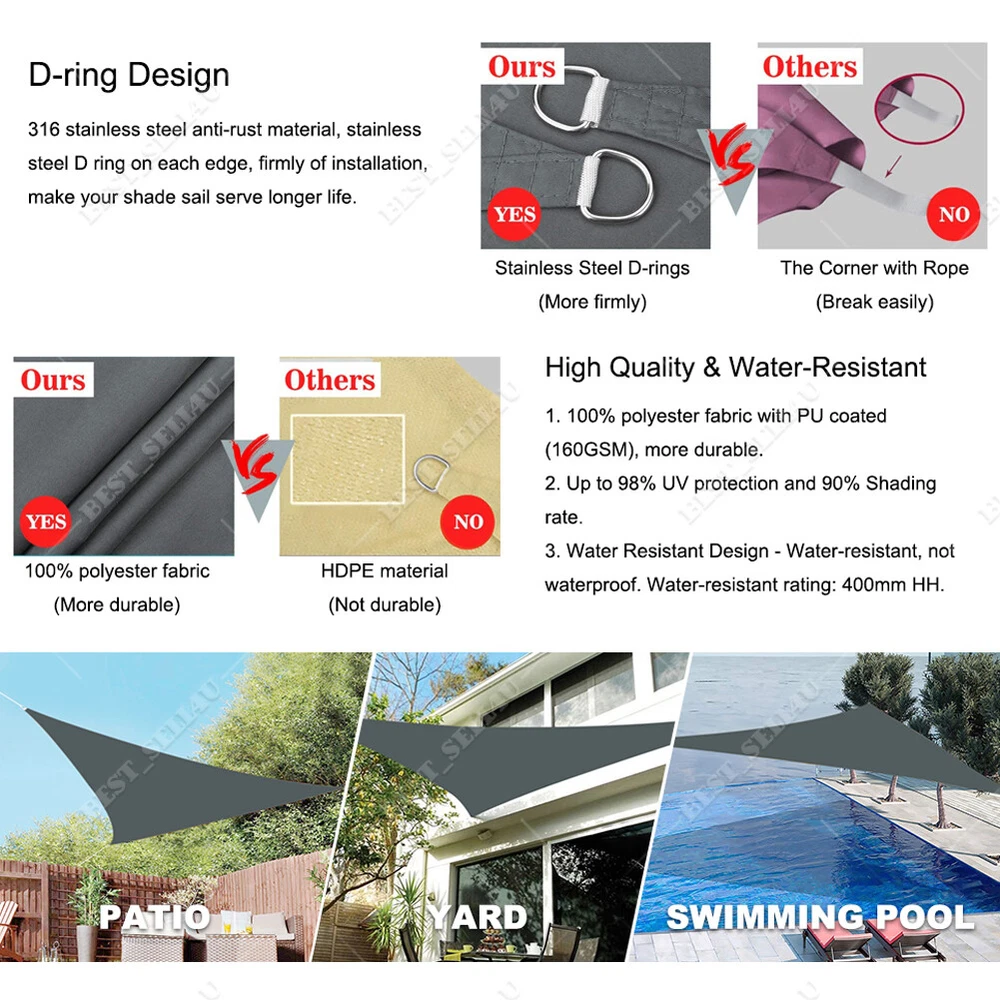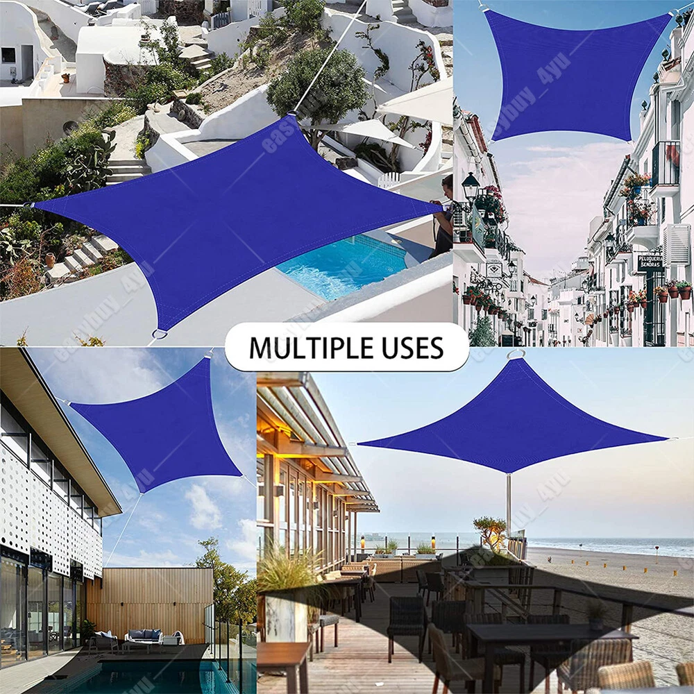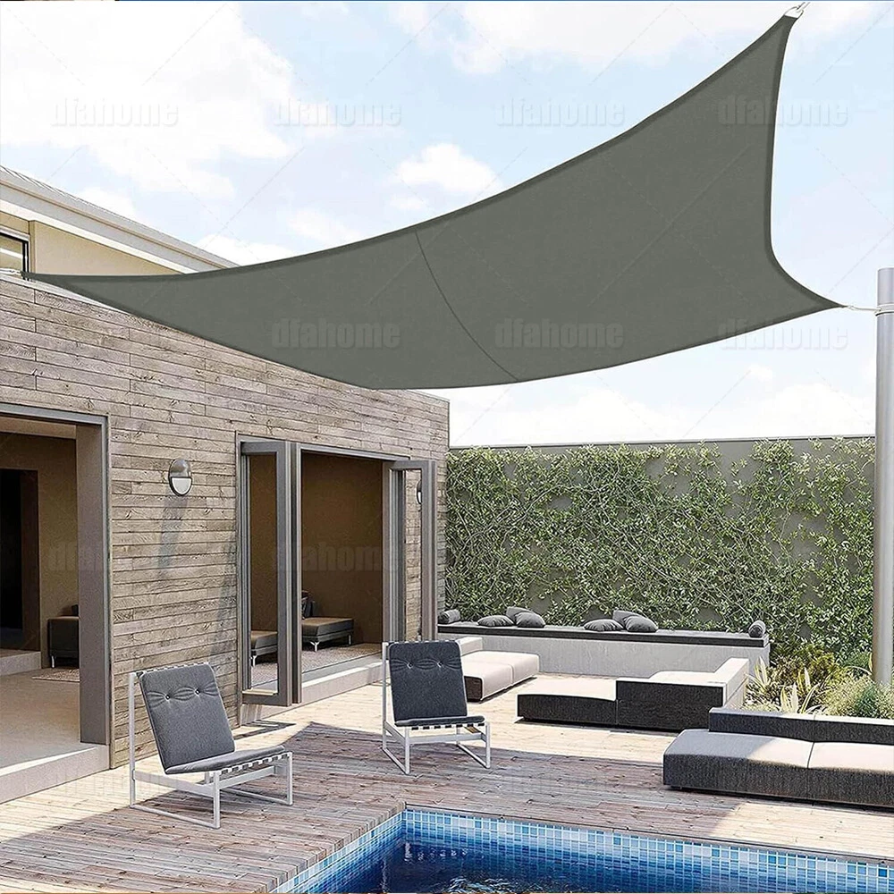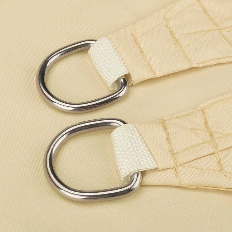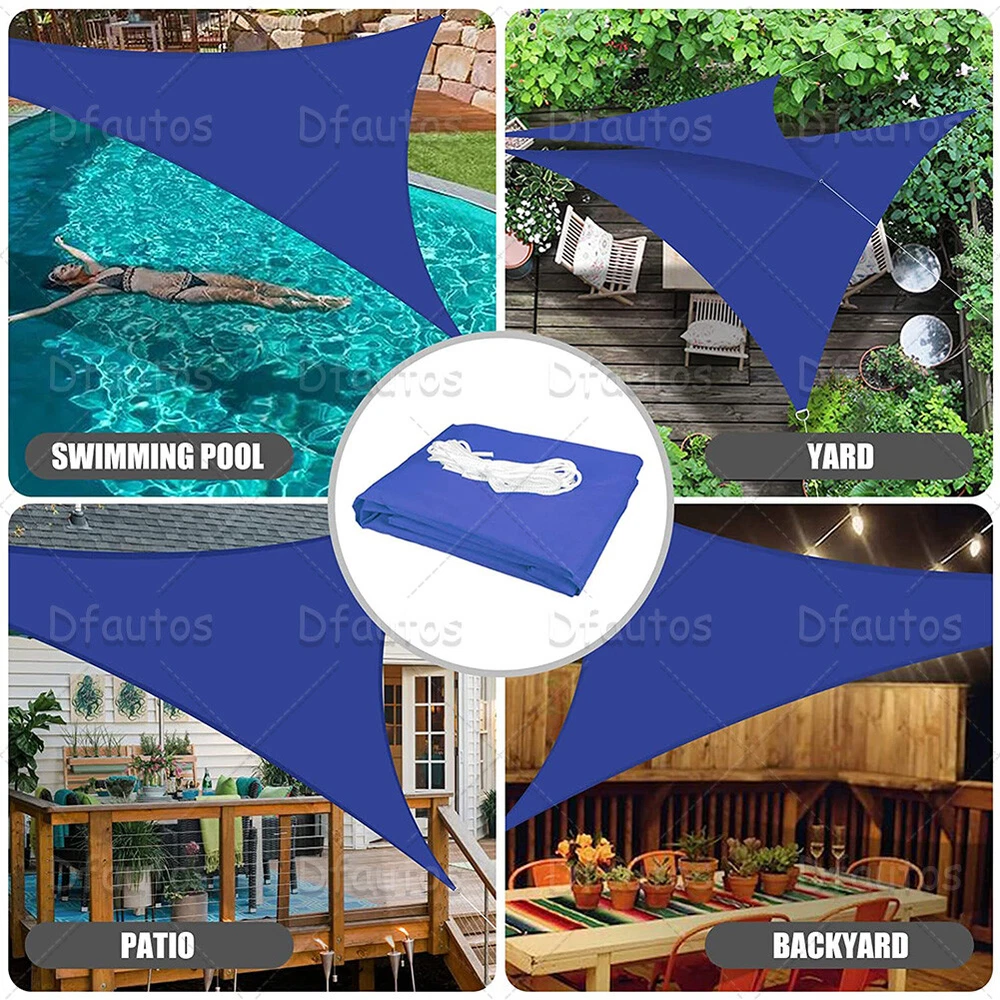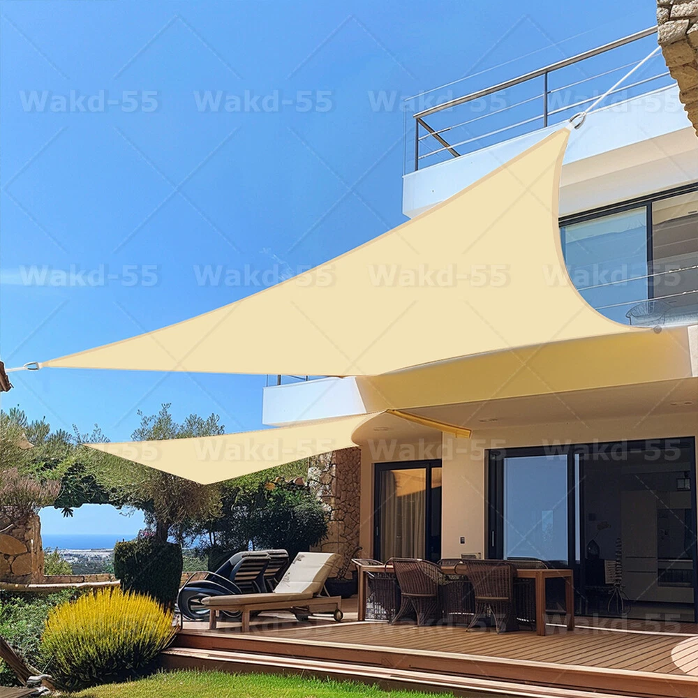 Descriptions: The Waterproof Sun Shade Sails Perfect for gardens, patios, swimming pools, BBQ areas and etc. Give you a cool and comfortable experience in the hot summer. It can also create a good mood for you in Rainy days. 【WATER RESISTANT】Sun shade sail is 300D high density polyester fabric with PU coating(160 g/m²), can withstand 2000MM water pressure. It's tear resistant, waterproof and weatherproof. But we don't suggest to use shade sail in heavy rain, continuous heavy rain may cause slight water seepage. 【MULTIFUNCTIONAL & DURABLE】Double stitched edges and reinforced corners, making both sides more robust. Our solar sail is suitable to be used in garden, backyard, patio, courtyard, carport, pergolas, swimming pool, balcony, terrace, camping trip, lawn or another outdoor area. Protecting your privacy safe. 【EASY TO INSTALL】Durable anti-rust D-ring is placed at the edge of the four corners, you can use ropes or fixing kits easily to fix it. We recommend that you adjust the angle of the garden shade sail to 20-40 degrees, it needs a certain angle to drain the rain to avoid damage the product due to excessive water. 【UV PROTECTION】Our outdoor awning can block 95% harmful UV. It can provides excellent shade on sunny days/rain days, give you a wonderful space to enjoy your time. 【PAKAGE CONTAIN】You will get Awning Canopy x1, Ropes x4/3 . Specification: Type: Waterproof shade sails Material: 300D Oxford cloth Material of D-Rings: Stainless Steel Color: Grey, Cream, Beige, Orange, Blue, Anthracite, Sand, Green, Terracotta Shape: Rectangle/Triangle/Square Ropes Length : 1.5m / 4.92 ft Features: Stainless Steel D Rings, Waterproof Waterproof Materials 160 gsm high density polyester with PU coating, water and tear resistant. The material is waterproof and can be protected from water even on rainy days. The material is more sturdy, thick fabric and braided rope, good windproof effect. High Quality Materials 95% UV protection Strong and high-quality materials, can be used in sunny and rainy days, not recommended for use in bad weather UV Protect This sun shade sail has a sunscreen coating that effectively prevents UV rays, blocks the sun, and prevents tanning.95% anti-UV effect, effectively blocking UV rays. Multiple Sizes in Varied Shapes: ## Triangle Sun Shade Sails Size ## 2 x 2 x 2M / 6.56 x 6.56 x 6.56 FT 3 x 3 x 3M / 9.84 x 9.84 x 9.84 FT 3.6 x 3.6 x 3.6M / 11.81 x 11.81 x 11.81 FT 5 x 5 x 5M / 16.40 x 16.40 x 16.40 FT ## Rectangle Sun Shade Sails Size ## 2 x 3 M / 6.56 x 9.84 FT 2 x 4 M / 6.56 x 13.12 FT 3 x 4 M / 9.84 x 13.12 FT 3 x 5 M / 9.84 x 16.40 FT 4 x 5 M / 13.12 x 16.40 FT 4 x 6 M / 13.12 x 19.68 FT ## Square Sun Shade Sails Size ## 2 x 2 M / 6.56 x 6.56 FT 3 x 3 M / 9.84 x 9.84 FT 3.6 x 3.6 M / 11.81 x 11.81 FT Package include 1x Waterproof shade sail with 3/4 Ropes The edge of the shade sail is curved, and the actual use area is about 10% less than the measured area. Please purchase with cautious,thank you. 【How-To Install a Shade Sail 】 The shade sail came with D ring & Wind ropes for you to be able to make the connections to the house/trees/other structure pretty easily. If you want to strengthen the fixing, you can buy a set of hardware from our store. How-Totighten the rope after installation/Buyer's Experience Sharing From the opposite corners, I assembled the proper length of wire rope with the thimble and clamp for the end, and attached to eye bolts in the trees with a turnbuckle to tighten the span. Once I had these four anchor points established and installed, the shade sail was in the proper position and I could tighten all four anchor points to get the desired tension.
