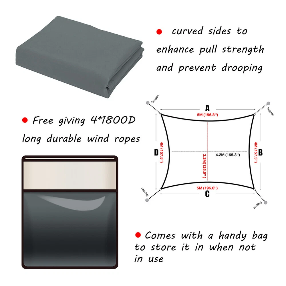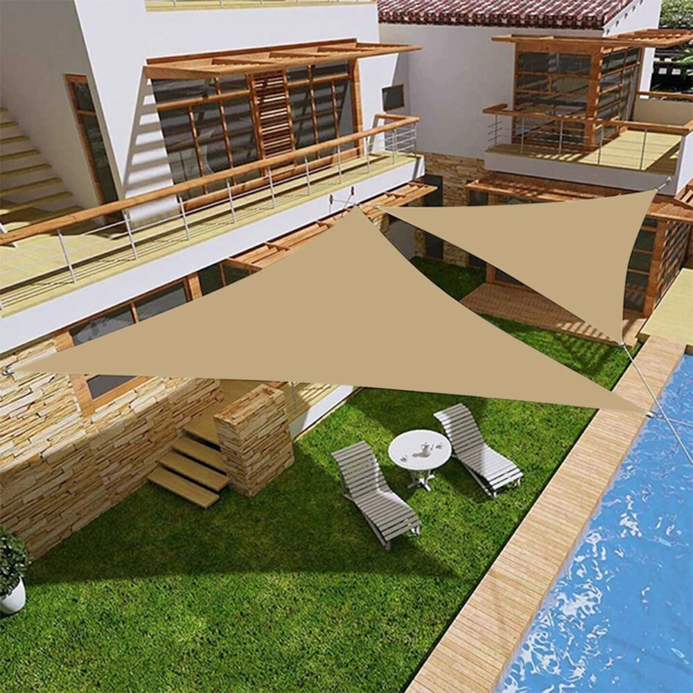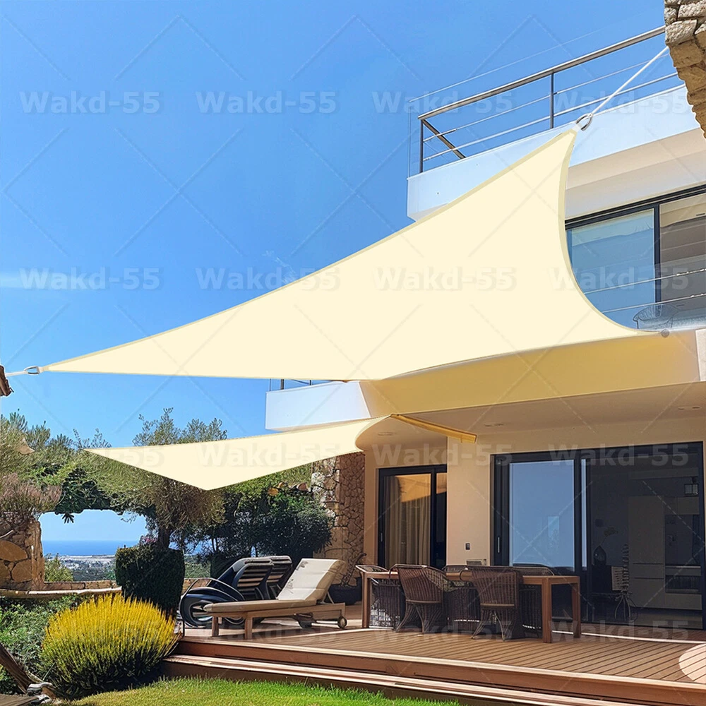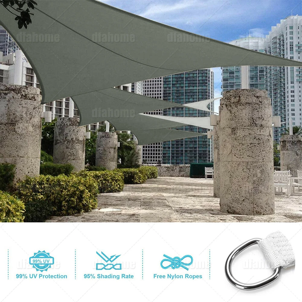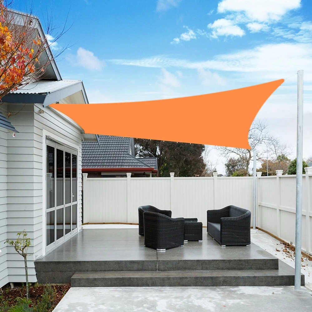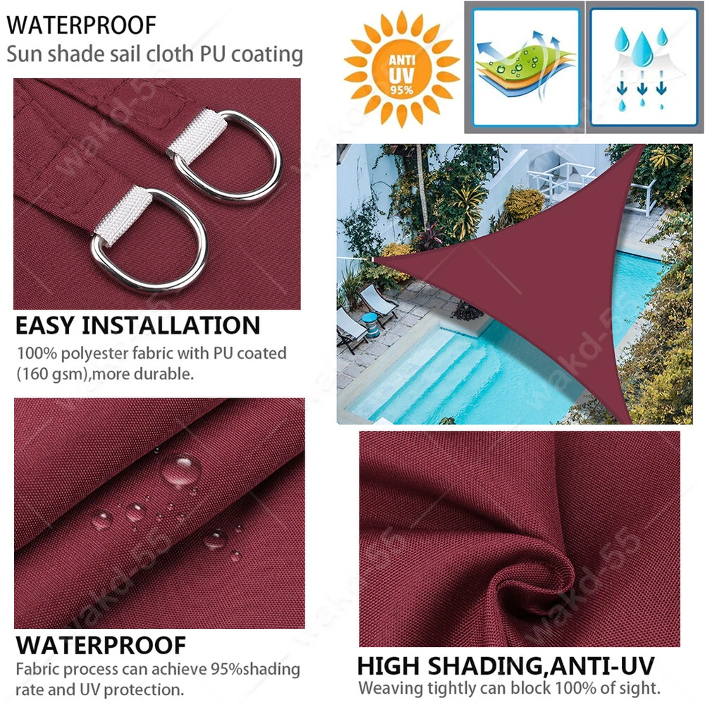 Descriptions: The Waterproof Sun Shade Sails Perfect for gardens, patios, swimming pools, BBQ areas and etc. Give you a cool and comfortable experience in the hot summer. It can also create a good mood for you in Rainy days. 【WATER RESISTANT】Sun shade sail is 300D high density polyester fabric with PU coating(160 g/m²), can withstand 2000MM water pressure. It's tear resistant, waterproof and weatherproof. But we don't suggest to use shade sail in heavy rain, continuous heavy rain may cause slight water seepage. 【MULTIFUNCTIONAL & DURABLE】Double stitched edges and reinforced corners, making both sides more robust. Our solar sail is suitable to be used in garden, backyard, patio, courtyard, carport, pergolas, swimming pool, balcony, terrace, camping trip, lawn or another outdoor area. Protecting your privacy safe. 【EASY TO INSTALL】Durable anti-rust D-ring is placed at the edge of the four corners, you can use ropes or fixing kits easily to fix it. We recommend that you adjust the angle of the garden shade sail to 20-40 degrees, it needs a certain angle to drain the rain to avoid damage the product due to excessive water. 【UV PROTECTION】Our outdoor awning can block 95% harmful UV. It can provides excellent shade on sunny days/rain days, give you a wonderful space to enjoy your time. 【PAKAGE CONTAIN】You will get Awning Canopy x1, Ropes x4/3 . Specification: Type: Waterproof shade sails Material: 300D Oxford cloth Material of D-Rings: Stainless Steel Color: Grey, Cream, Beige, Orange, Blue, Anthracite, Sand, Green, Terracotta Shape: Rectangle/Triangle/Square Ropes Length : 1.5m / 4.92 ft Features: Stainless Steel D Rings, Waterproof Waterproof Materials 160 gsm high density polyester with PU coating, water and tear resistant. The material is waterproof and can be protected from water even on rainy days. The material is more sturdy, thick fabric and braided rope, good windproof effect. High Quality Materials 95% UV protection Strong and high-quality materials, can be used in sunny and rainy days, not recommended for use in bad weather UV Protect This sun shade sail has a sunscreen coating that effectively prevents UV rays, blocks the sun, and prevents tanning.95% anti-UV effect, effectively blocking UV rays. Multiple Sizes in Varied Shapes: ## Triangle Sun Shade Sails Size ## 2 x 2 x 2M / 6.56 x 6.56 x 6.56 FT 3 x 3 x 3M / 9.84 x 9.84 x 9.84 FT 3.6 x 3.6 x 3.6M / 11.81 x 11.81 x 11.81 FT 5 x 5 x 5M / 16.40 x 16.40 x 16.40 FT ## Rectangle Sun Shade Sails Size ## 2 x 3 M / 6.56 x 9.84 FT 2 x 4 M / 6.56 x 13.12 FT 3 x 4 M / 9.84 x 13.12 FT 3 x 5 M / 9.84 x 16.40 FT 4 x 5 M / 13.12 x 16.40 FT 4 x 6 M / 13.12 x 19.68 FT ## Square Sun Shade Sails Size ## 2 x 2 M / 6.56 x 6.56 FT 3 x 3 M / 9.84 x 9.84 FT 3.6 x 3.6 M / 11.81 x 11.81 FT Package include 1x Waterproof shade sail with 3/4 Ropes The edge of the shade sail is curved, and the actual use area is about 10% less than the measured area. Please purchase with cautious,thank you. 【How-To Install a Shade Sail 】 The shade sail came with D ring & Wind ropes for you to be able to make the connections to the house/trees/other structure pretty easily. If you want to strengthen the fixing, you can buy a set of hardware from our store. How-Totighten the rope after installation/Buyer's Experience Sharing From the opposite corners, I assembled the proper length of wire rope with the thimble and clamp for the end, and attached to eye bolts in the trees with a turnbuckle to tighten the span. Once I had these four anchor points established and installed, the shade sail was in the proper position and I could tighten all four anchor points to get the desired tension.
