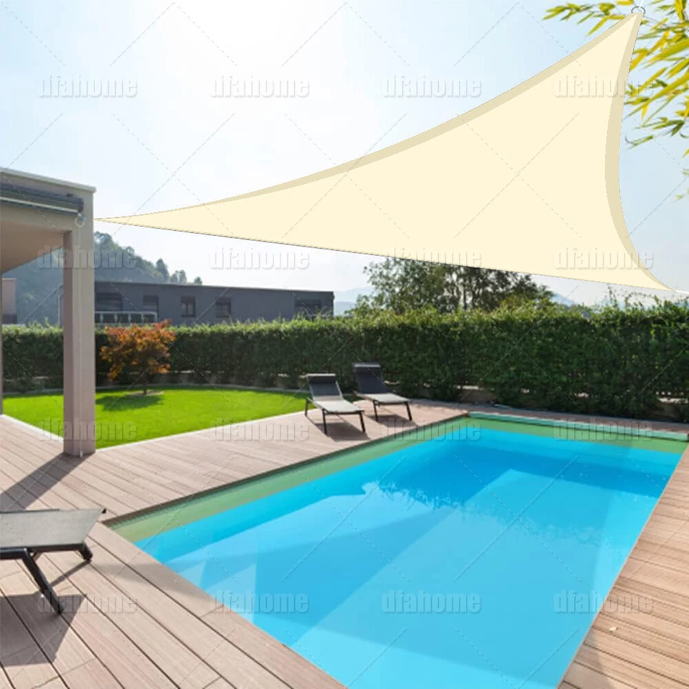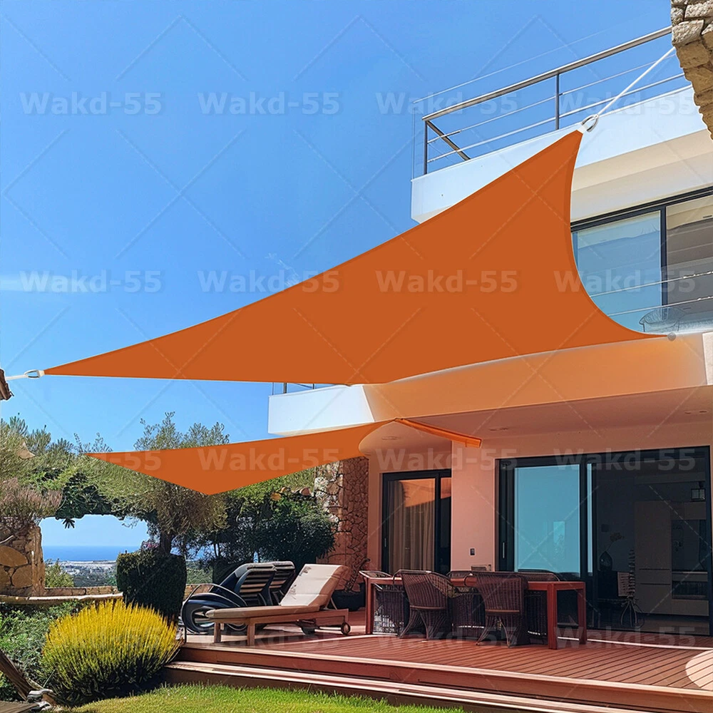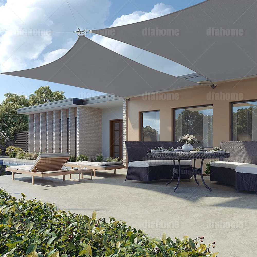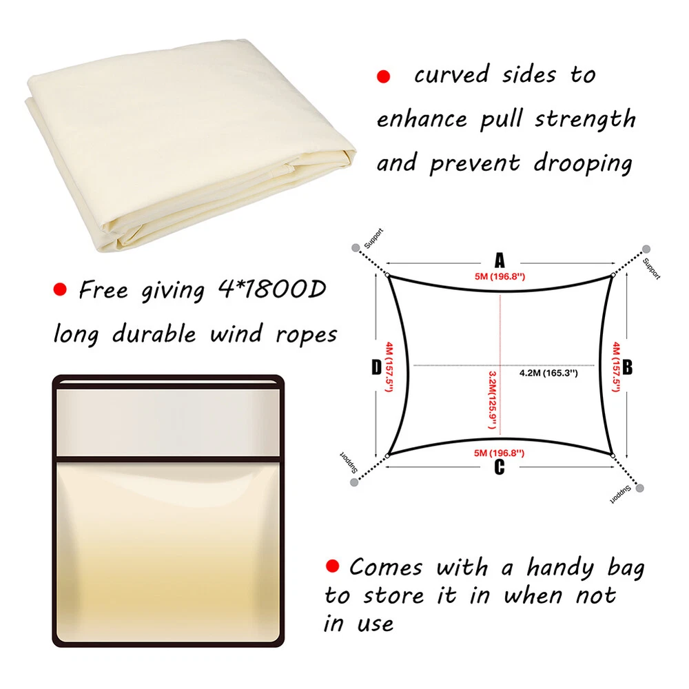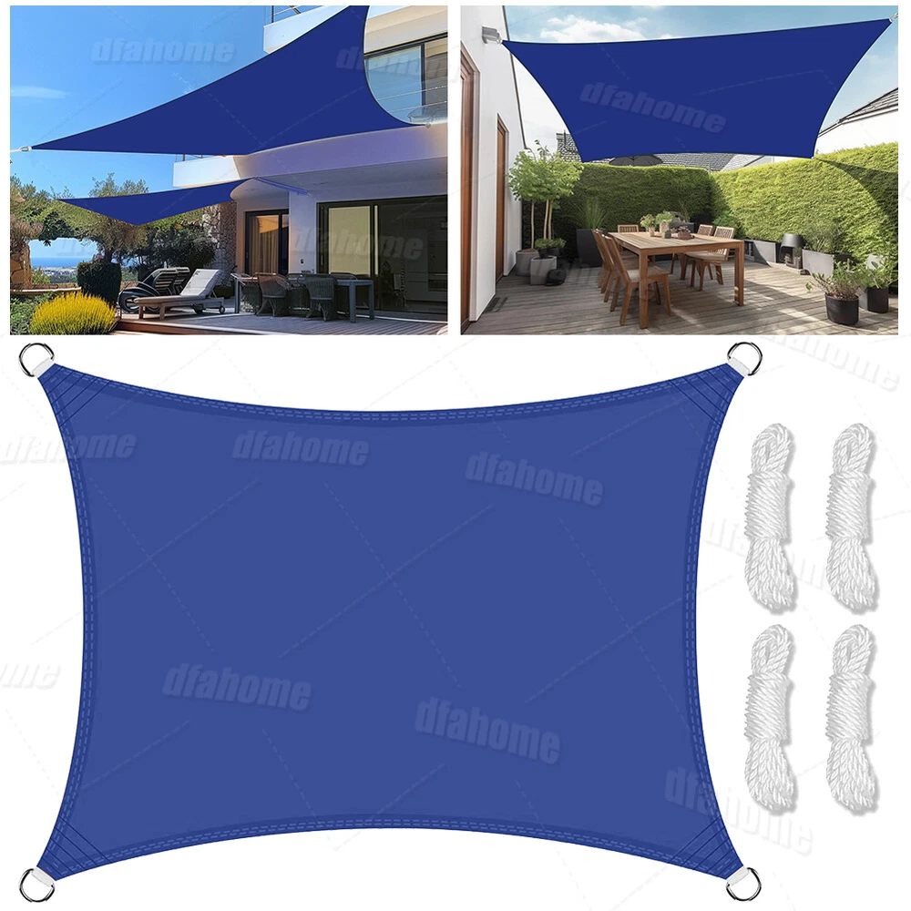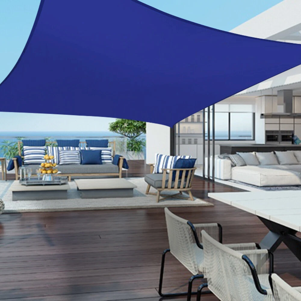 Descriptions: The Waterproof Sun Shade Sails Perfect for gardens, patios, swimming pools, BBQ areas and etc. Give you a cool and comfortable experience in the hot summer. It can also create a good mood for you in Rainy days. 【WATER RESISTANT】Sun shade sail is 300D high density polyester fabric with PU coating(160 g/m²), can withstand 2000MM water pressure. It's tear resistant, waterproof and weatherproof. But we don't suggest to use shade sail in heavy rain, continuous heavy rain may cause slight water seepage. 【MULTIFUNCTIONAL & DURABLE】Double stitched edges and reinforced corners, making both sides more robust. Our solar sail is suitable to be used in garden, backyard, patio, courtyard, carport, pergolas, swimming pool, balcony, terrace, camping trip, lawn or another outdoor area. Protecting your privacy safe. 【EASY TO INSTALL】Durable anti-rust D-ring is placed at the edge of the four corners, you can use ropes or fixing kits easily to fix it. We recommend that you adjust the angle of the garden shade sail to 20-40 degrees, it needs a certain angle to drain the rain to avoid damage the product due to excessive water. 【UV PROTECTION】Our outdoor awning can block 95% harmful UV. It can provides excellent shade on sunny days/rain days, give you a wonderful space to enjoy your time. 【PAKAGE CONTAIN】You will get Awning Canopy x1, Ropes x4/3 . Specification: Type: Waterproof shade sails Material: 300D Oxford cloth Material of D-Rings: Stainless Steel Color: Grey, Cream, Beige, Orange, Blue, Anthracite, Sand, Green, Terracotta Shape: Rectangle/Triangle/Square Ropes Length : 1.5m / 4.92 ft Features: Stainless Steel D Rings, Waterproof Waterproof Materials 160 gsm high density polyester with PU coating, water and tear resistant. The material is waterproof and can be protected from water even on rainy days. The material is more sturdy, thick fabric and braided rope, good windproof effect. High Quality Materials 95% UV protection Strong and high-quality materials, can be used in sunny and rainy days, not recommended for use in bad weather UV Protect This sun shade sail has a sunscreen coating that effectively prevents UV rays, blocks the sun, and prevents tanning.95% anti-UV effect, effectively blocking UV rays. Multiple Sizes in Varied Shapes: ## Triangle Sun Shade Sails Size ## 2 x 2 x 2M / 6.56 x 6.56 x 6.56 FT 3 x 3 x 3M / 9.84 x 9.84 x 9.84 FT 3.6 x 3.6 x 3.6M / 11.81 x 11.81 x 11.81 FT 5 x 5 x 5M / 16.40 x 16.40 x 16.40 FT ## Rectangle Sun Shade Sails Size ## 2 x 3 M / 6.56 x 9.84 FT 2 x 4 M / 6.56 x 13.12 FT 3 x 4 M / 9.84 x 13.12 FT 3 x 5 M / 9.84 x 16.40 FT 4 x 5 M / 13.12 x 16.40 FT 4 x 6 M / 13.12 x 19.68 FT ## Square Sun Shade Sails Size ## 2 x 2 M / 6.56 x 6.56 FT 3 x 3 M / 9.84 x 9.84 FT 3.6 x 3.6 M / 11.81 x 11.81 FT Package include 1x Waterproof shade sail with 3/4 Ropes The edge of the shade sail is curved, and the actual use area is about 10% less than the measured area. Please purchase with cautious,thank you. 【How-To Install a Shade Sail 】 The shade sail came with D ring & Wind ropes for you to be able to make the connections to the house/trees/other structure pretty easily. If you want to strengthen the fixing, you can buy a set of hardware from our store. How-Totighten the rope after installation/Buyer's Experience Sharing From the opposite corners, I assembled the proper length of wire rope with the thimble and clamp for the end, and attached to eye bolts in the trees with a turnbuckle to tighten the span. Once I had these four anchor points established and installed, the shade sail was in the proper position and I could tighten all four anchor points to get the desired tension.