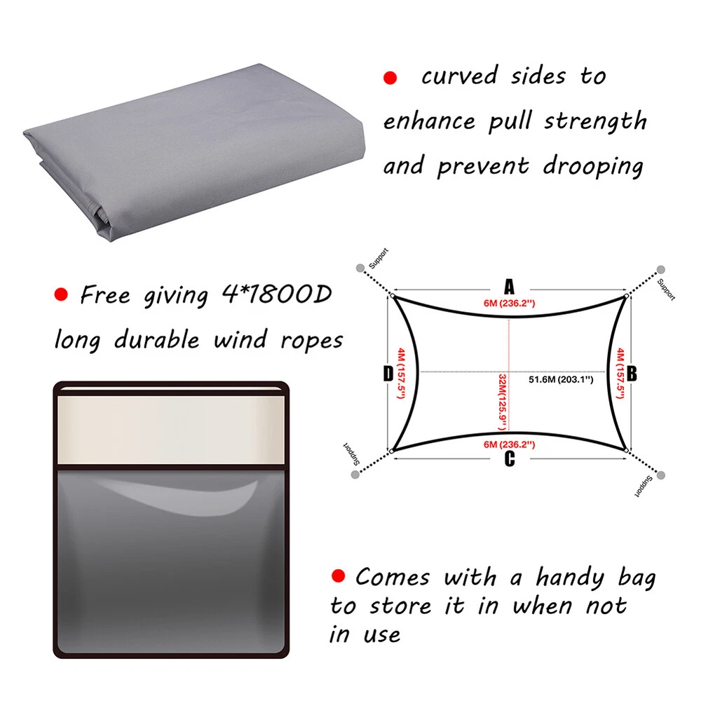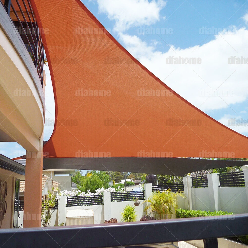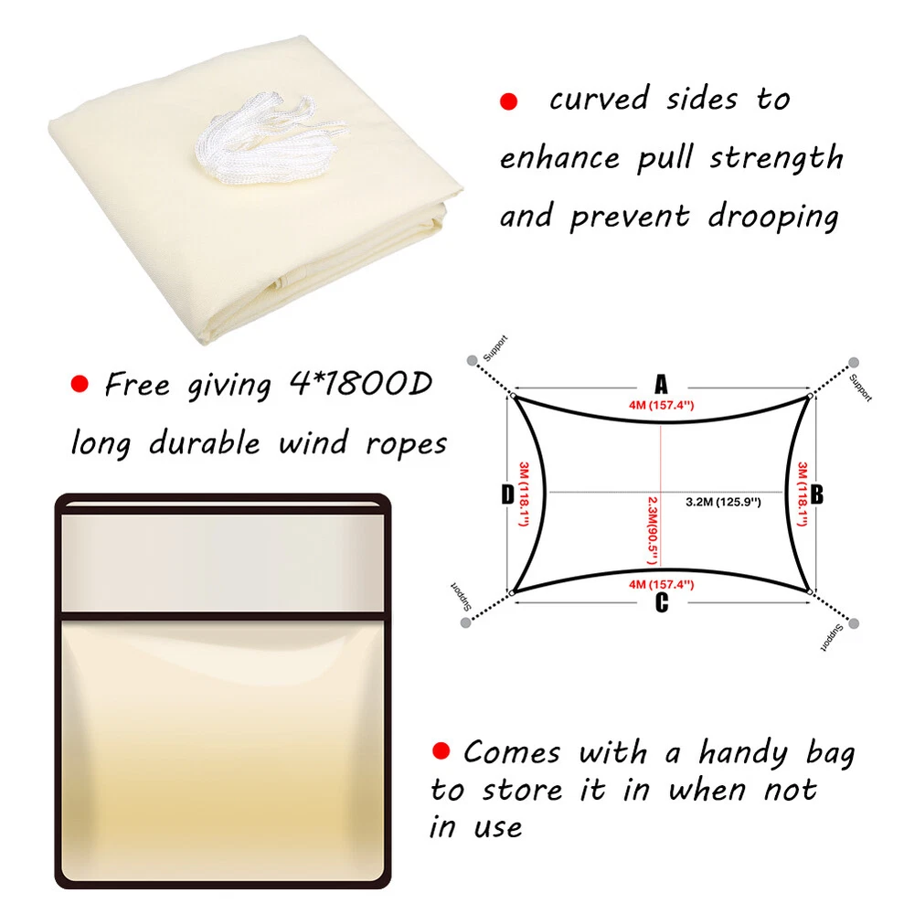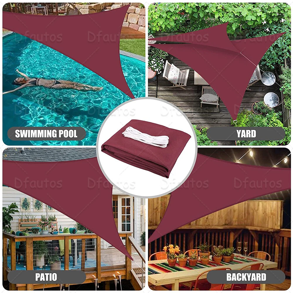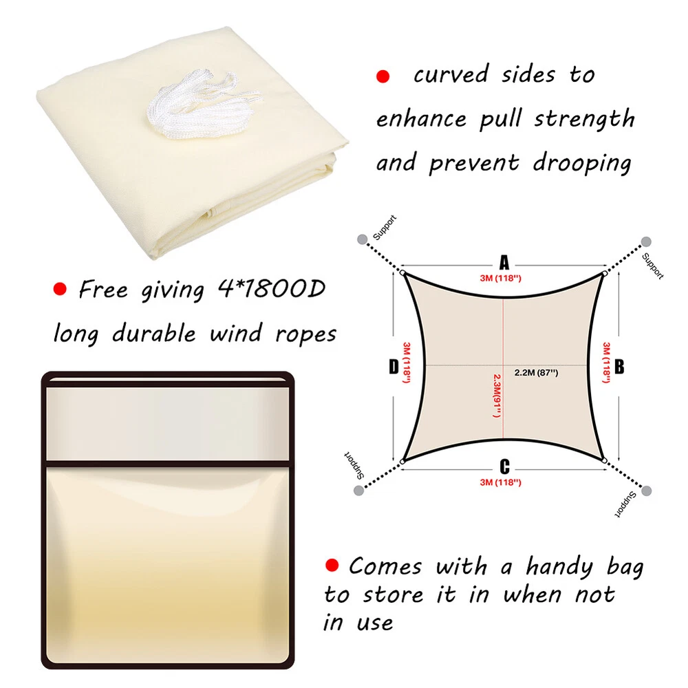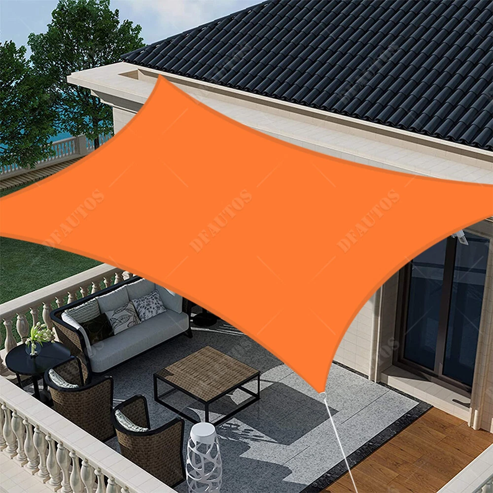 Descriptions: The Waterproof Sun Shade Sails Perfect for gardens, patios, swimming pools, BBQ areas and etc. Give you a cool and comfortable experience in the hot summer. It can also create a good mood for you in Rainy days. 【WATER RESISTANT】Sun shade sail is 300D high density polyester fabric with PU coating(160 g/m²), can withstand 2000MM water pressure. It's tear resistant, waterproof and weatherproof. But we don't suggest to use shade sail in heavy rain, continuous heavy rain may cause slight water seepage. 【MULTIFUNCTIONAL & DURABLE】Double stitched edges and reinforced corners, making both sides more robust. Our solar sail is suitable to be used in garden, backyard, patio, courtyard, carport, pergolas, swimming pool, balcony, terrace, camping trip, lawn or another outdoor area. Protecting your privacy safe. 【EASY TO INSTALL】Durable anti-rust D-ring is placed at the edge of the four corners, you can use ropes or fixing kits easily to fix it. We recommend that you adjust the angle of the garden shade sail to 20-40 degrees, it needs a certain angle to drain the rain to avoid damage the product due to excessive water. 【UV PROTECTION】Our outdoor awning can block 95% harmful UV. It can provides excellent shade on sunny days/rain days, give you a wonderful space to enjoy your time. 【PAKAGE CONTAIN】You will get Awning Canopy x1, Ropes x4/3 . Specification: Type: Waterproof shade sails Material: 300D Oxford cloth Material of D-Rings: Stainless Steel Color: Grey, Cream, Beige, Orange, Blue, Anthracite, Sand, Green, Terracotta Shape: Rectangle/Triangle/Square Ropes Length : 1.5m / 4.92 ft Features: Stainless Steel D Rings, Waterproof Waterproof Materials 160 gsm high density polyester with PU coating, water and tear resistant. The material is waterproof and can be protected from water even on rainy days. The material is more sturdy, thick fabric and braided rope, good windproof effect. High Quality Materials 95% UV protection Strong and high-quality materials, can be used in sunny and rainy days, not recommended for use in bad weather UV Protect This sun shade sail has a sunscreen coating that effectively prevents UV rays, blocks the sun, and prevents tanning.95% anti-UV effect, effectively blocking UV rays. Multiple Sizes in Varied Shapes: ## Triangle Sun Shade Sails Size ## 2 x 2 x 2M / 6.56 x 6.56 x 6.56 FT 3 x 3 x 3M / 9.84 x 9.84 x 9.84 FT 3.6 x 3.6 x 3.6M / 11.81 x 11.81 x 11.81 FT 5 x 5 x 5M / 16.40 x 16.40 x 16.40 FT ## Rectangle Sun Shade Sails Size ## 2 x 3 M / 6.56 x 9.84 FT 2 x 4 M / 6.56 x 13.12 FT 3 x 4 M / 9.84 x 13.12 FT 3 x 5 M / 9.84 x 16.40 FT 4 x 5 M / 13.12 x 16.40 FT 4 x 6 M / 13.12 x 19.68 FT ## Square Sun Shade Sails Size ## 2 x 2 M / 6.56 x 6.56 FT 3 x 3 M / 9.84 x 9.84 FT 3.6 x 3.6 M / 11.81 x 11.81 FT Package include 1x Waterproof shade sail with 3/4 Ropes The edge of the shade sail is curved, and the actual use area is about 10% less than the measured area. Please purchase with cautious,thank you. 【How-To Install a Shade Sail 】 The shade sail came with D ring & Wind ropes for you to be able to make the connections to the house/trees/other structure pretty easily. If you want to strengthen the fixing, you can buy a set of hardware from our store. How-Totighten the rope after installation/Buyer's Experience Sharing From the opposite corners, I assembled the proper length of wire rope with the thimble and clamp for the end, and attached to eye bolts in the trees with a turnbuckle to tighten the span. Once I had these four anchor points established and installed, the shade sail was in the proper position and I could tighten all four anchor points to get the desired tension.