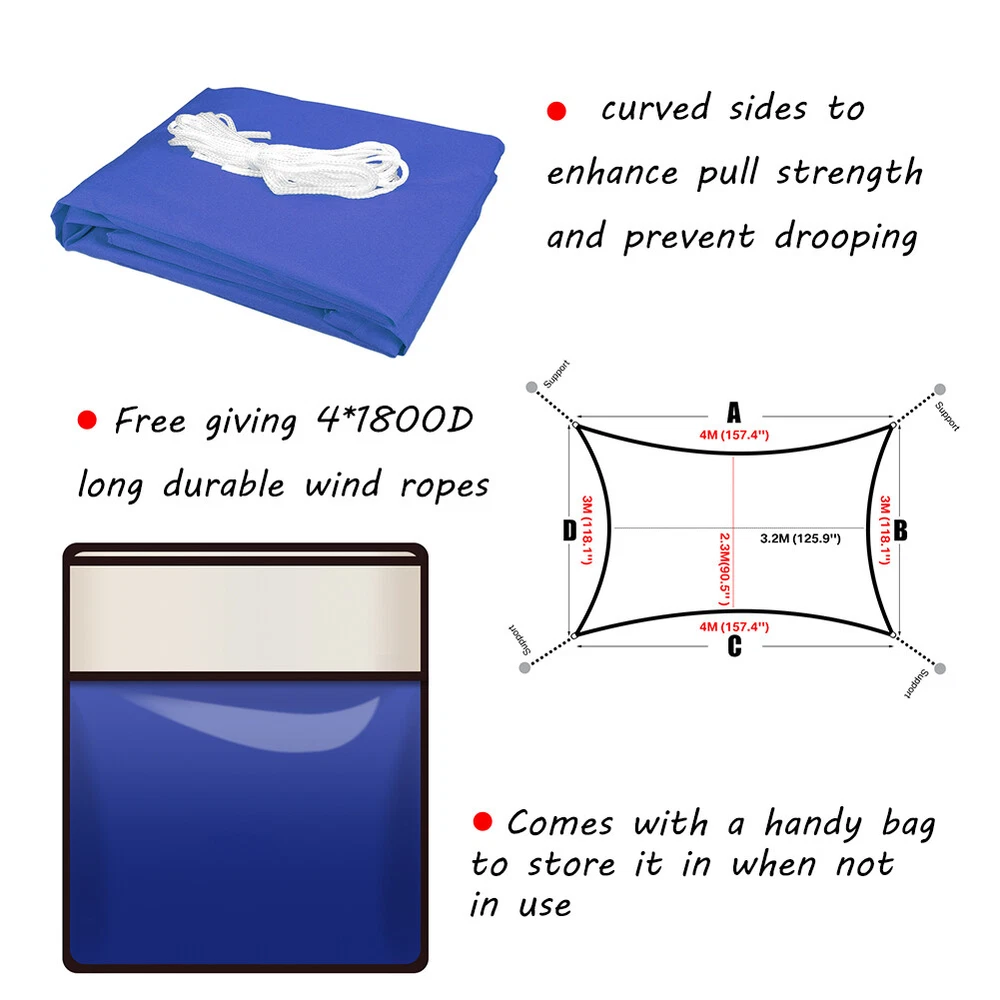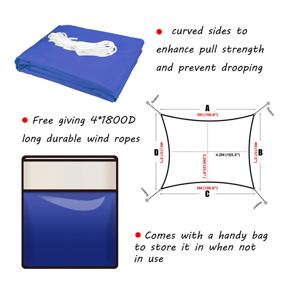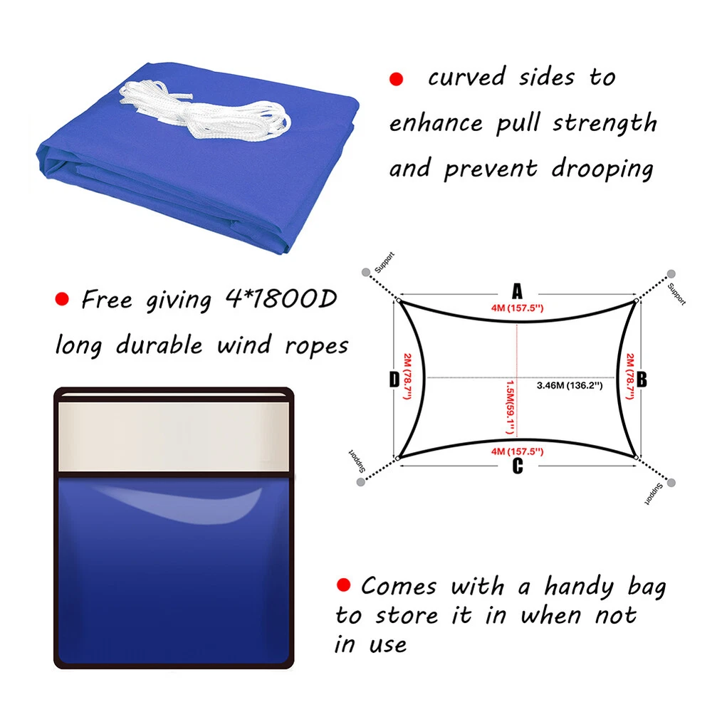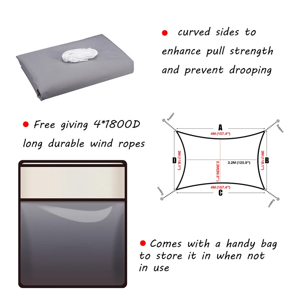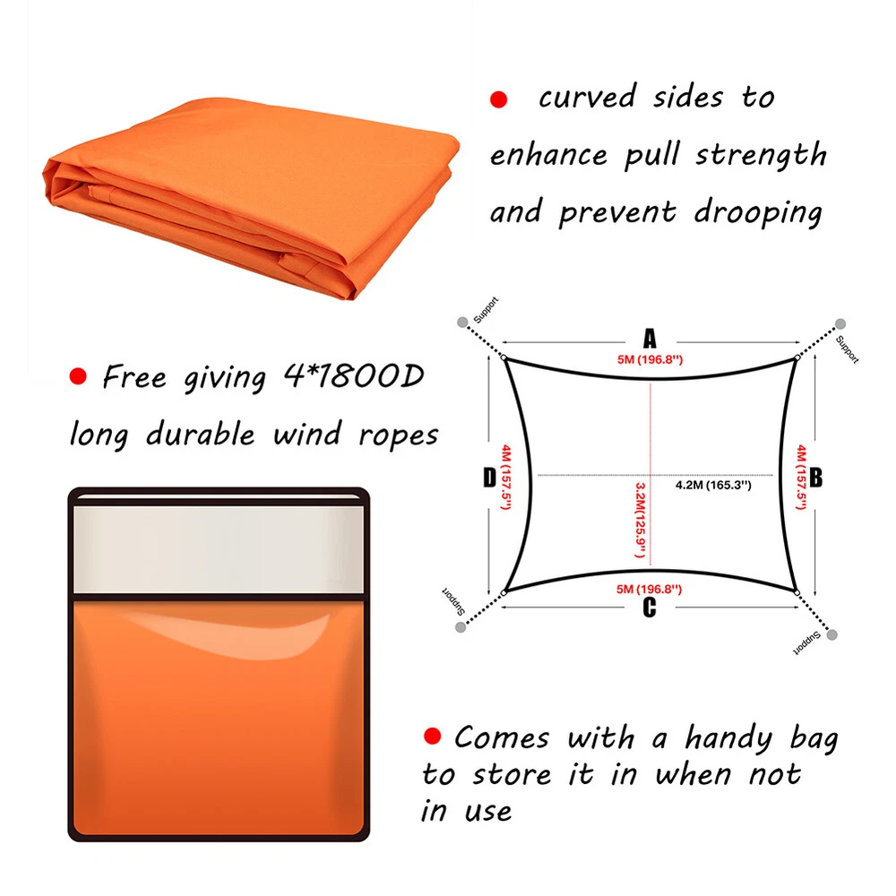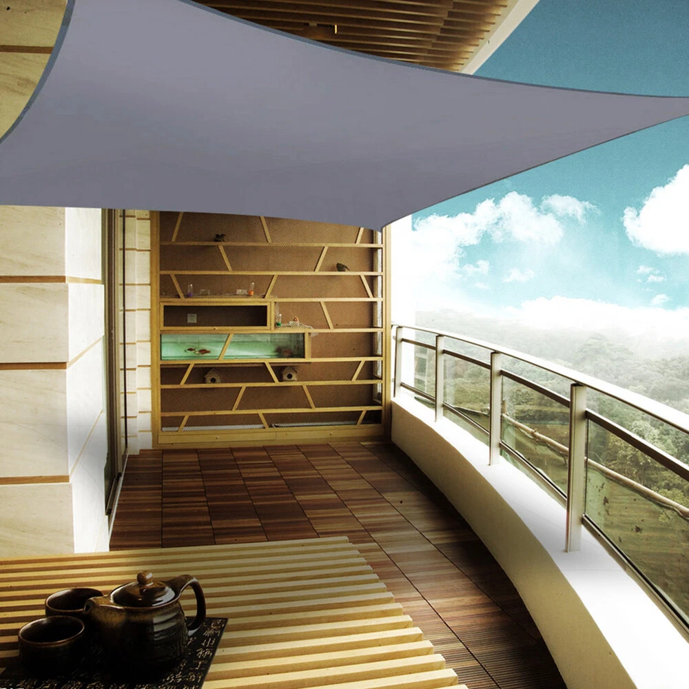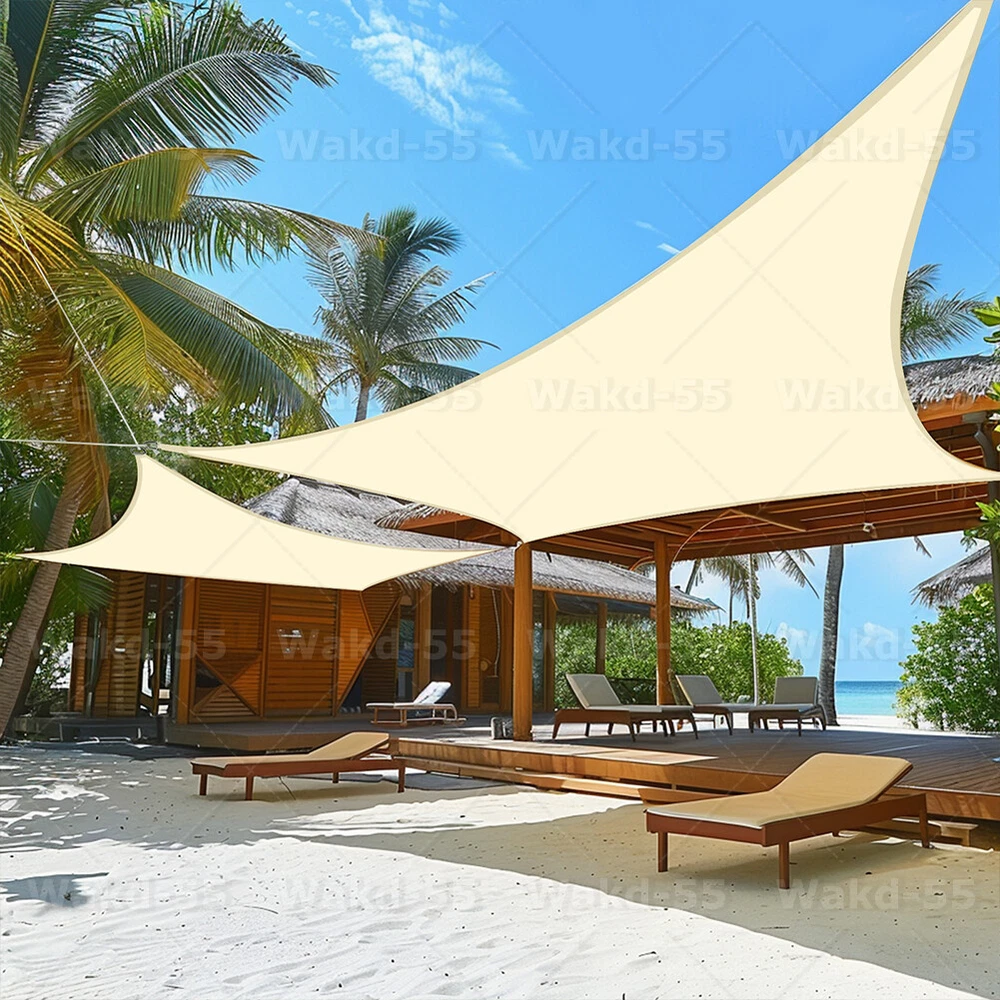 Descriptions: The Waterproof Sun Shade Sails Perfect for gardens, patios, swimming pools, BBQ areas and etc. Give you a cool and comfortable experience in the hot summer. It can also create a good mood for you in Rainy days. 【WATER RESISTANT】Sun shade sail is 300D high density polyester fabric with PU coating(160 g/m²), can withstand 2000MM water pressure. It's tear resistant, waterproof and weatherproof. But we don't suggest to use shade sail in heavy rain, continuous heavy rain may cause slight water seepage. 【MULTIFUNCTIONAL & DURABLE】Double stitched edges and reinforced corners, making both sides more robust. Our solar sail is suitable to be used in garden, backyard, patio, courtyard, carport, pergolas, swimming pool, balcony, terrace, camping trip, lawn or another outdoor area. Protecting your privacy safe. 【EASY TO INSTALL】Durable anti-rust D-ring is placed at the edge of the four corners, you can use ropes or fixing kits easily to fix it. We recommend that you adjust the angle of the garden shade sail to 20-40 degrees, it needs a certain angle to drain the rain to avoid damage the product due to excessive water. 【UV PROTECTION】Our outdoor awning can block 95% harmful UV. It can provides excellent shade on sunny days/rain days, give you a wonderful space to enjoy your time. 【PAKAGE CONTAIN】You will get Awning Canopy x1, Ropes x4/3 . Specification: Type: Waterproof shade sails Material: 300D Oxford cloth Material of D-Rings: Stainless Steel Color: Grey, Cream, Beige, Orange, Blue, Anthracite, Sand, Green, Terracotta Shape: Rectangle/Triangle/Square Ropes Length : 1.5m / 4.92 ft Features: Stainless Steel D Rings, Waterproof Waterproof Materials 160 gsm high density polyester with PU coating, water and tear resistant. The material is waterproof and can be protected from water even on rainy days. The material is more sturdy, thick fabric and braided rope, good windproof effect. High Quality Materials 95% UV protection Strong and high-quality materials, can be used in sunny and rainy days, not recommended for use in bad weather UV Protect This sun shade sail has a sunscreen coating that effectively prevents UV rays, blocks the sun, and prevents tanning.95% anti-UV effect, effectively blocking UV rays. Multiple Sizes in Varied Shapes: ## Triangle Sun Shade Sails Size ## 2 x 2 x 2M / 6.56 x 6.56 x 6.56 FT 3 x 3 x 3M / 9.84 x 9.84 x 9.84 FT 3.6 x 3.6 x 3.6M / 11.81 x 11.81 x 11.81 FT 5 x 5 x 5M / 16.40 x 16.40 x 16.40 FT ## Rectangle Sun Shade Sails Size ## 2 x 3 M / 6.56 x 9.84 FT 2 x 4 M / 6.56 x 13.12 FT 3 x 4 M / 9.84 x 13.12 FT 3 x 5 M / 9.84 x 16.40 FT 4 x 5 M / 13.12 x 16.40 FT 4 x 6 M / 13.12 x 19.68 FT ## Square Sun Shade Sails Size ## 2 x 2 M / 6.56 x 6.56 FT 3 x 3 M / 9.84 x 9.84 FT 3.6 x 3.6 M / 11.81 x 11.81 FT Package include 1x Waterproof shade sail with 3/4 Ropes The edge of the shade sail is curved, and the actual use area is about 10% less than the measured area. Please purchase with cautious,thank you. 【How-To Install a Shade Sail 】 The shade sail came with D ring & Wind ropes for you to be able to make the connections to the house/trees/other structure pretty easily. If you want to strengthen the fixing, you can buy a set of hardware from our store. How-Totighten the rope after installation/Buyer's Experience Sharing From the opposite corners, I assembled the proper length of wire rope with the thimble and clamp for the end, and attached to eye bolts in the trees with a turnbuckle to tighten the span. Once I had these four anchor points established and installed, the shade sail was in the proper position and I could tighten all four anchor points to get the desired tension.
