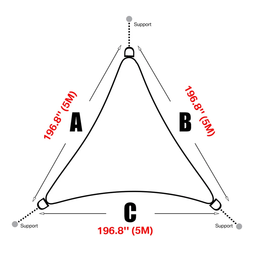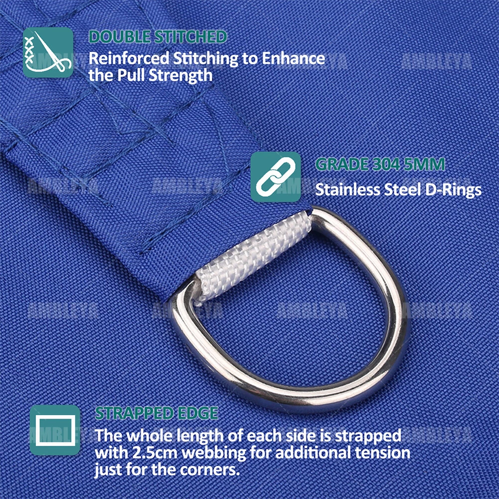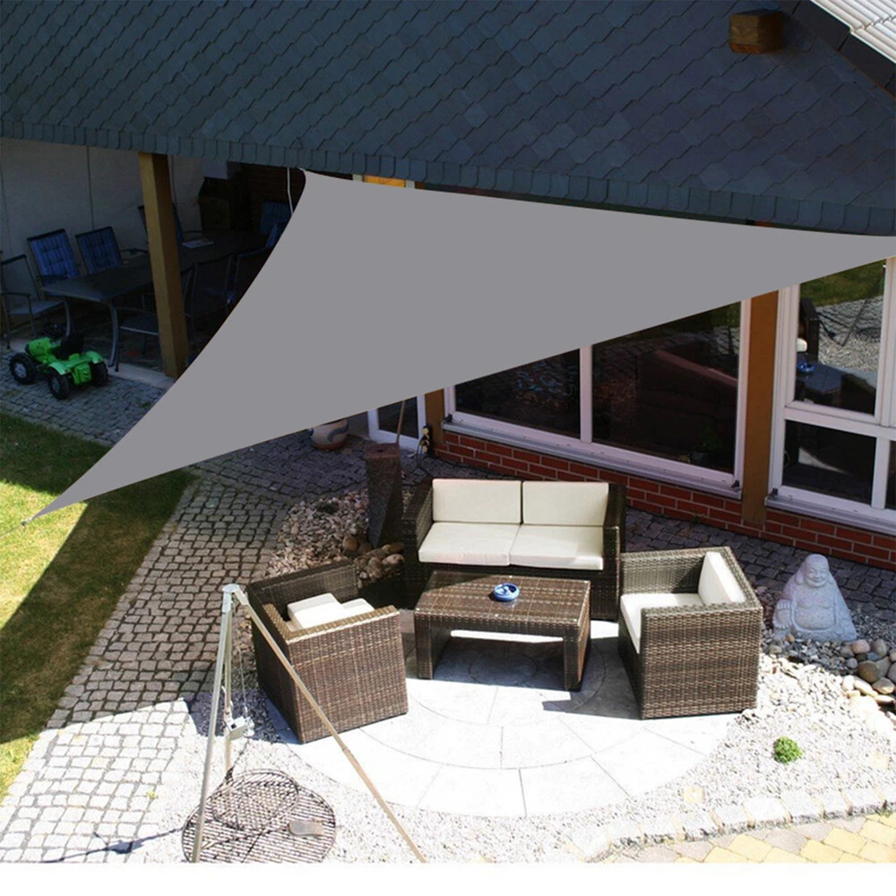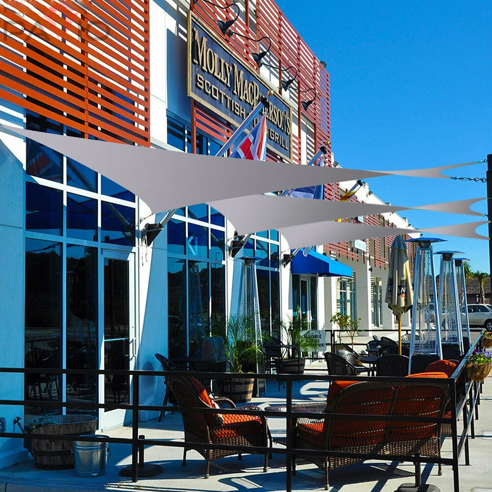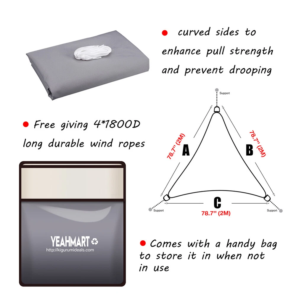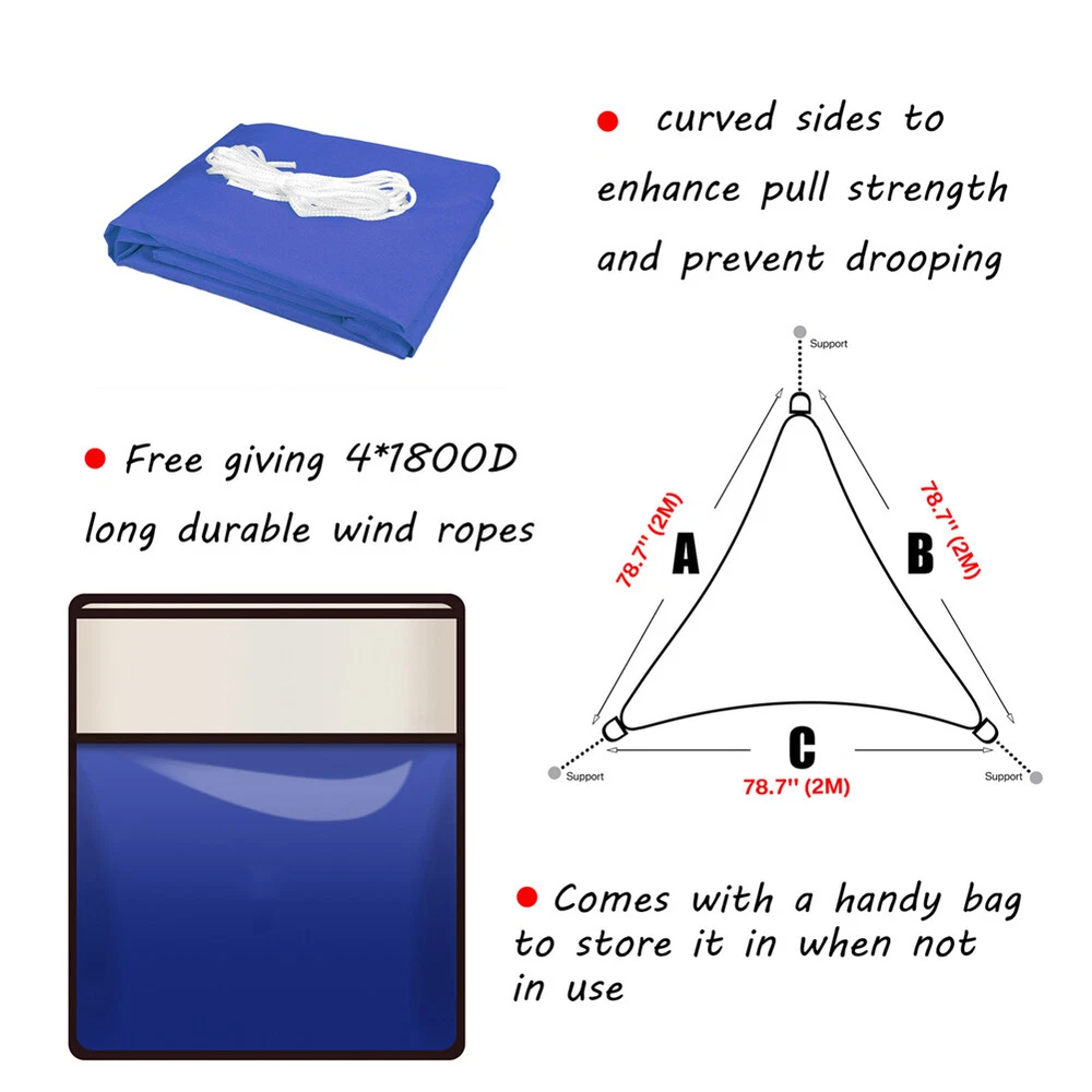 Descriptions: The Waterproof Sun Shade Sails Perfect for gardens, patios, swimming pools, BBQ areas and etc. Give you a cool and comfortable experience in the hot summer. It can also create a good mood for you in Rainy days. 【WATER RESISTANT】Sun shade sail is 300D high density polyester fabric with PU coating(160 g/m²), can withstand 2000MM water pressure. It's tear resistant, waterproof and weatherproof. But we don't suggest to use shade sail in heavy rain, continuous heavy rain may cause slight water seepage. 【MULTIFUNCTIONAL & DURABLE】Double stitched edges and reinforced corners, making both sides more robust. Our solar sail is suitable to be used in garden, backyard, patio, courtyard, carport, pergolas, swimming pool, balcony, terrace, camping trip, lawn or another outdoor area. Protecting your privacy safe. 【EASY TO INSTALL】Durable anti-rust D-ring is placed at the edge of the four corners, you can use ropes or fixing kits easily to fix it. We recommend that you adjust the angle of the garden shade sail to 20-40 degrees, it needs a certain angle to drain the rain to avoid damage the product due to excessive water. 【UV PROTECTION】Our outdoor awning can block 95% harmful UV. It can provides excellent shade on sunny days/rain days, give you a wonderful space to enjoy your time. 【PAKAGE CONTAIN】You will get Awning Canopy x1, Ropes x4/3 . Specification: Type: Waterproof shade sails Material: 300D Oxford cloth Material of D-Rings: Stainless Steel Color: Grey, Cream, Beige, Orange, Blue, Anthracite, Sand, Green, Terracotta Shape: Rectangle/Triangle/Square Ropes Length : 1.5m / 4.92 ft Features: Stainless Steel D Rings, Waterproof Waterproof Materials 160 gsm high density polyester with PU coating, water and tear resistant. The material is waterproof and can be protected from water even on rainy days. The material is more sturdy, thick fabric and braided rope, good windproof effect. High Quality Materials 95% UV protection Strong and high-quality materials, can be used in sunny and rainy days, not recommended for use in bad weather UV Protect This sun shade sail has a sunscreen coating that effectively prevents UV rays, blocks the sun, and prevents tanning.95% anti-UV effect, effectively blocking UV rays. Multiple Sizes in Varied Shapes: ## Triangle Sun Shade Sails Size ## 2 x 2 x 2M / 6.56 x 6.56 x 6.56 FT 3 x 3 x 3M / 9.84 x 9.84 x 9.84 FT 3.6 x 3.6 x 3.6M / 11.81 x 11.81 x 11.81 FT 5 x 5 x 5M / 16.40 x 16.40 x 16.40 FT ## Rectangle Sun Shade Sails Size ## 2 x 3 M / 6.56 x 9.84 FT 2 x 4 M / 6.56 x 13.12 FT 3 x 4 M / 9.84 x 13.12 FT 3 x 5 M / 9.84 x 16.40 FT 4 x 5 M / 13.12 x 16.40 FT 4 x 6 M / 13.12 x 19.68 FT ## Square Sun Shade Sails Size ## 2 x 2 M / 6.56 x 6.56 FT 3 x 3 M / 9.84 x 9.84 FT 3.6 x 3.6 M / 11.81 x 11.81 FT Package include 1x Waterproof shade sail with 3/4 Ropes The edge of the shade sail is curved, and the actual use area is about 10% less than the measured area. Please purchase with cautious,thank you. 【How-To Install a Shade Sail 】 The shade sail came with D ring & Wind ropes for you to be able to make the connections to the house/trees/other structure pretty easily. If you want to strengthen the fixing, you can buy a set of hardware from our store. How-Totighten the rope after installation/Buyer's Experience Sharing From the opposite corners, I assembled the proper length of wire rope with the thimble and clamp for the end, and attached to eye bolts in the trees with a turnbuckle to tighten the span. Once I had these four anchor points established and installed, the shade sail was in the proper position and I could tighten all four anchor points to get the desired tension.