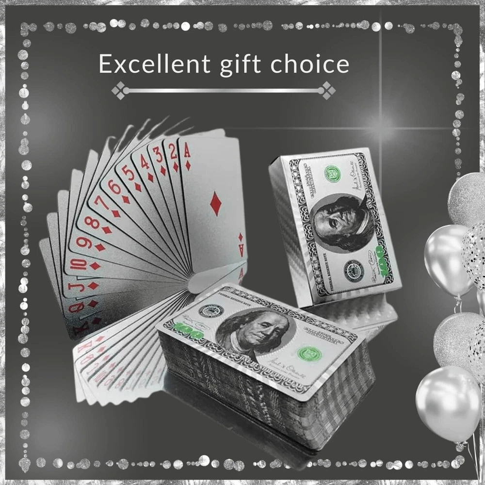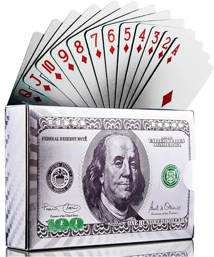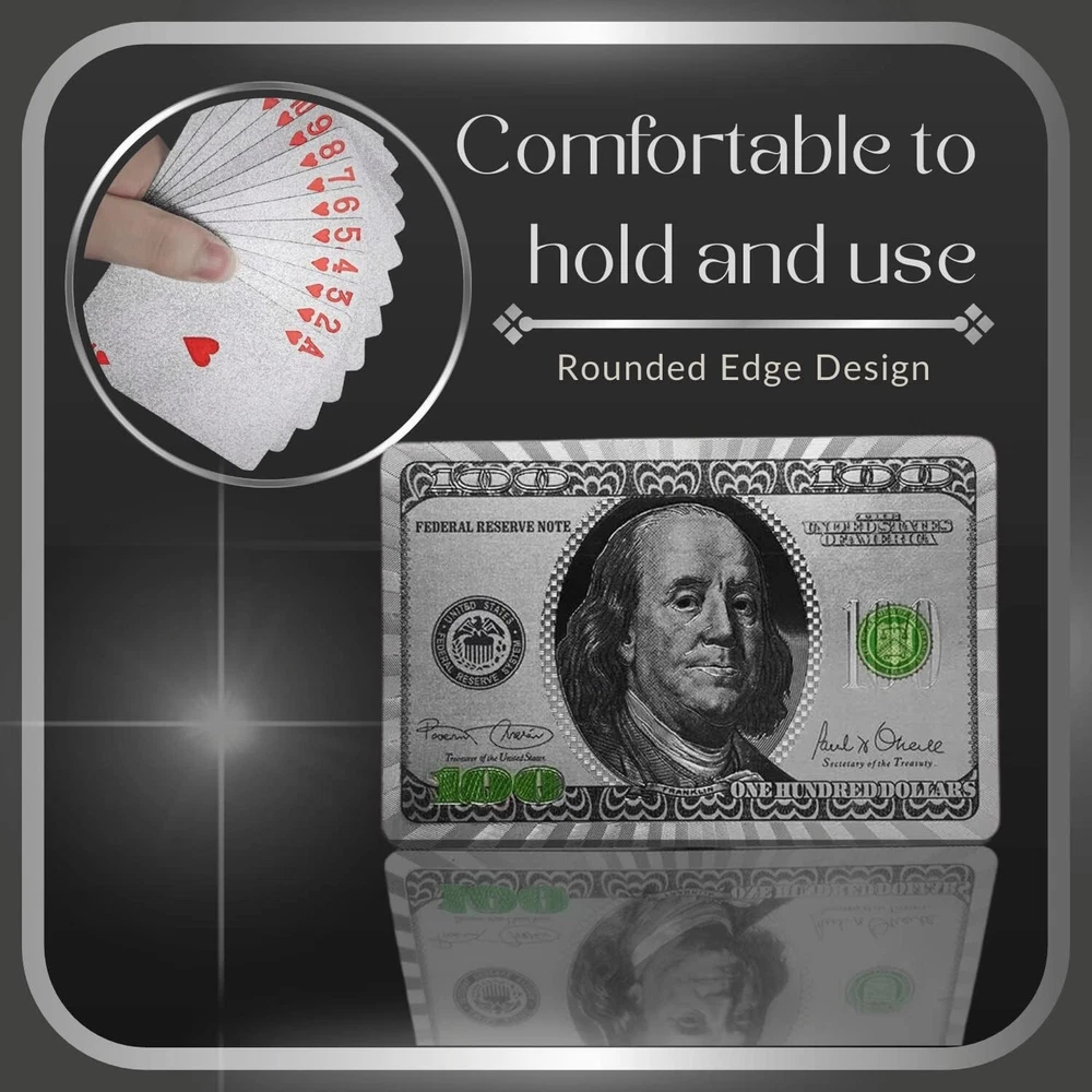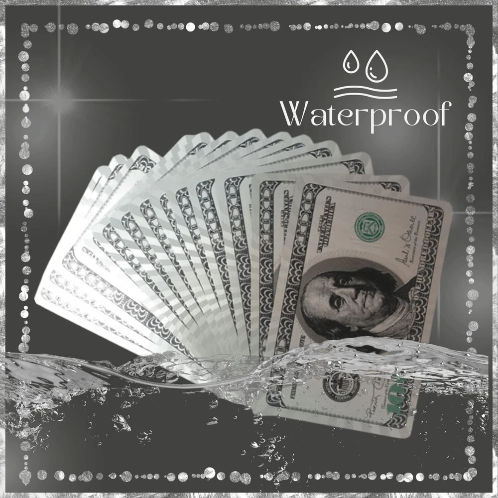 [WATERPROOF AND DURABLE] , Durable, Strong, scratch resistant, Waterproof and enjoy your favorite card games in the pool, by the beach,camping or while soaking in the tub. [Luxury Gold and Silver Foil] Poker Playing Cards, Use high-grade material with set of 52+2 cards. [High Quality] $100 Bill Gold and Silver Foil printed on the box and on the back of each card. [Easy to Shuffle] smooth feeling and excellent texture make cards be more comfortable.