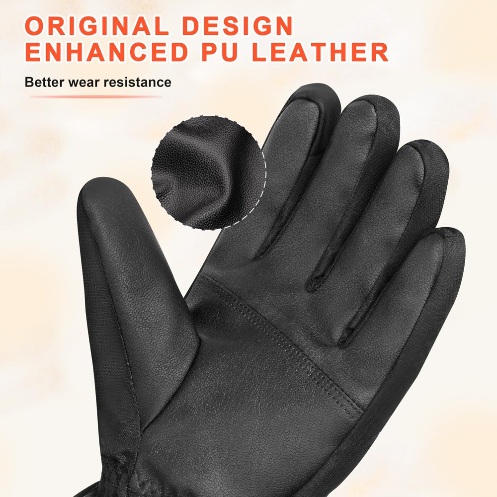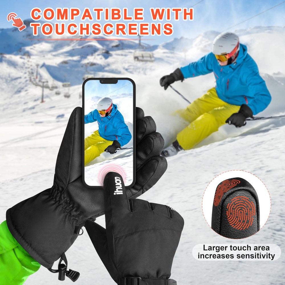 Waterproof ski gloves: These warm gloves feature a cozy fleece liner for added warmth in cold weather. They are also windproof and waterproof for optimal performance on snowy or rainy days. Take on the outdoors with confidence and stay comfortable on all your winter adventures with these reliable and versatile ski gloves. All Fingers touchscreen compatibility: Our thermal gloves offer touch screen functionality on all fingers, so you can use your phone or other touchscreen devices without taking off your tech gloves. Stay warm and connected during your outdoor adventures, whether you're texting a friend, taking photos, or using your phone, these gloves keep you in control while keeping your hands comfortable and protected. Non-slip palm for a secure grip: Enhance your snow sports experience with the non-slip PU leather palm of our gloves for exceptional traction and control. Whether you're skiing the slopes or enjoying other snow activities, this specially designed palm will help you maintain a secure and stable grip on your gear. Adjustable cuff and drawcord closure: Designed for optimal mobility and comfort, our gloves feature an adjustable wrist strap with a buckle and drawcord closure. This design effectively seals out cold air and snow while providing a secure fit for a variety of snow sports, including skiing, snowboarding, riding, and hiking. In addition, the gloves feature an anti-loss buckle to keep them securely in place during all your outdoor activities. Free return and refund policy: Not completely satisfied? No worries! We offer a free return and refund policy for any quality or size issues.