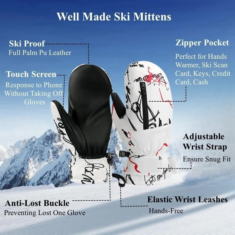 GLOVES INSIDE MITTENS : This is a pair of 2024 new design ski mittens, exactly speaking, ski gloves inside mittens, the inside lining of the mitten is glove shaped, it has slots for fingers, they way each finger is separated inside the mittens prevents sweaty hands. They definitely keep your hands warm and dry and at the same time are not bulky; WATERPROOF BREATHABLE : The ski mittens design with thermal insulation, super warm for extremly cold weather. The soft inside lining of the gloves provide more warmth, great moisture permeability and breathability, it shut out th water or sweat go out, keep hands warm and dry all day. The outer fabric made of water resistant cloth with the built in seamless waterproof bag, so the ski gloves has excellent waterproof and windproof properties; SKIDPROOF WEAR-RESISTANT : The ski mittens made with full palm PU leather, good wear resistance, long lasting for several ski seasons. Safe and non slip when holding ski poles, snow shovels, ice scraper. Thumb of the mitten touch screen compatibility is great plus for ski mittens, it will allow to response to your smart phone, smart watch and other smart device without taking off gloves in cold winter; PERFECT DETAILS : The elastic wrist leashes to be very convenient when you frequently had to take ski gloves off to help with various things. Anti-Lost Buckle save you from worrying about losing one glove. Zipper Pocket is perfect for storage hand warmers, scan pass card, keys, credit card, cashes, tickets and other cards. Really a well made ski gloves for winter. Take it and start your skiing trip now; SKI TRIP ESSENTIALS : This winter ski gloves has only one size, priority recommend for adult women and youth, we add adjustable wrist strap and elastic wrist band to ensure snug fit. Also suitable for men with small hand. The ski mittens with inside glove liners are perfect for snow trip, skiing, snowboarding, snowmobiling, snow shoveling, ice scraping, snowy hike, dog walking, cycling, driving, running, hiking, motorcycling, ice climbing, bike riding, golf, walking the pets;